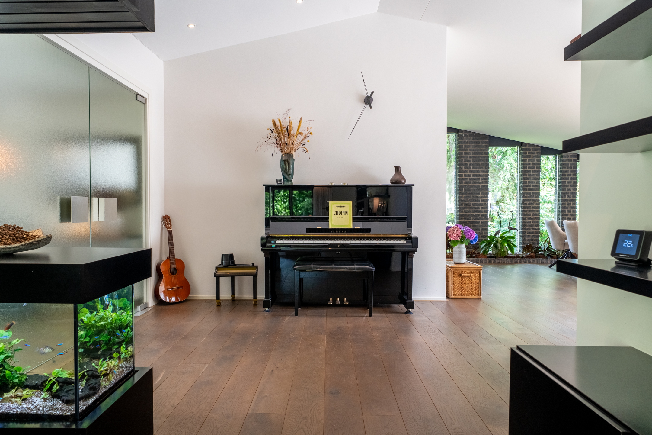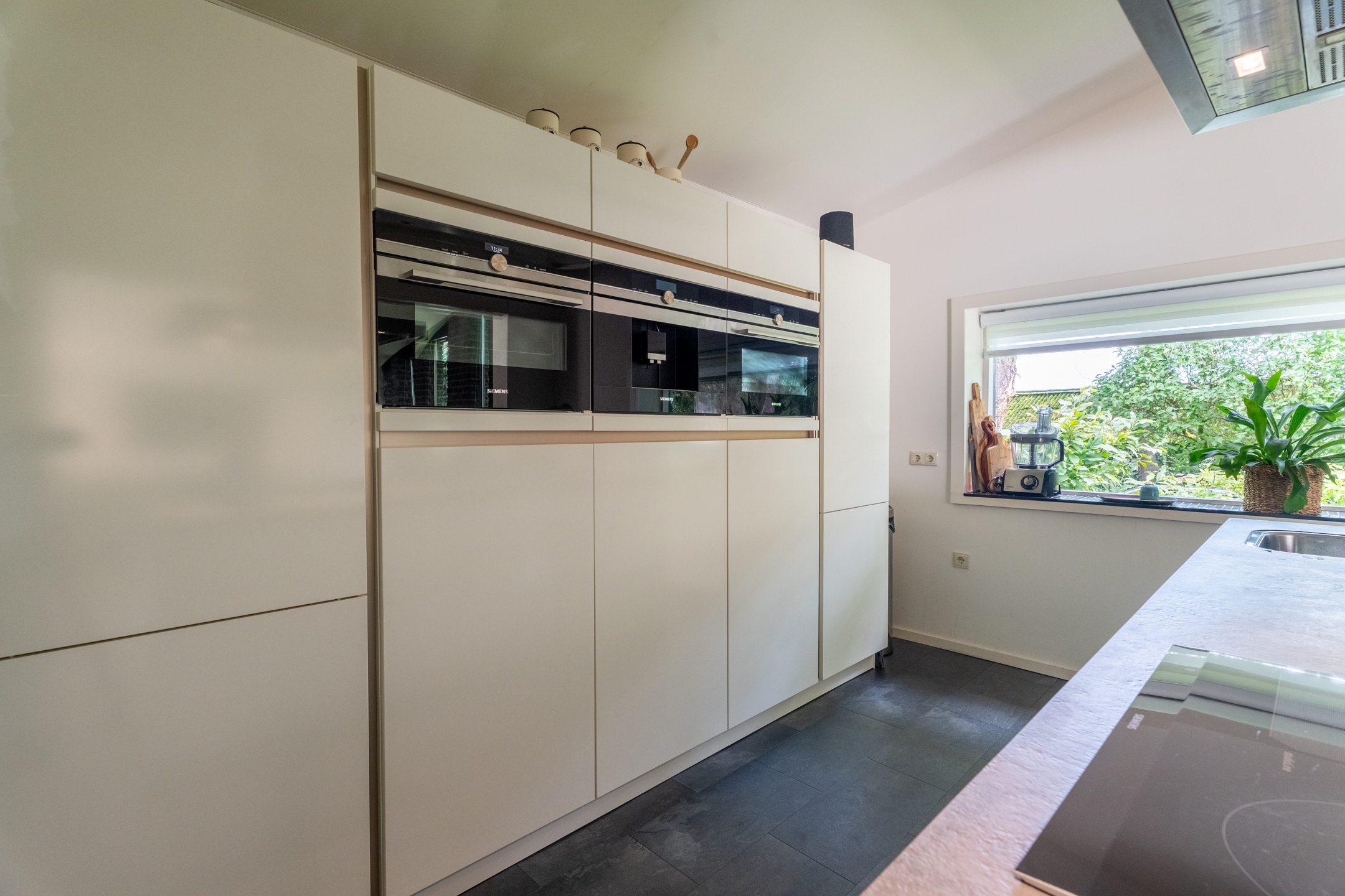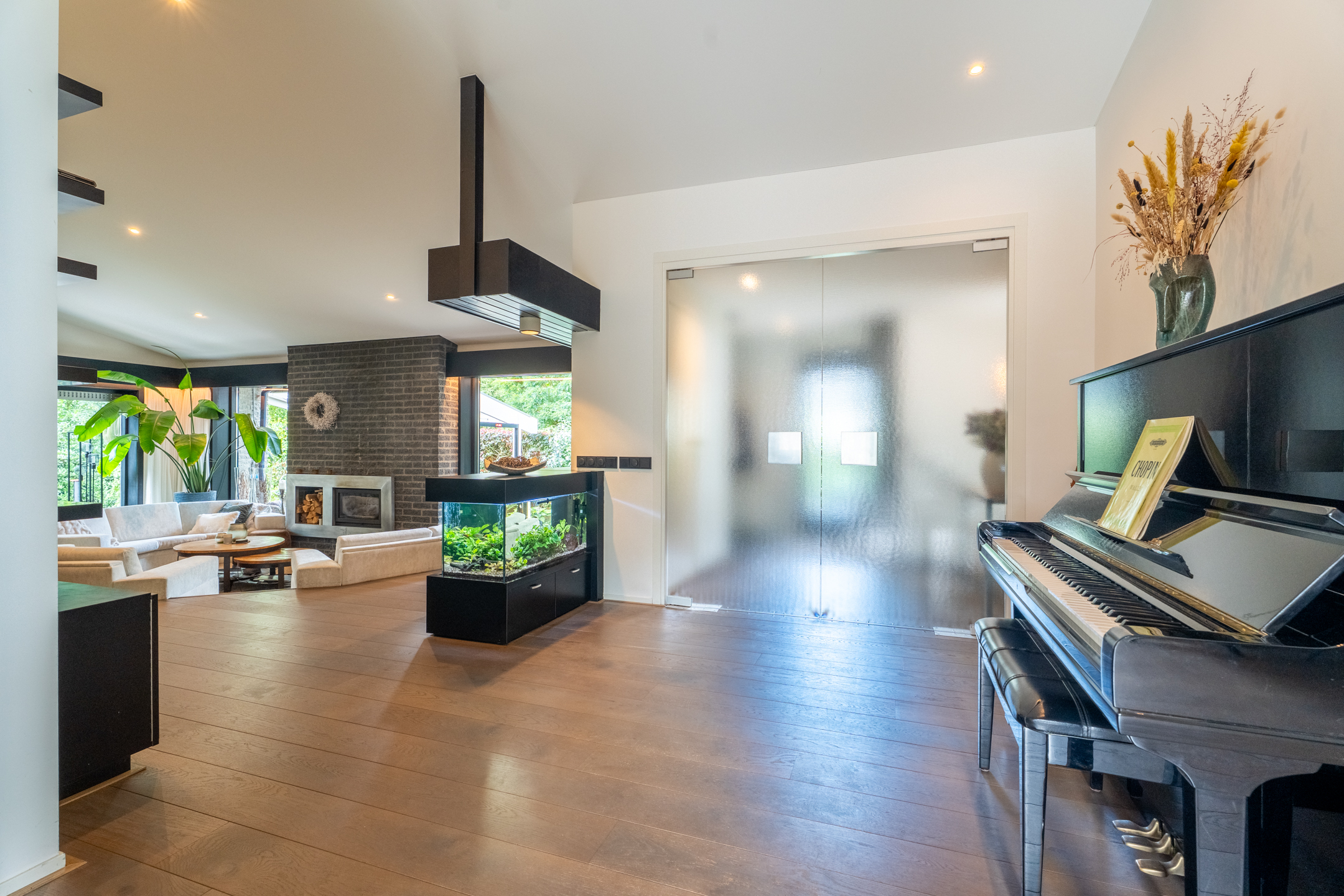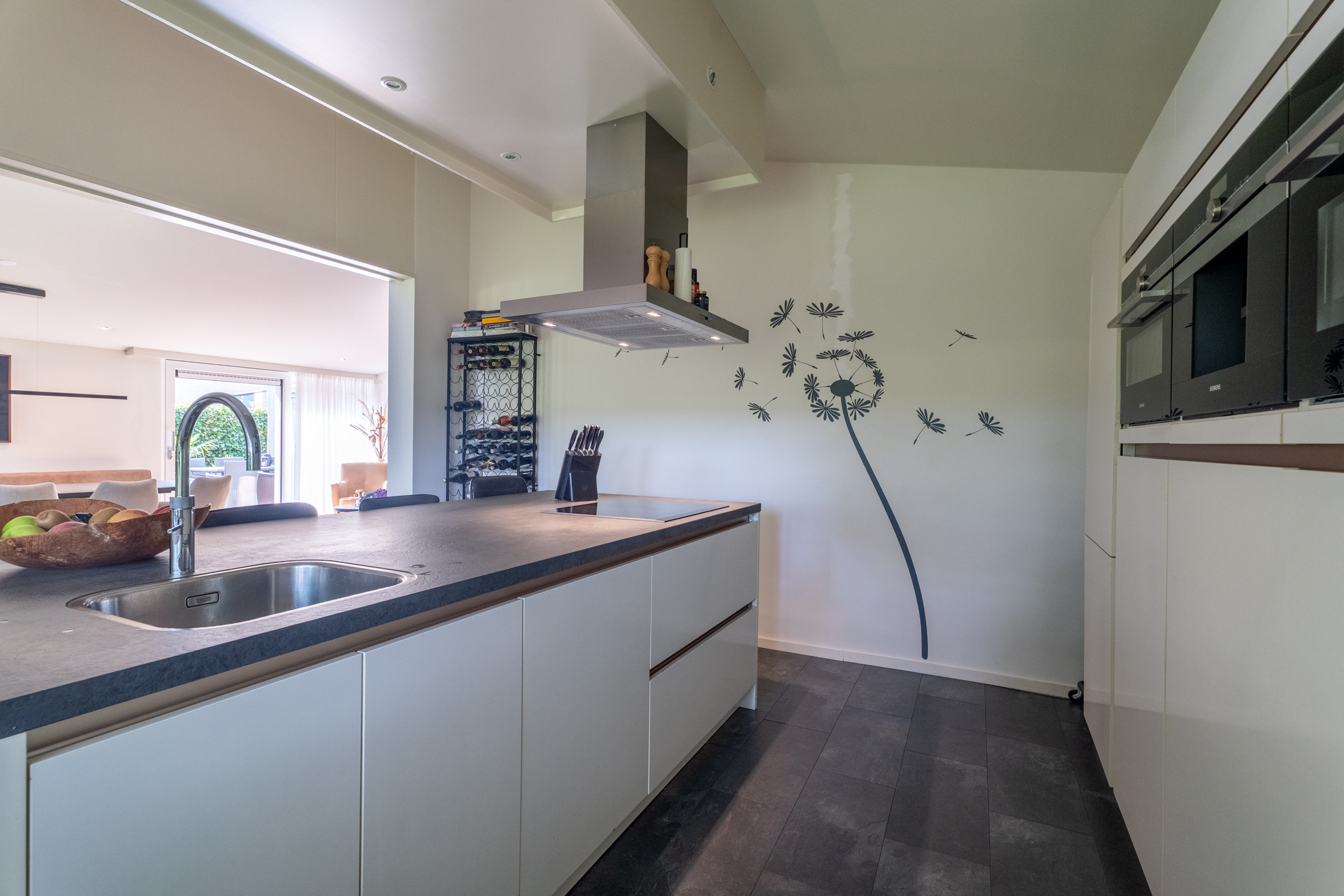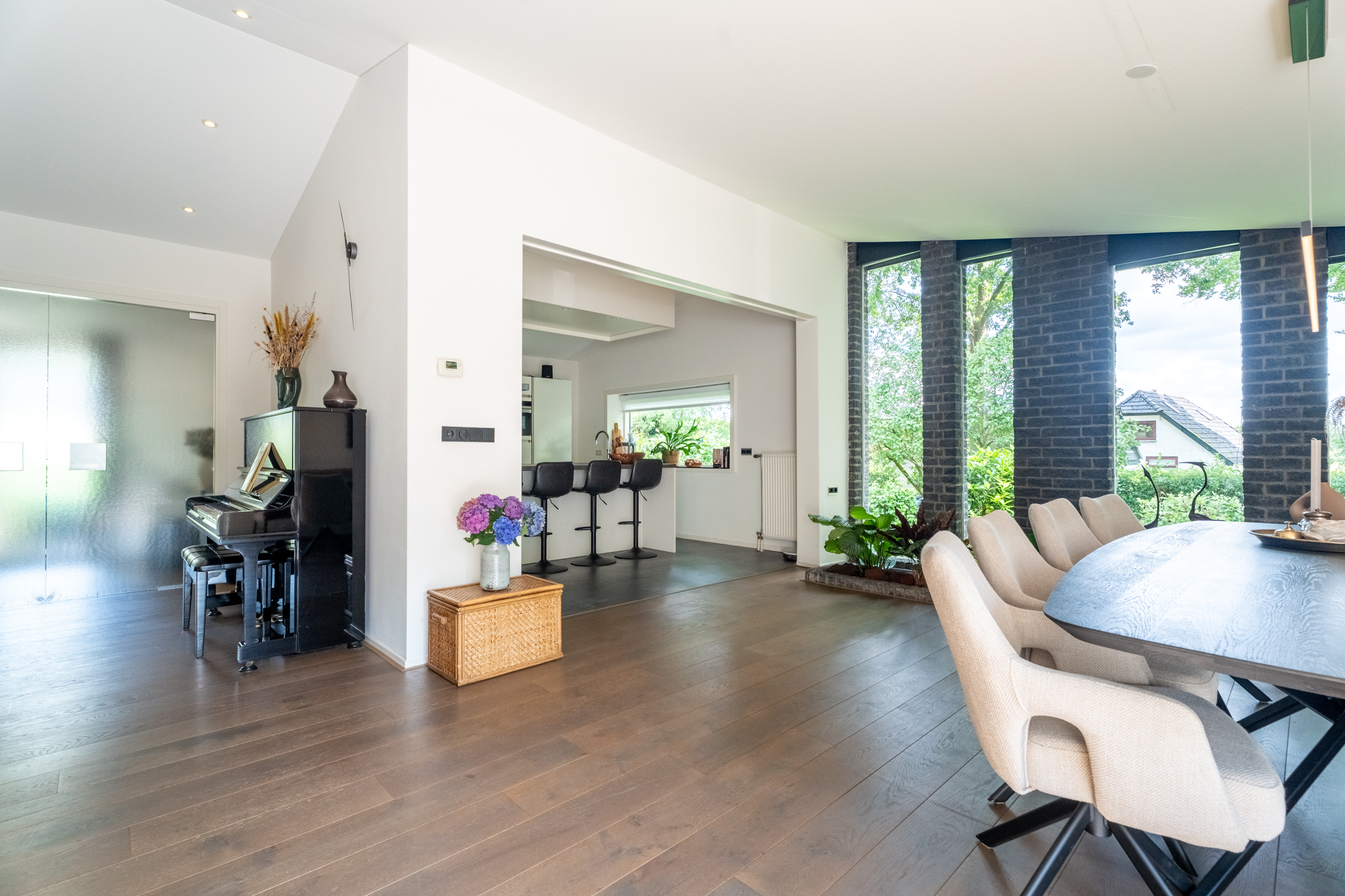 De woonkamer is een sfeervol geheel, met als blikvanger de gezellige zitkuil rondom de houtkachel. Grote raampartijen aan meerdere zijden zorgen voor overvloedig daglicht en een prachtig uitzicht op het groen rondom de woning. Het eetgedeelte sluit aan op de luxe keuken, uitgevoerd in een warme kleurstelling en voorzien van hoogwaardige inbouwapparatuur. Dankzij de vernieuwde schuifpui betrekt u op zomerse dagen eenvoudig het royale terras bij het woongedeelte.
