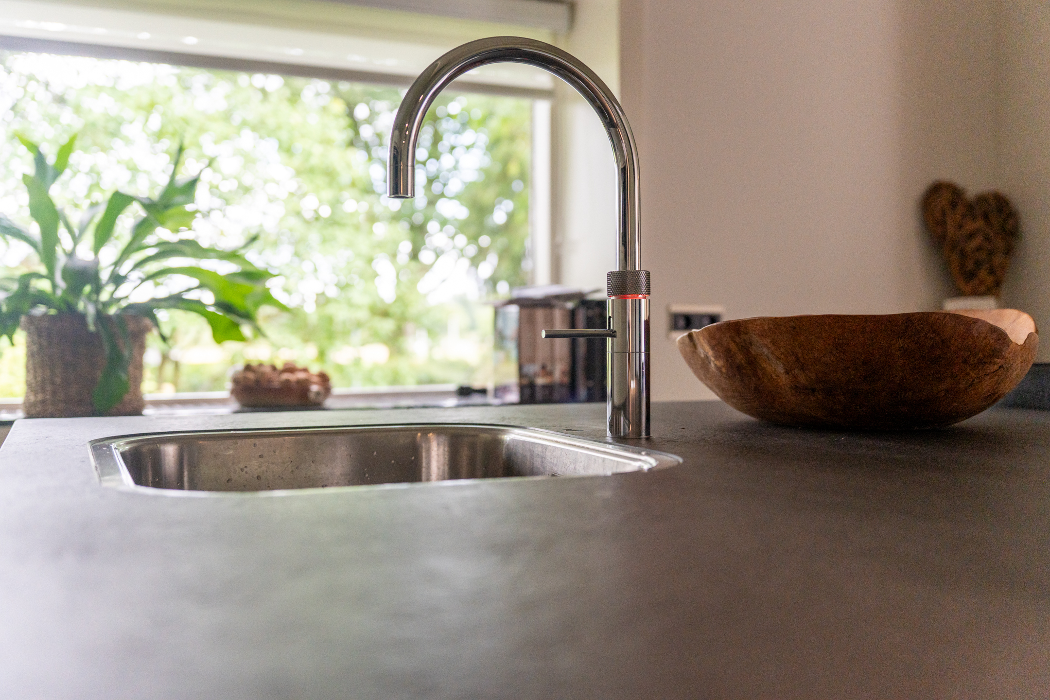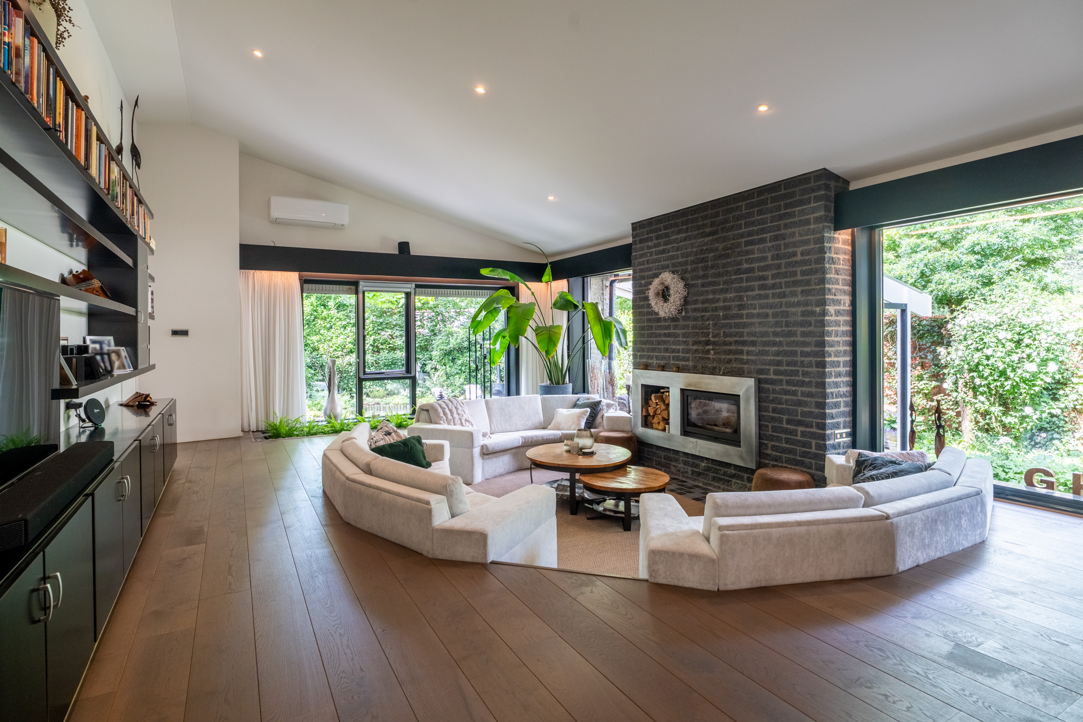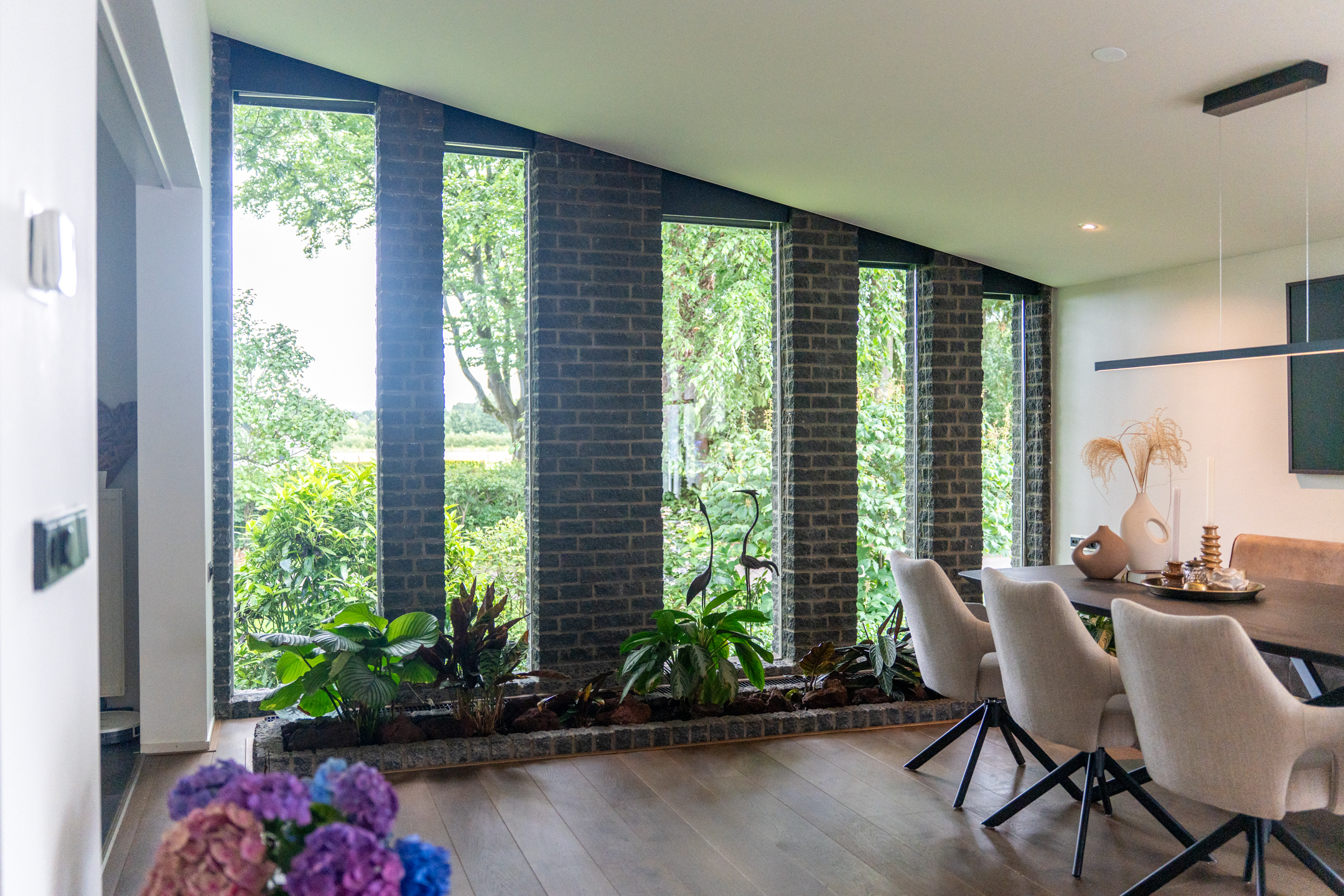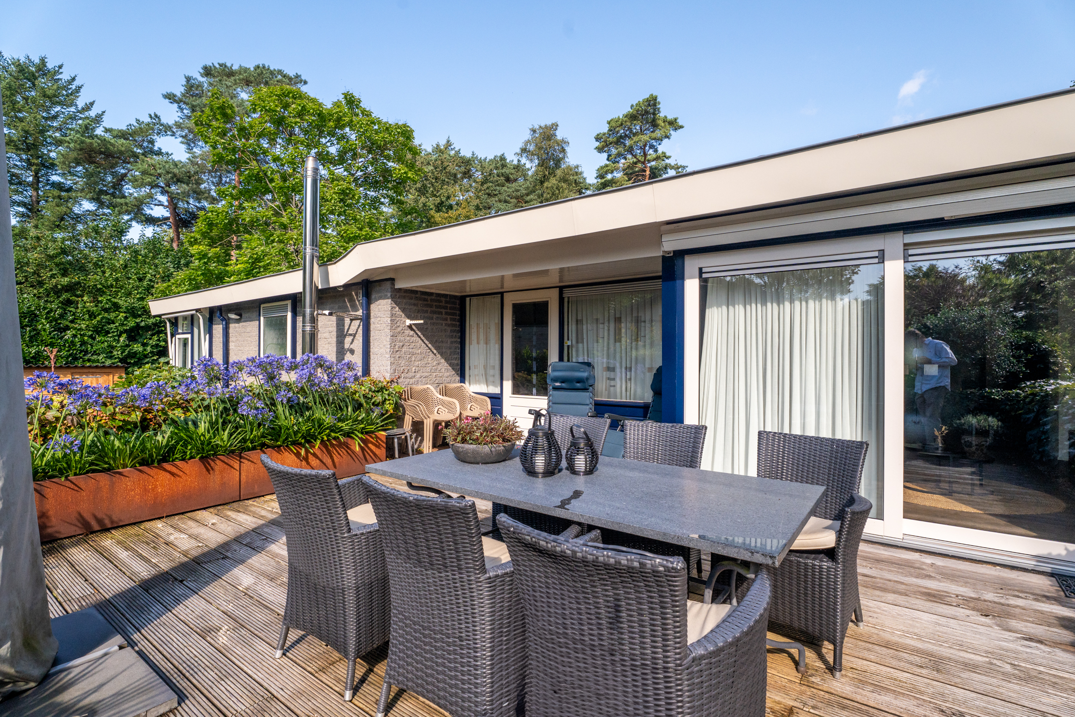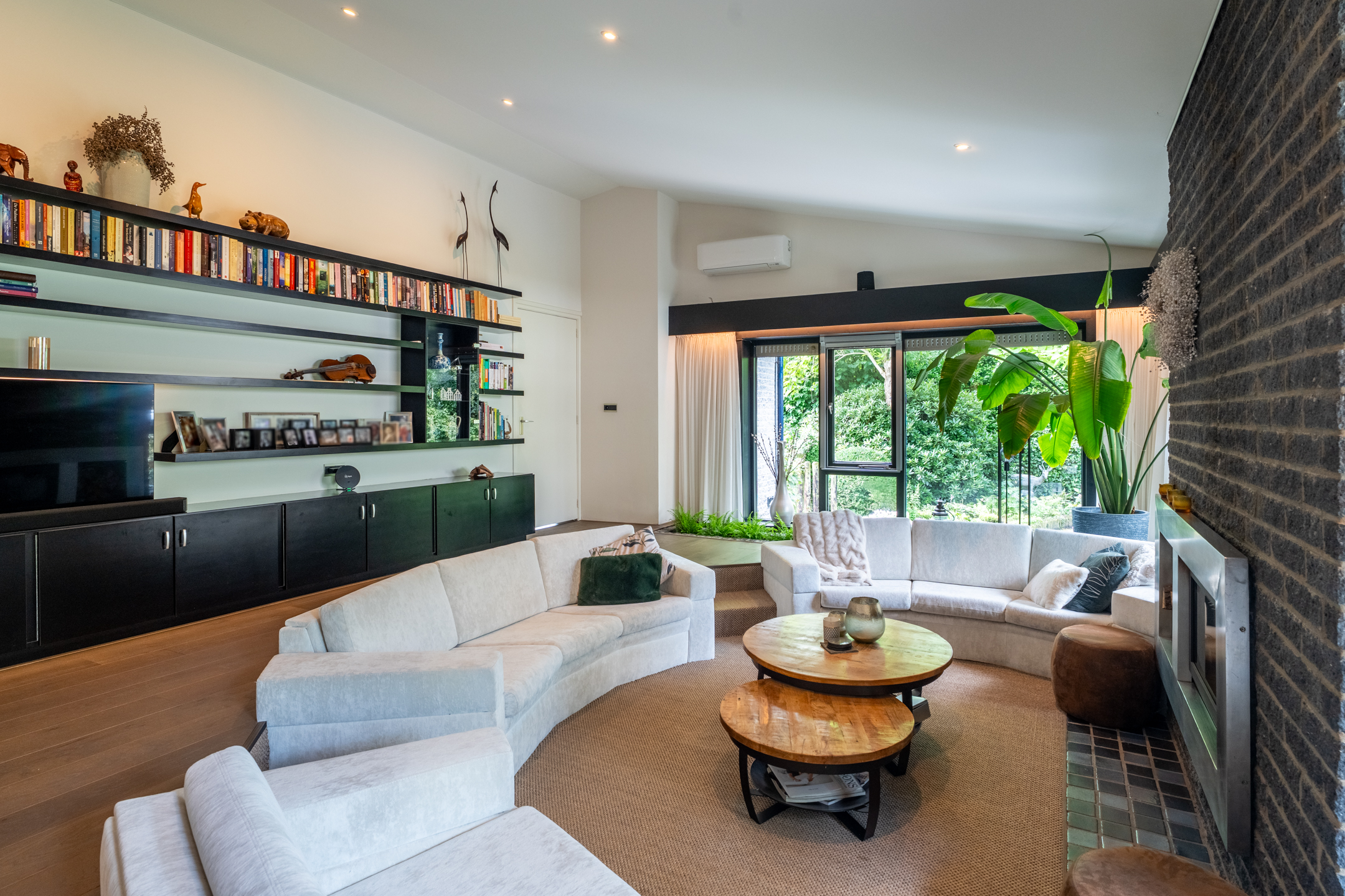 De woonkamer is een sfeervol geheel, met als blikvanger de gezellige zitkuil rondom de houtkachel. Grote raampartijen aan meerdere zijden zorgen voor overvloedig daglicht en een prachtig uitzicht op het groen rondom de woning. Het eetgedeelte sluit aan op de luxe keuken, uitgevoerd in een warme kleurstelling en voorzien van hoogwaardige inbouwapparatuur. Dankzij de vernieuwde schuifpui betrekt u op zomerse dagen eenvoudig het royale terras bij het woongedeelte.