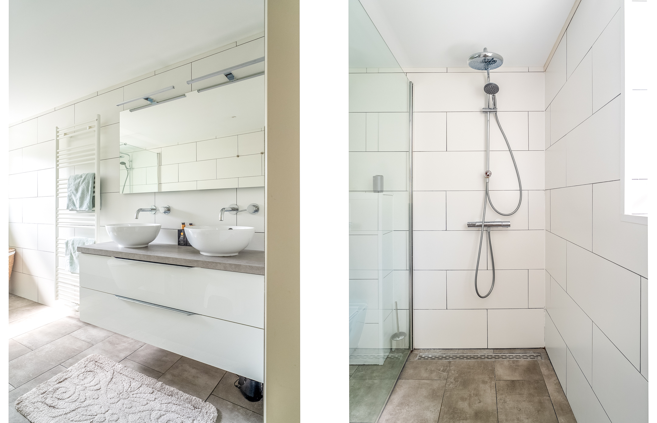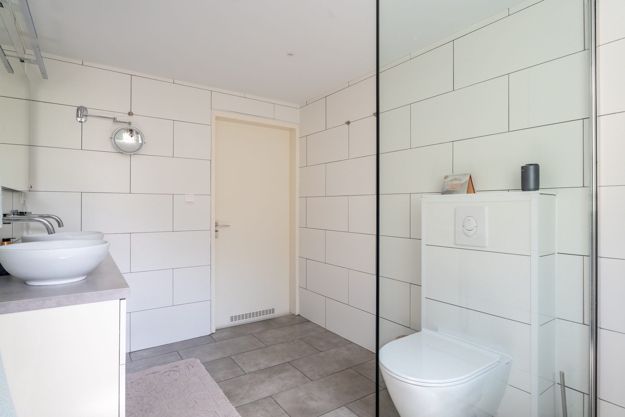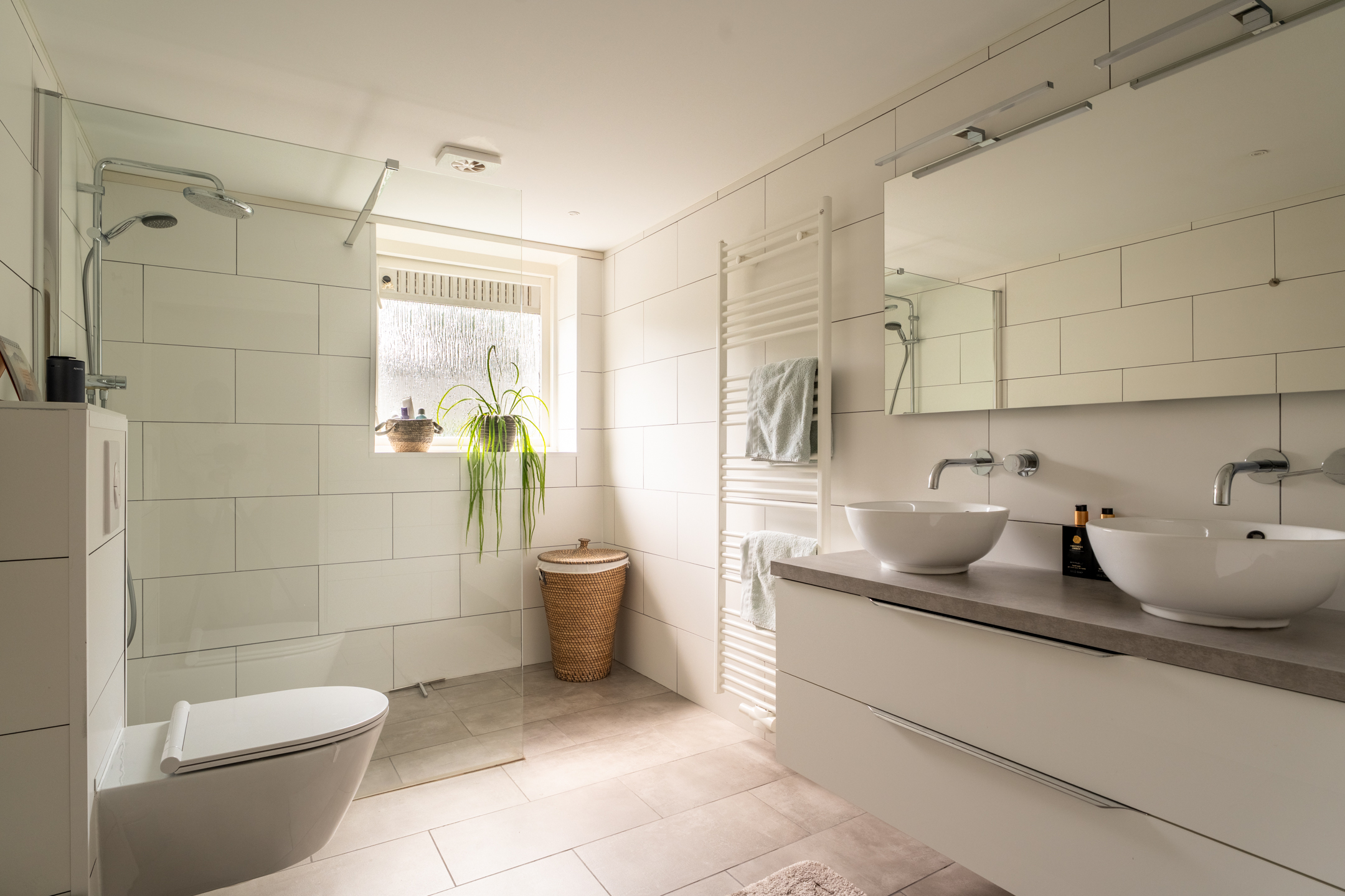 De badkamer is voorzien van een inloopdouche, breed wastafelmeubel met dubbele kranen en een toilet. Alles uitgevoerd in hoogwaardige materialen en een stijlvolle kleurstelling.