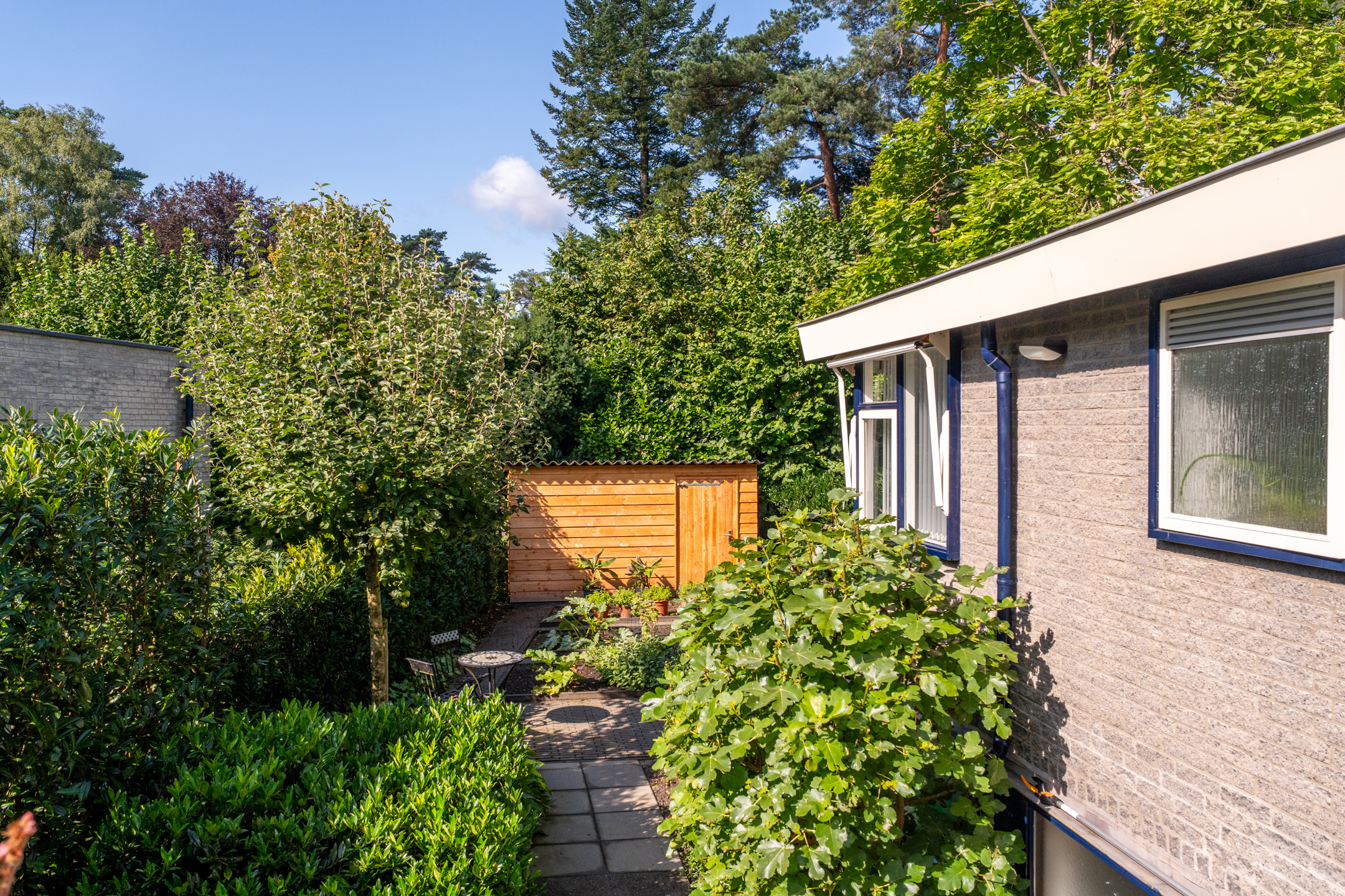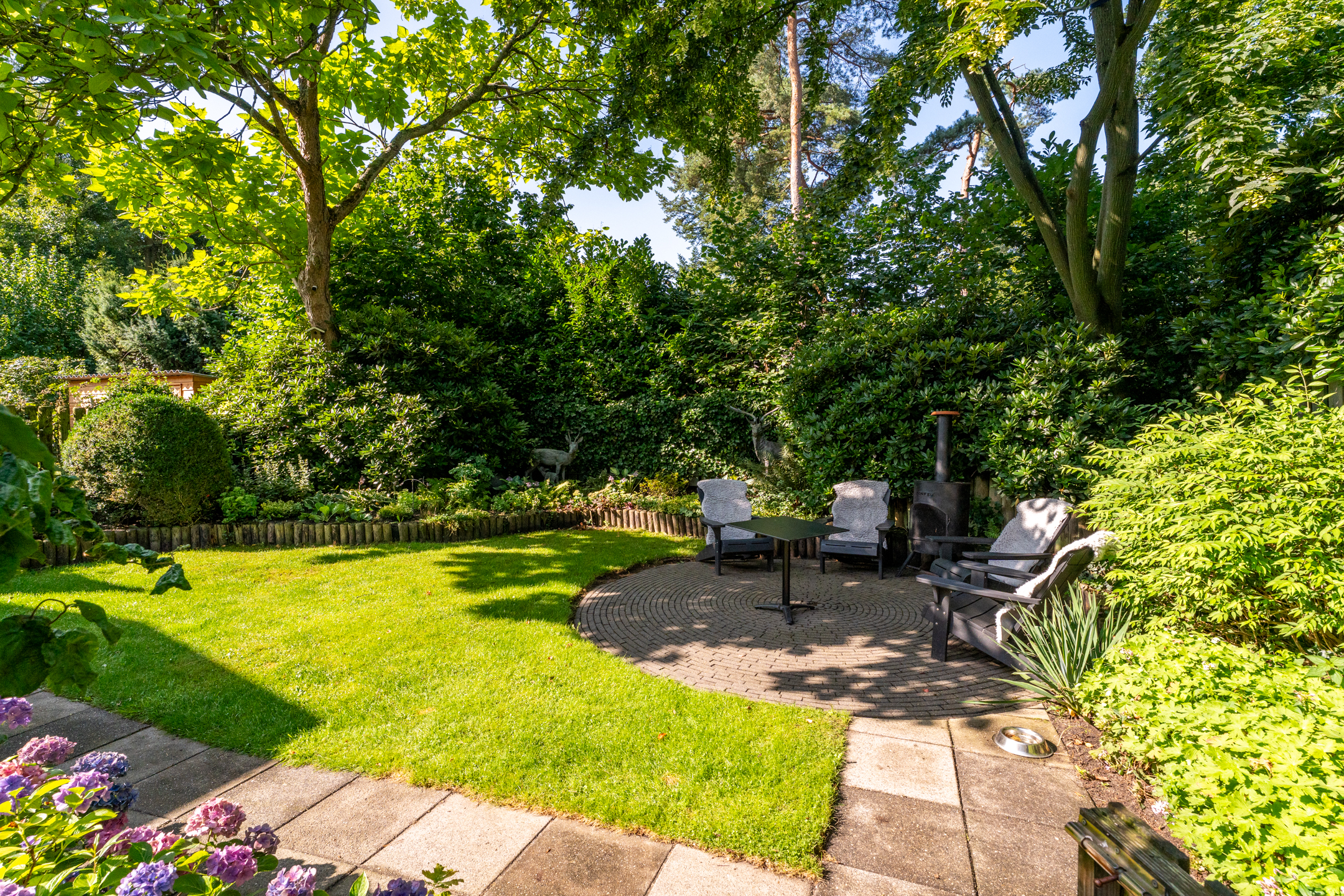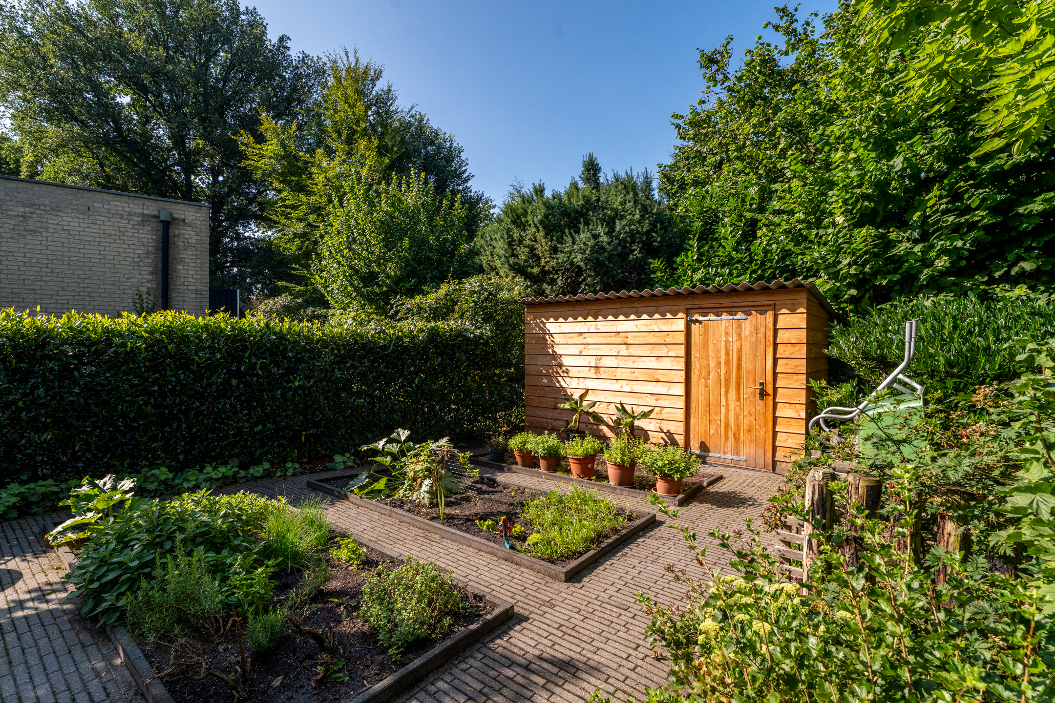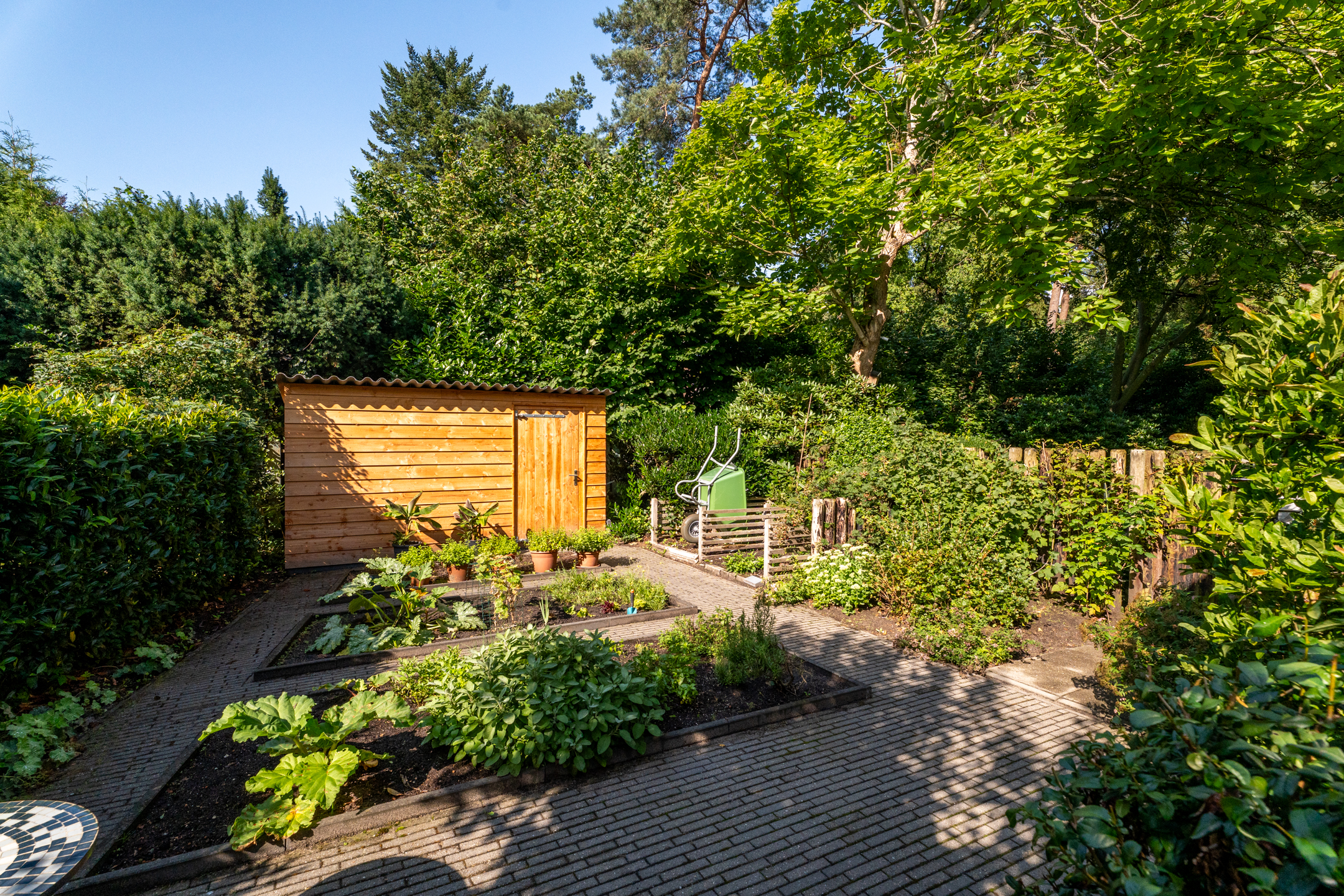 De rondom gelegen tuin is prachtig aangelegd en biedt op elk moment van de dag een fijne plek. Meerdere terrassen zorgen ervoor dat u altijd een keuze heeft tussen zon en schaduw. De hoogteverschillen en het speelse lijnenspel van het gazon, de borders en de beplanting geven de tuin karakter. En terwijl u buiten zit, hoort u enkel het ruisen van de bomen en het gezang van vogels. In de tuin is een houten berging geplaatst voor het opbergen van het tuingereedschap.