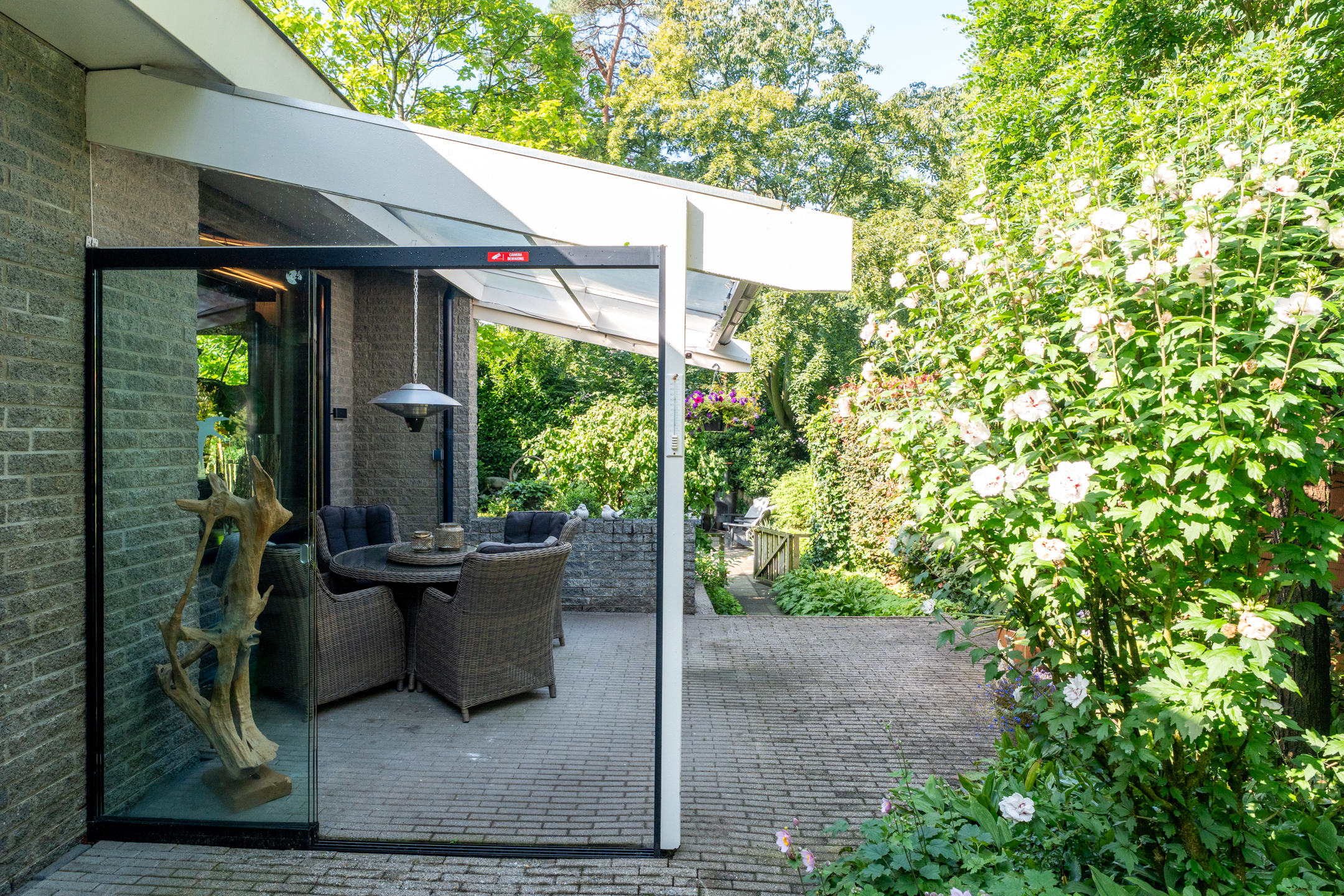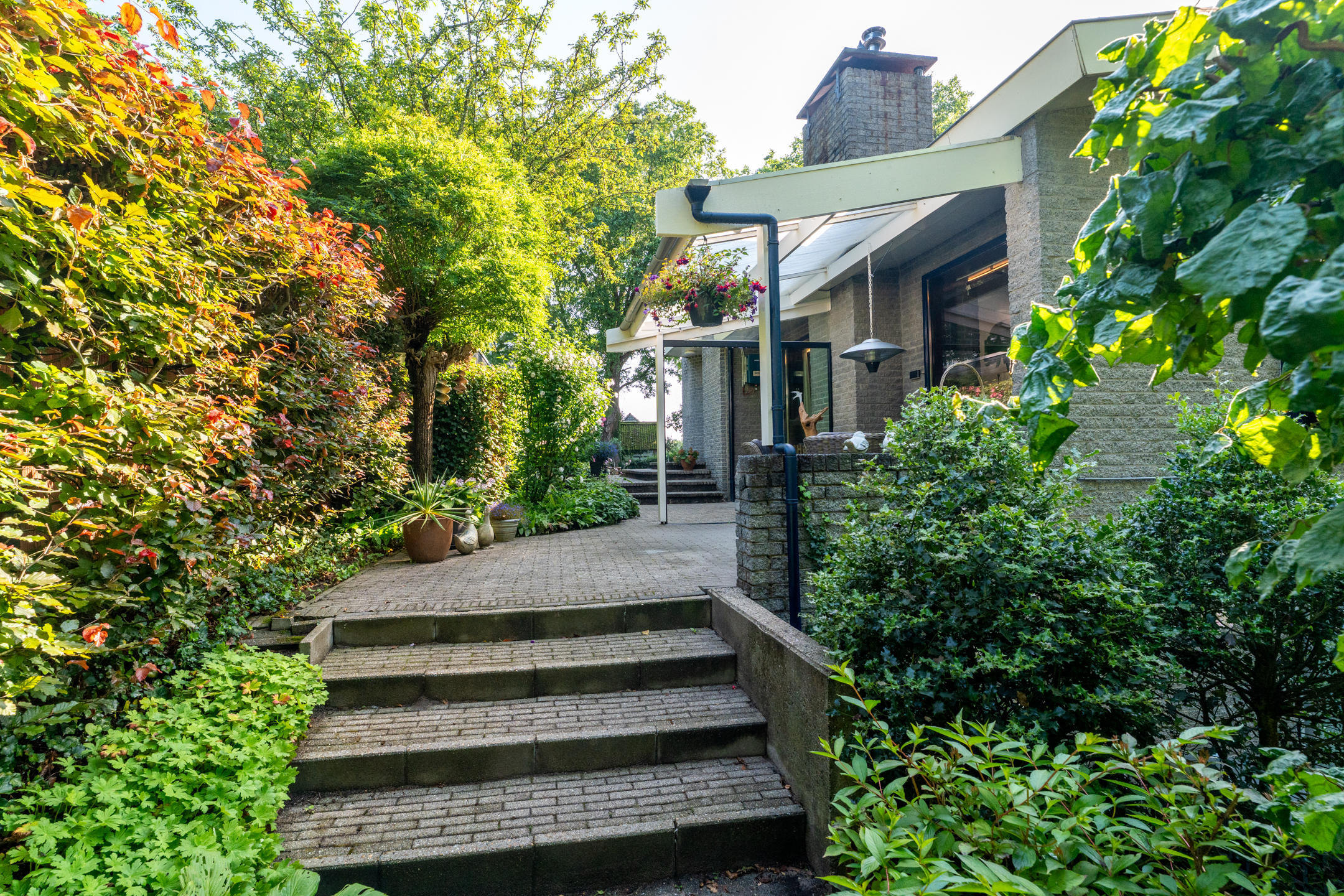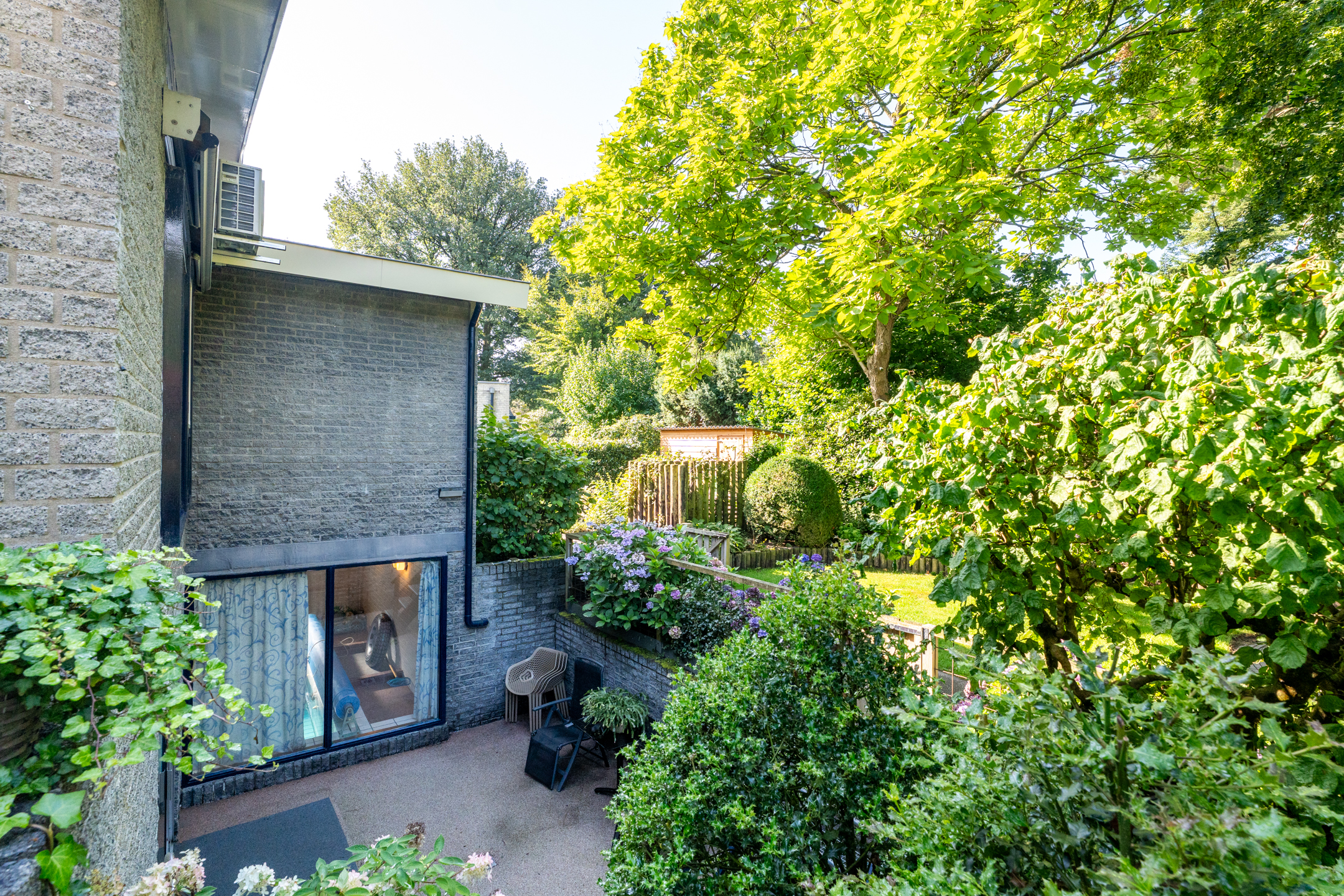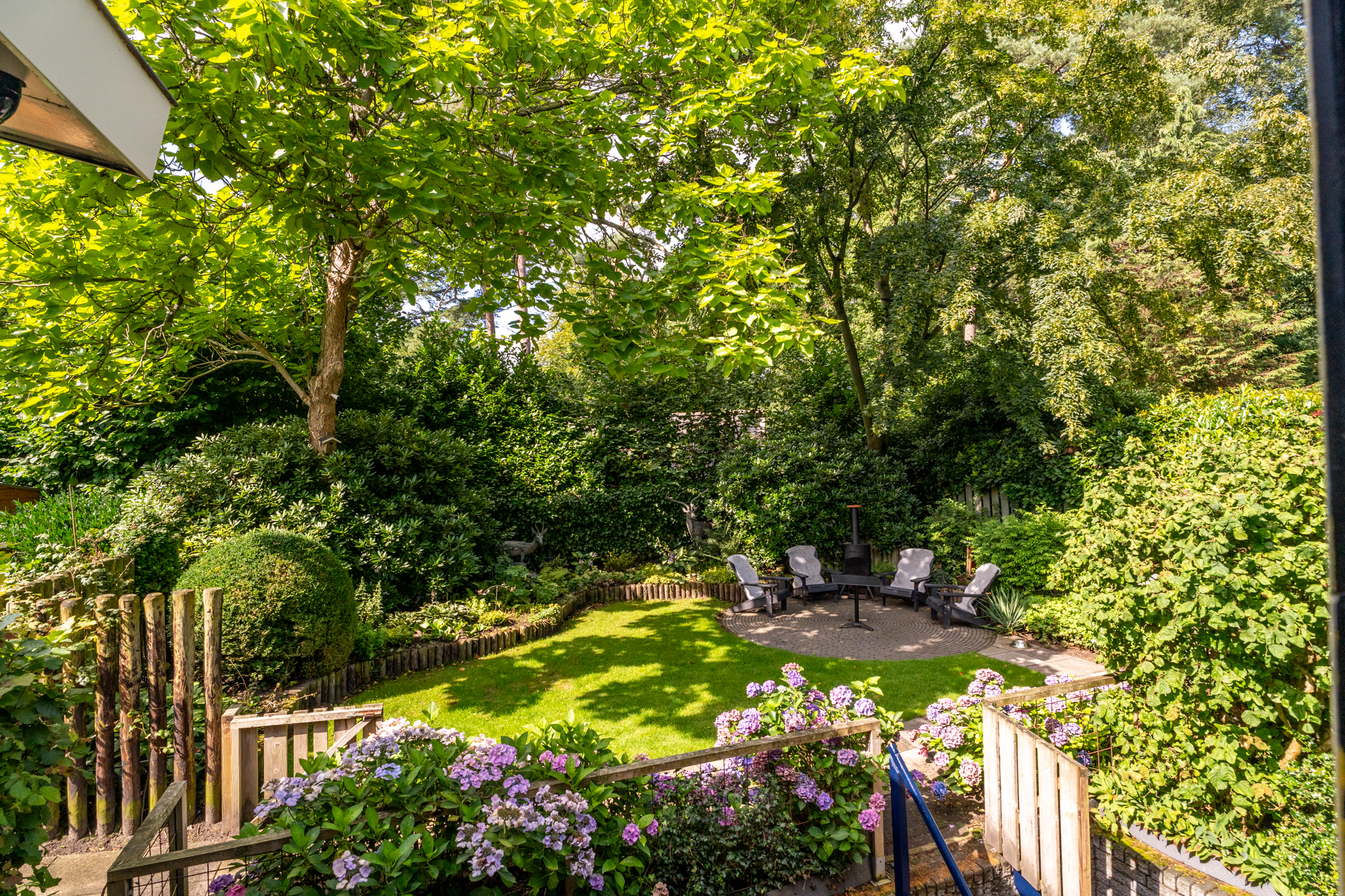 De rondom gelegen tuin is prachtig aangelegd en biedt op elk moment van de dag een fijne plek. Meerdere terrassen zorgen ervoor dat u altijd een keuze heeft tussen zon en schaduw. De hoogteverschillen en het speelse lijnenspel van het gazon, de borders en de beplanting geven de tuin karakter. En terwijl u buiten zit, hoort u enkel het ruisen van de bomen en het gezang van vogels. In de tuin is een houten berging geplaatst voor het opbergen van het tuingereedschap.