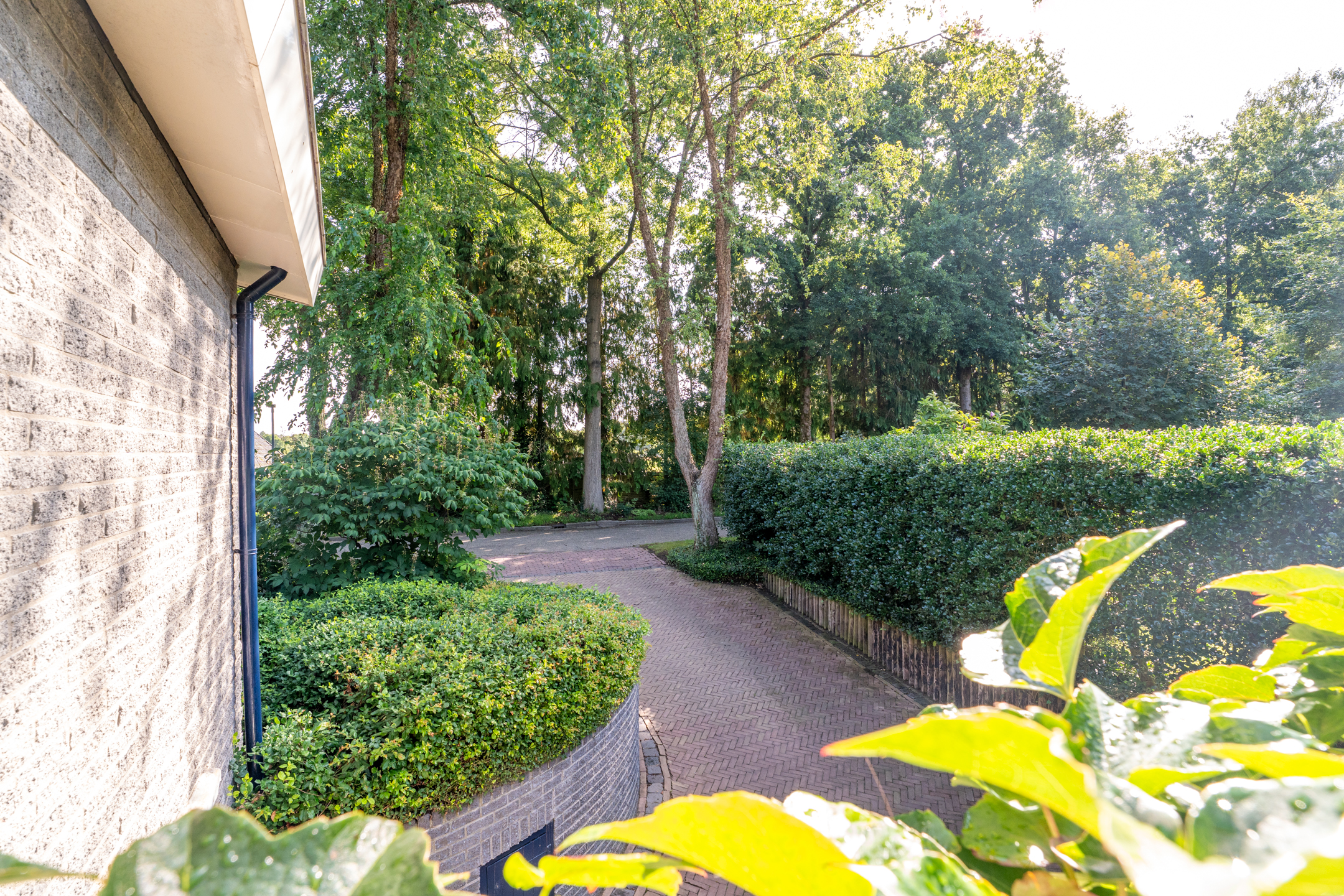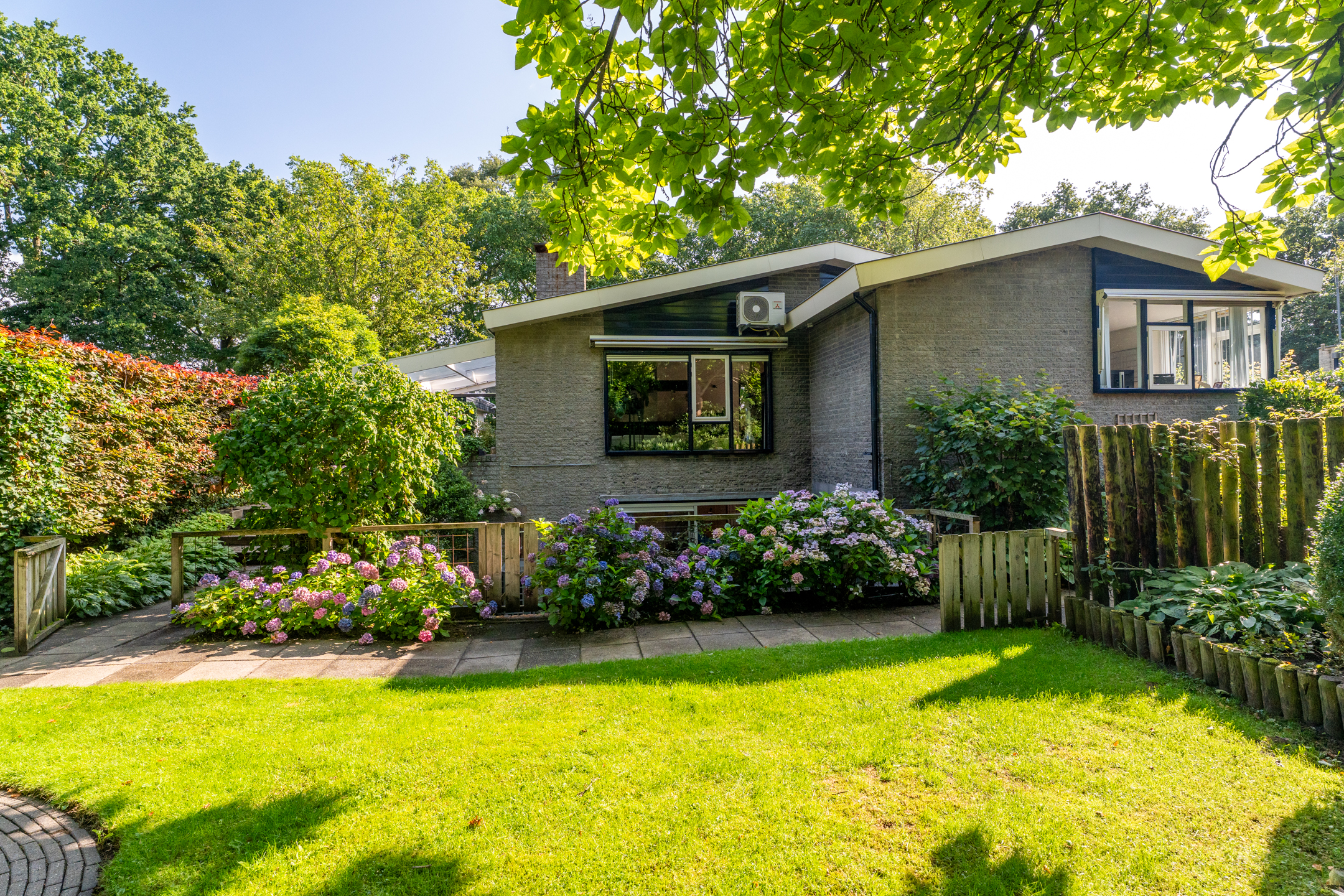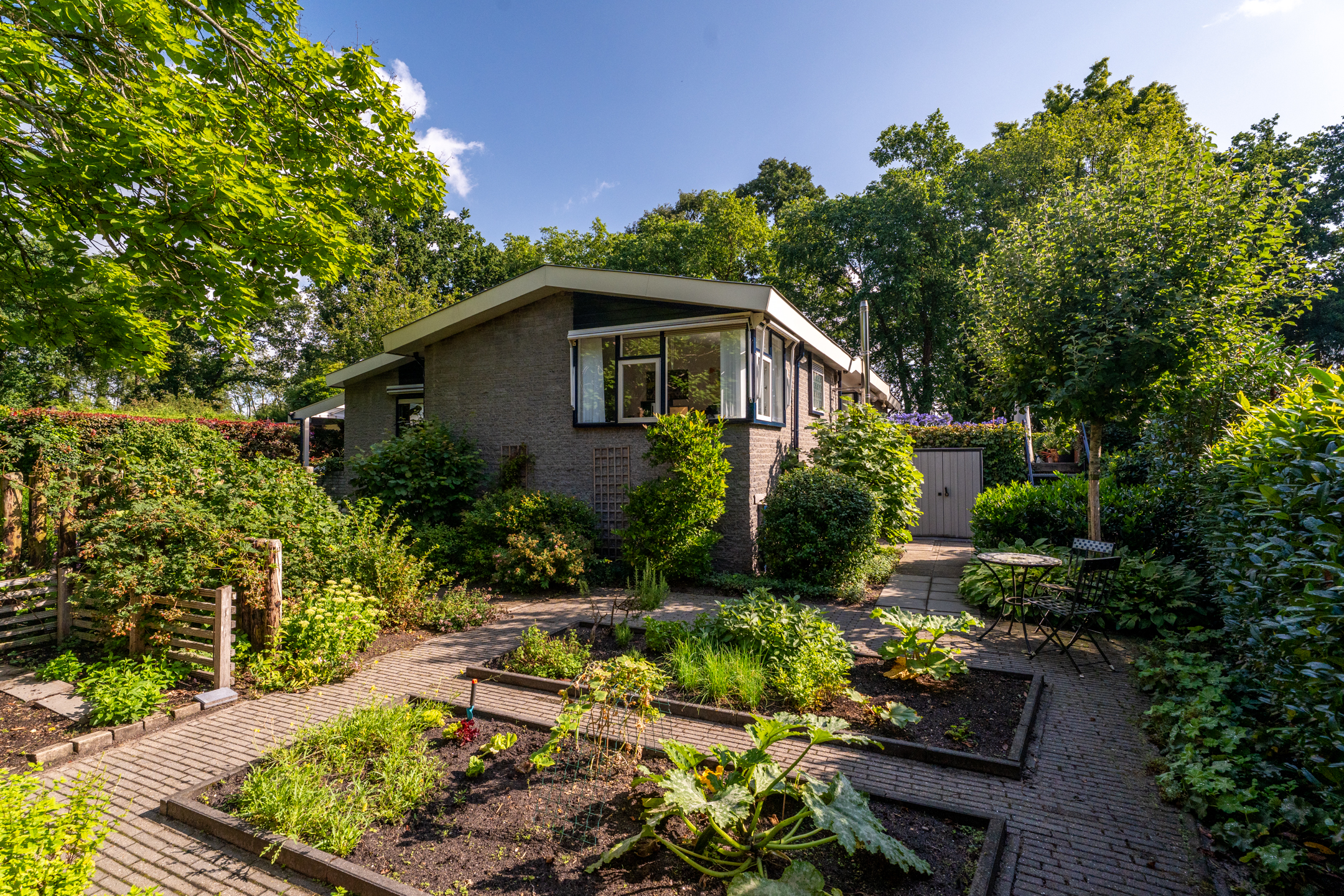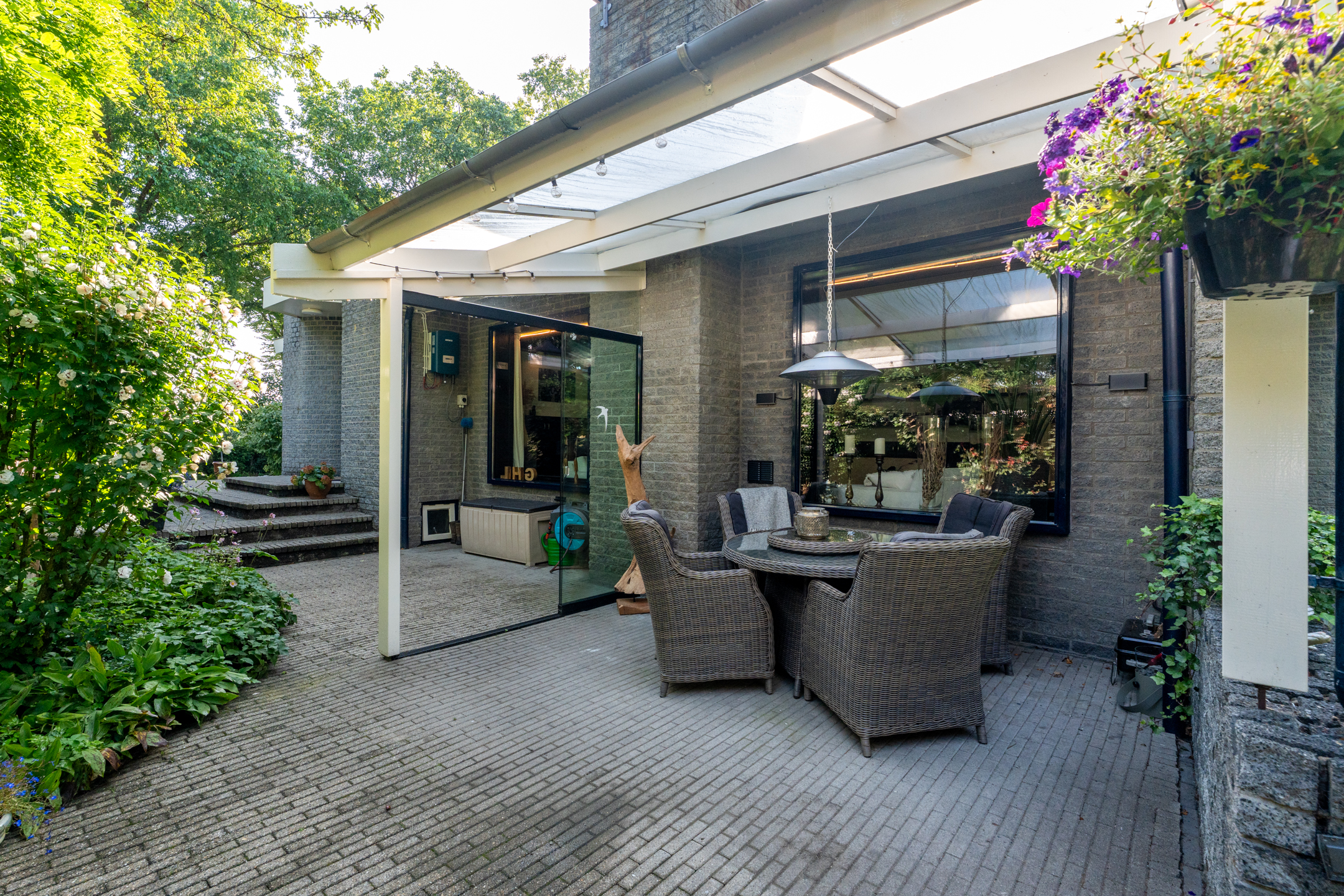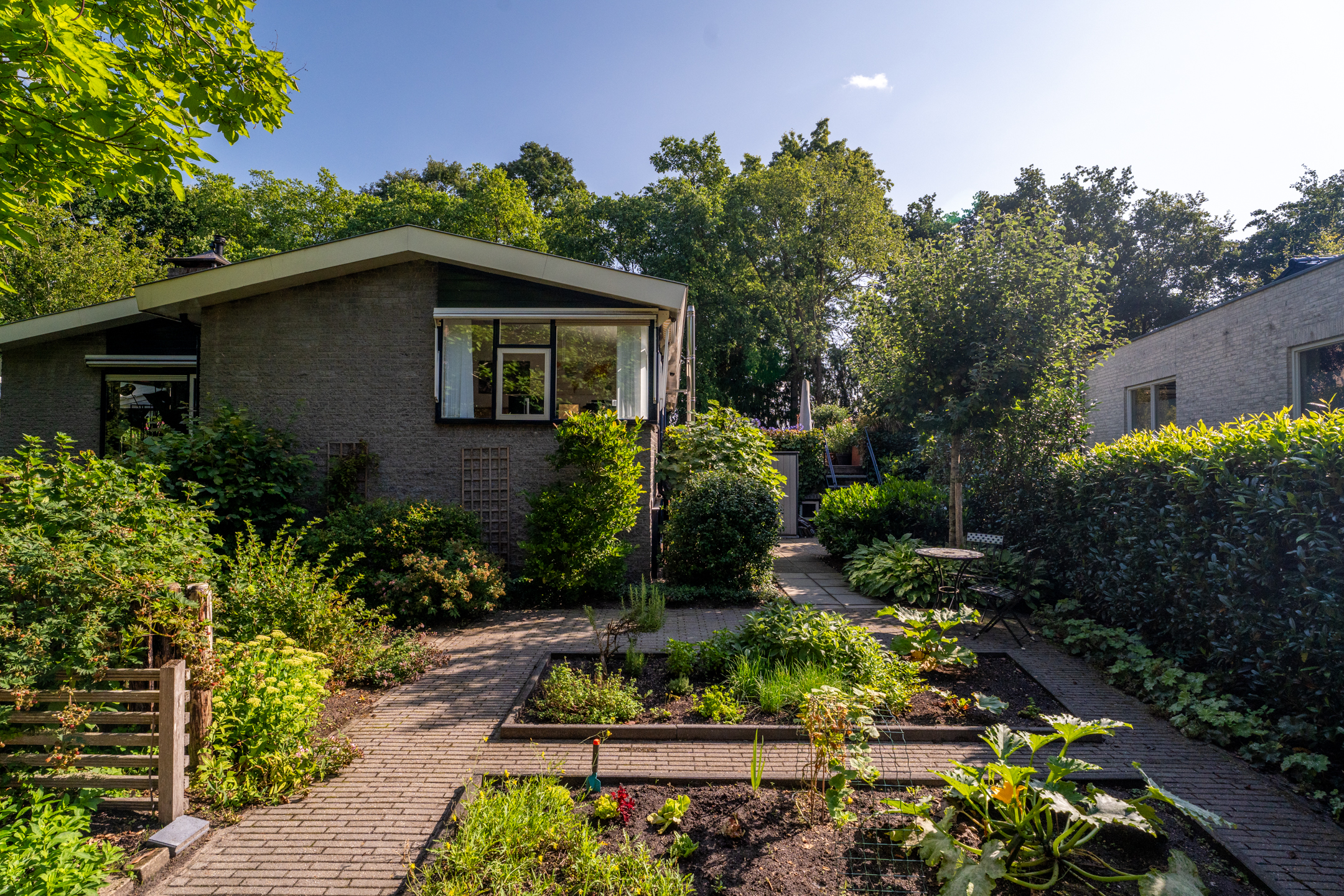 De rondom gelegen tuin is prachtig aangelegd en biedt op elk moment van de dag een fijne plek. Meerdere terrassen zorgen ervoor dat u altijd een keuze heeft tussen zon en schaduw. De hoogteverschillen en het speelse lijnenspel van het gazon, de borders en de beplanting geven de tuin karakter. En terwijl u buiten zit, hoort u enkel het ruisen van de bomen en het gezang van vogels. In de tuin is een houten berging geplaatst voor het opbergen van het tuingereedschap.