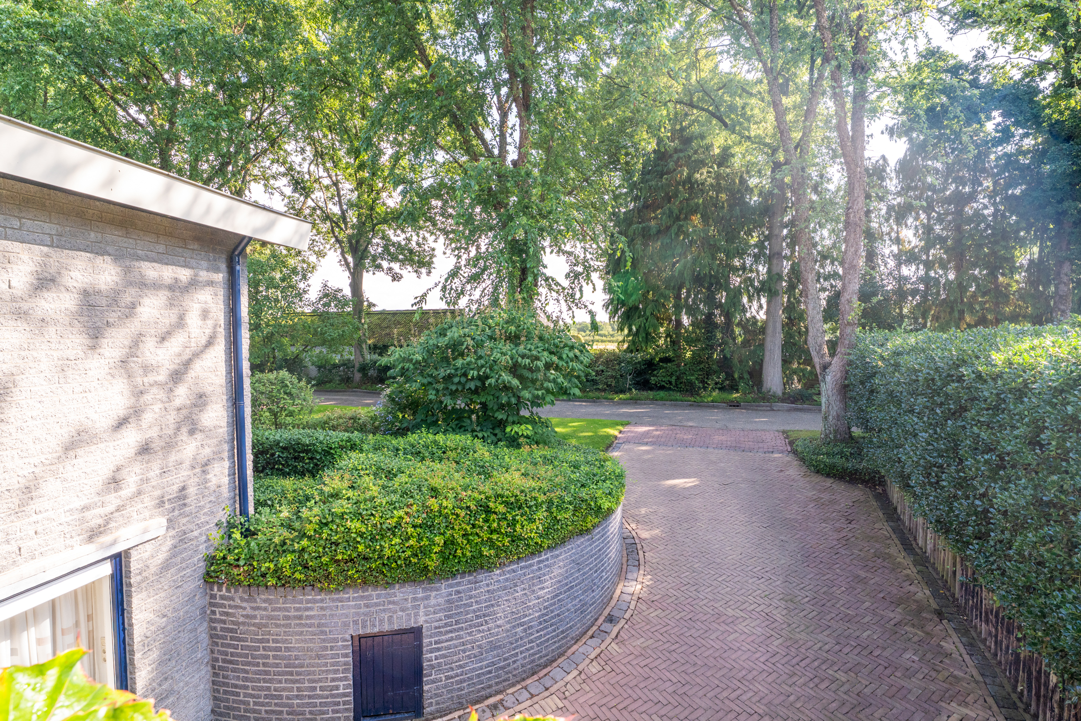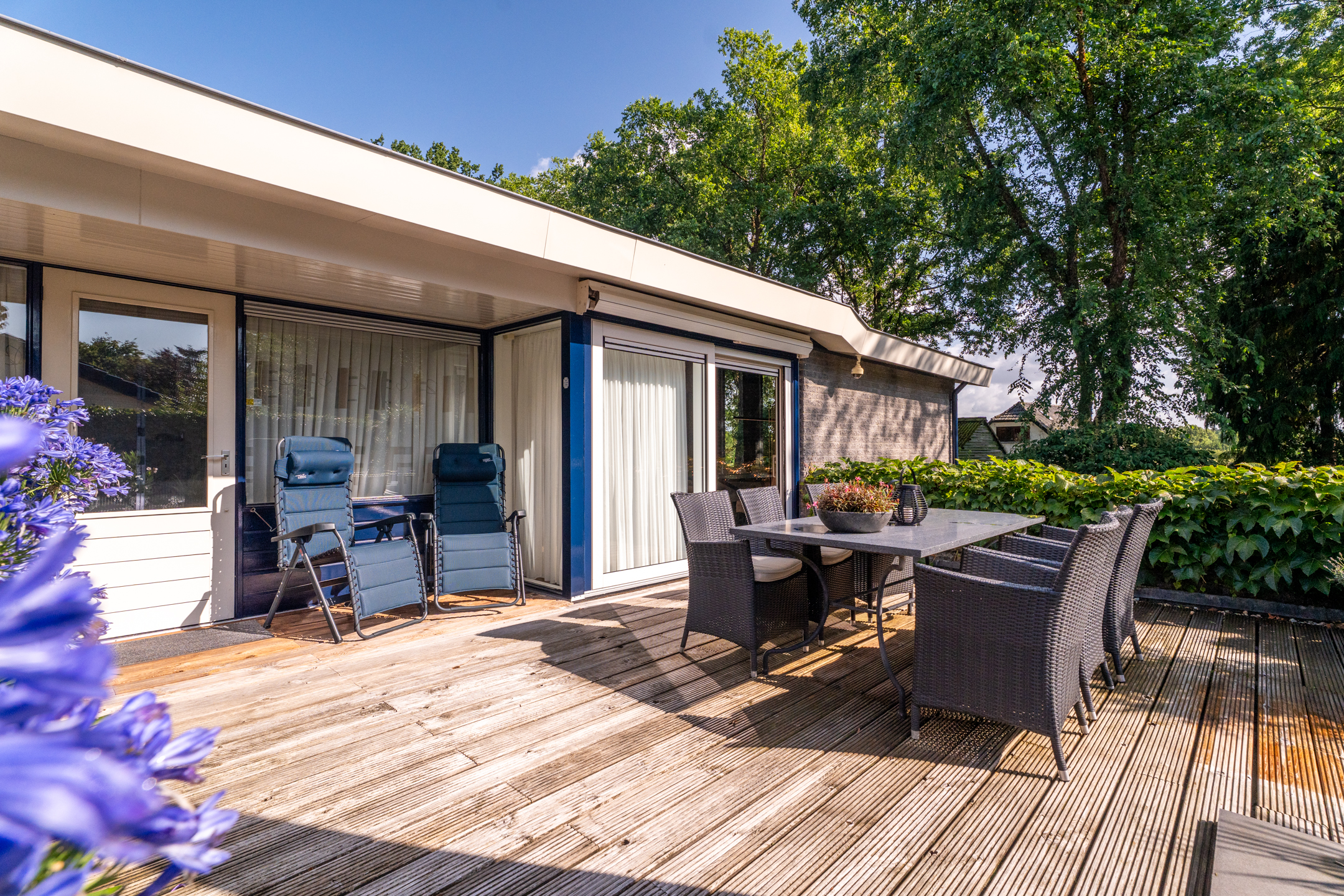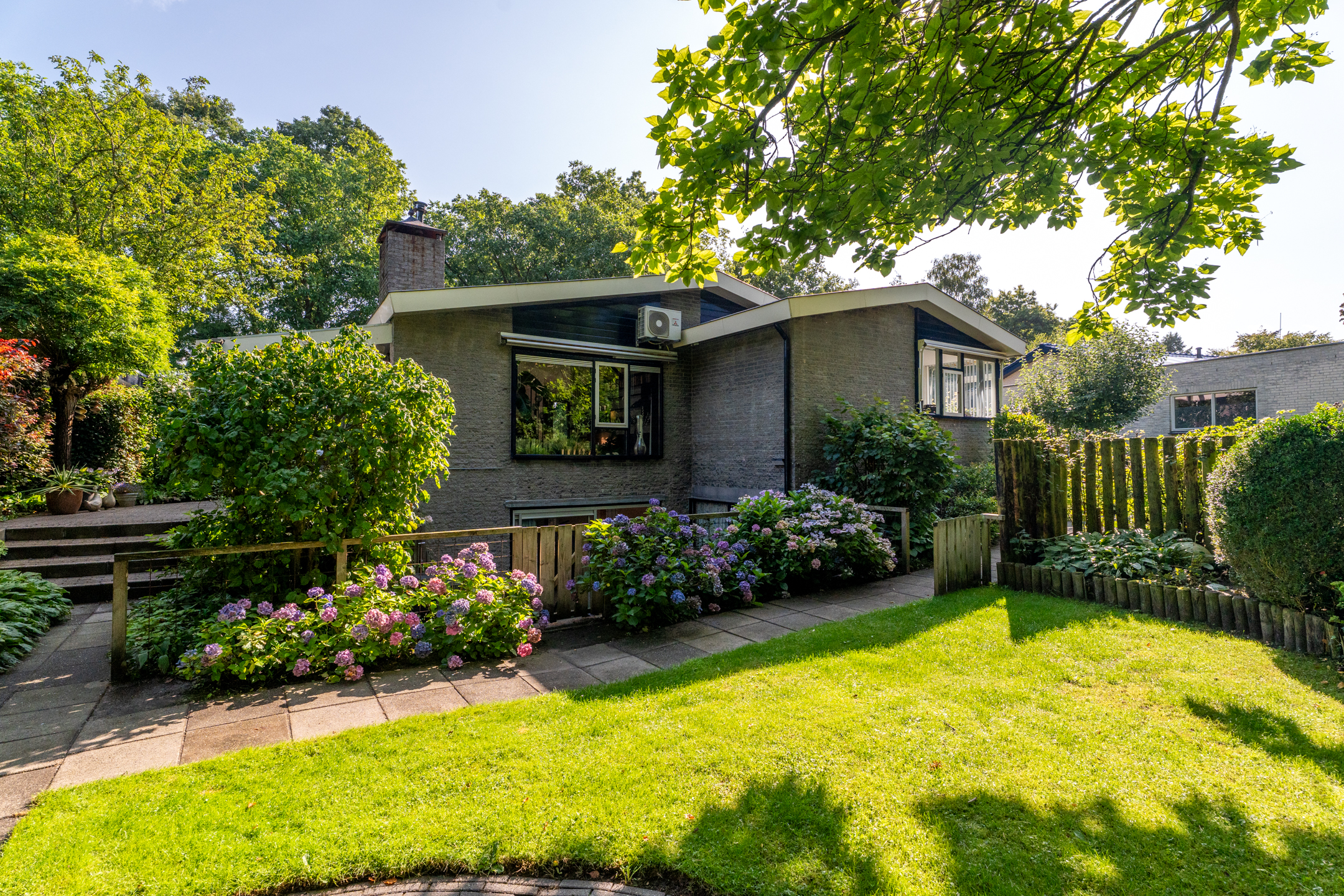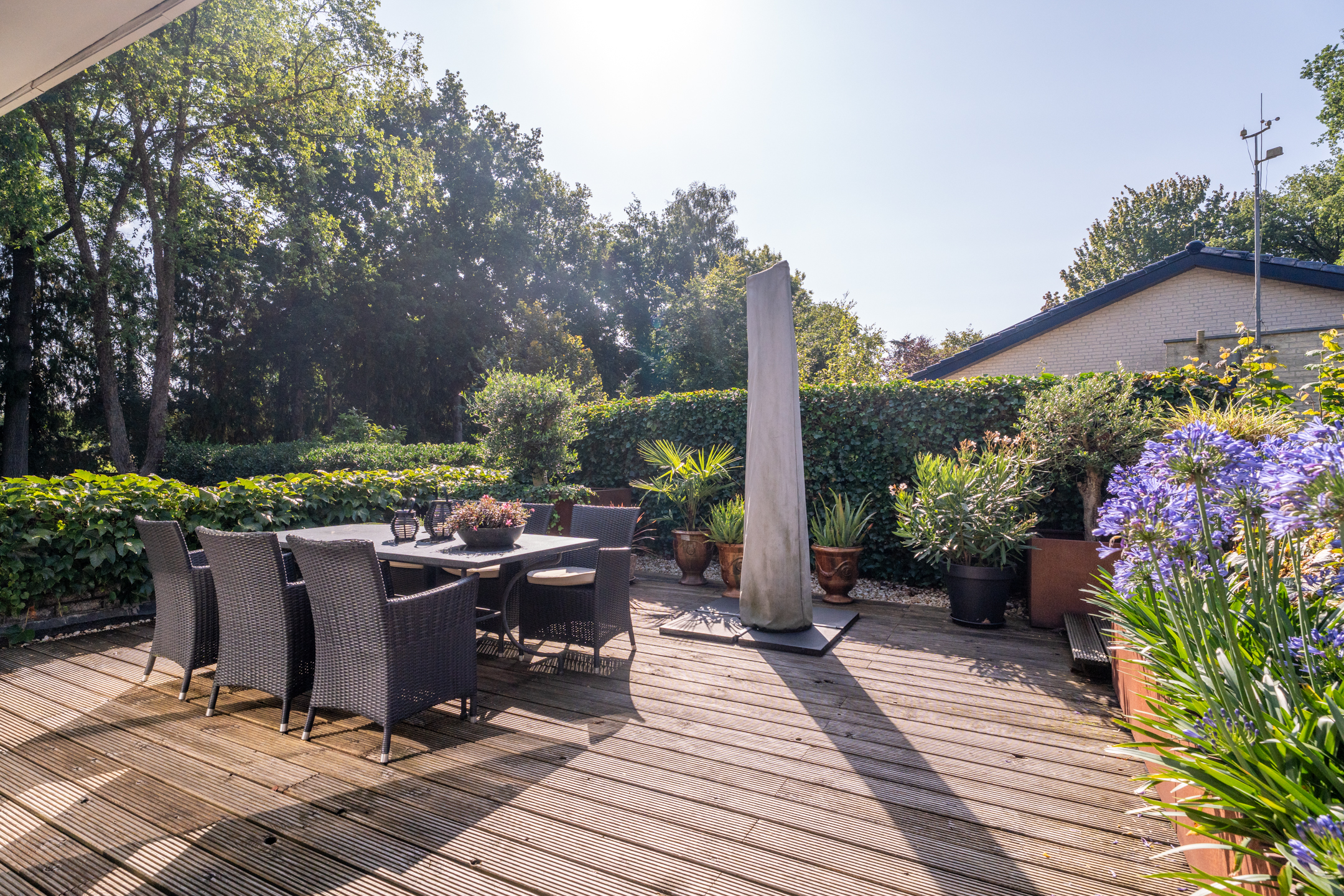 De rondom gelegen tuin is prachtig aangelegd en biedt op elk moment van de dag een fijne plek. Meerdere terrassen zorgen ervoor dat u altijd een keuze heeft tussen zon en schaduw. De hoogteverschillen en het speelse lijnenspel van het gazon, de borders en de beplanting geven de tuin karakter. En terwijl u buiten zit, hoort u enkel het ruisen van de bomen en het gezang van vogels. In de tuin is een houten berging geplaatst voor het opbergen van het tuingereedschap.