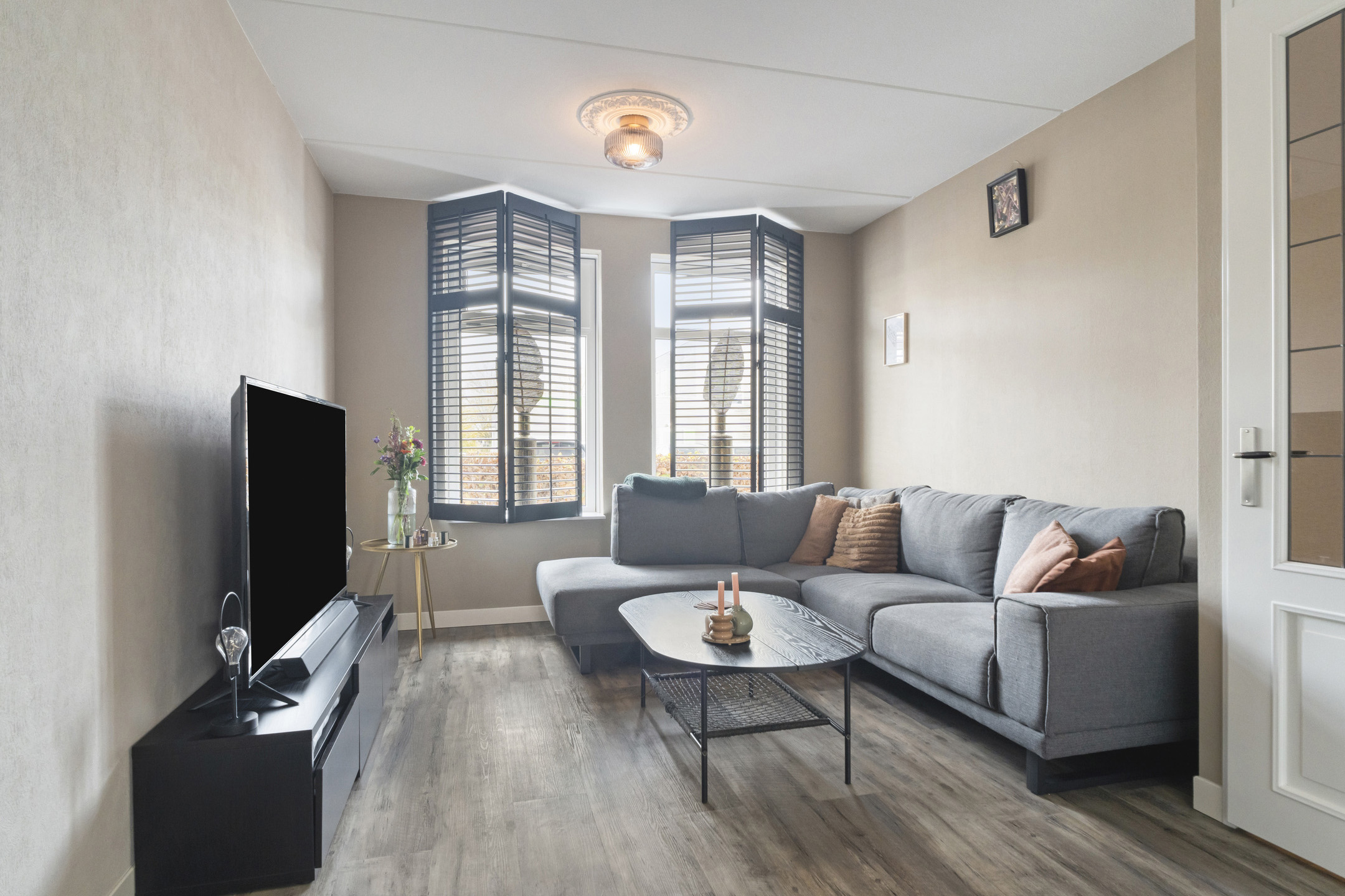 Je komt de woning binnen via de voortuin en komt in de hal met meterkast, trapopgang en een modern toilet met fonteintje. De woonkamer aan de voorzijde is prettig licht dankzij de grote ramen en het charmante erkerkozijn. Er is voldoende ruimte voor een royale zithoek en de PVC-vloer in warme houttint geeft het geheel een eigentijdse uitstraling.