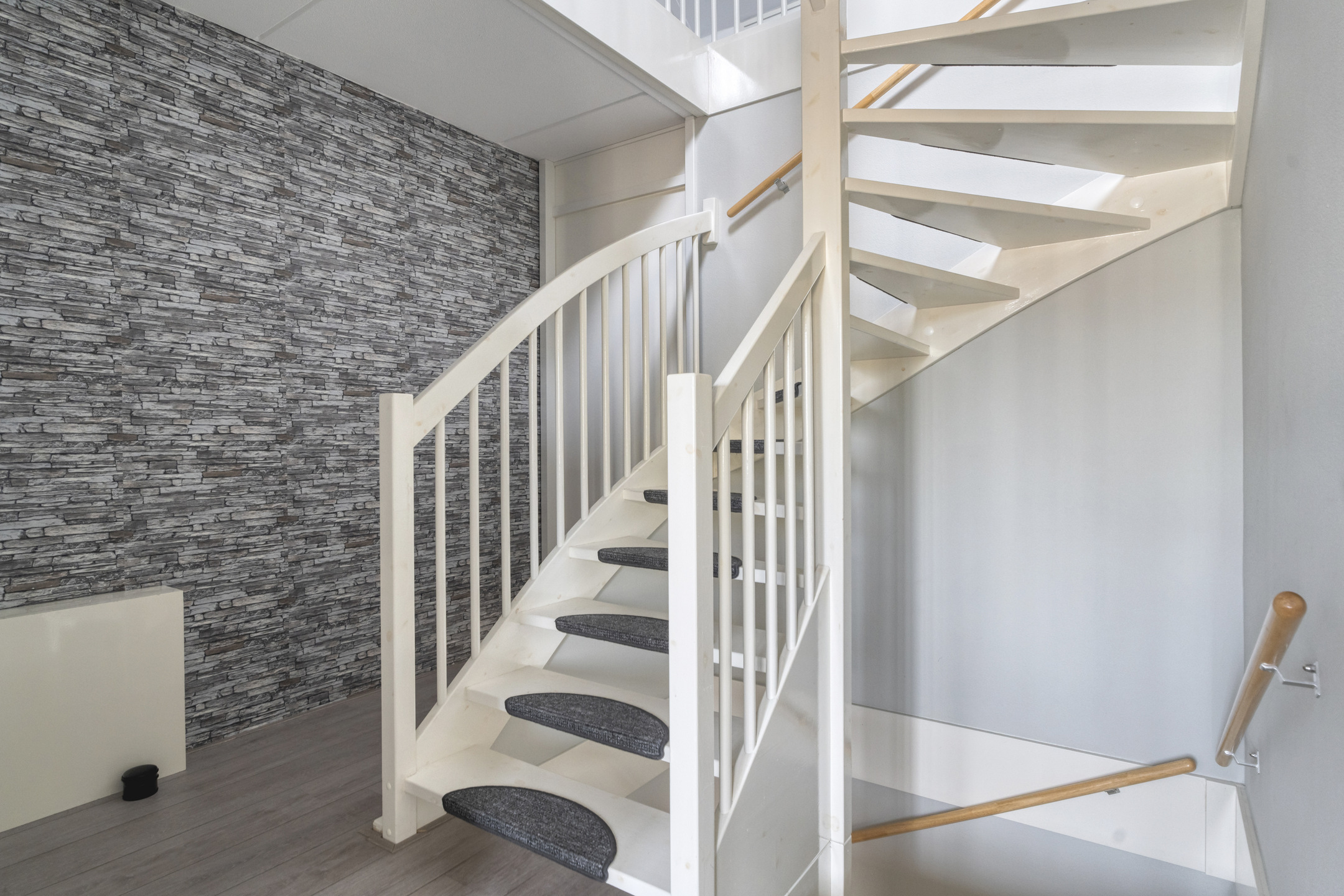 Via een vaste trap bereik je de verrassend ruime tweede verdieping. Hier is een vierde slaapkamer gerealiseerd met een mooie nokhoogte van ruim 3 meter. De overloop biedt ruimte aan de wasmachine en droger en er is veel bergruimte achter de knieschotten. Ideaal voor wie net wat extra ruimte zoekt.