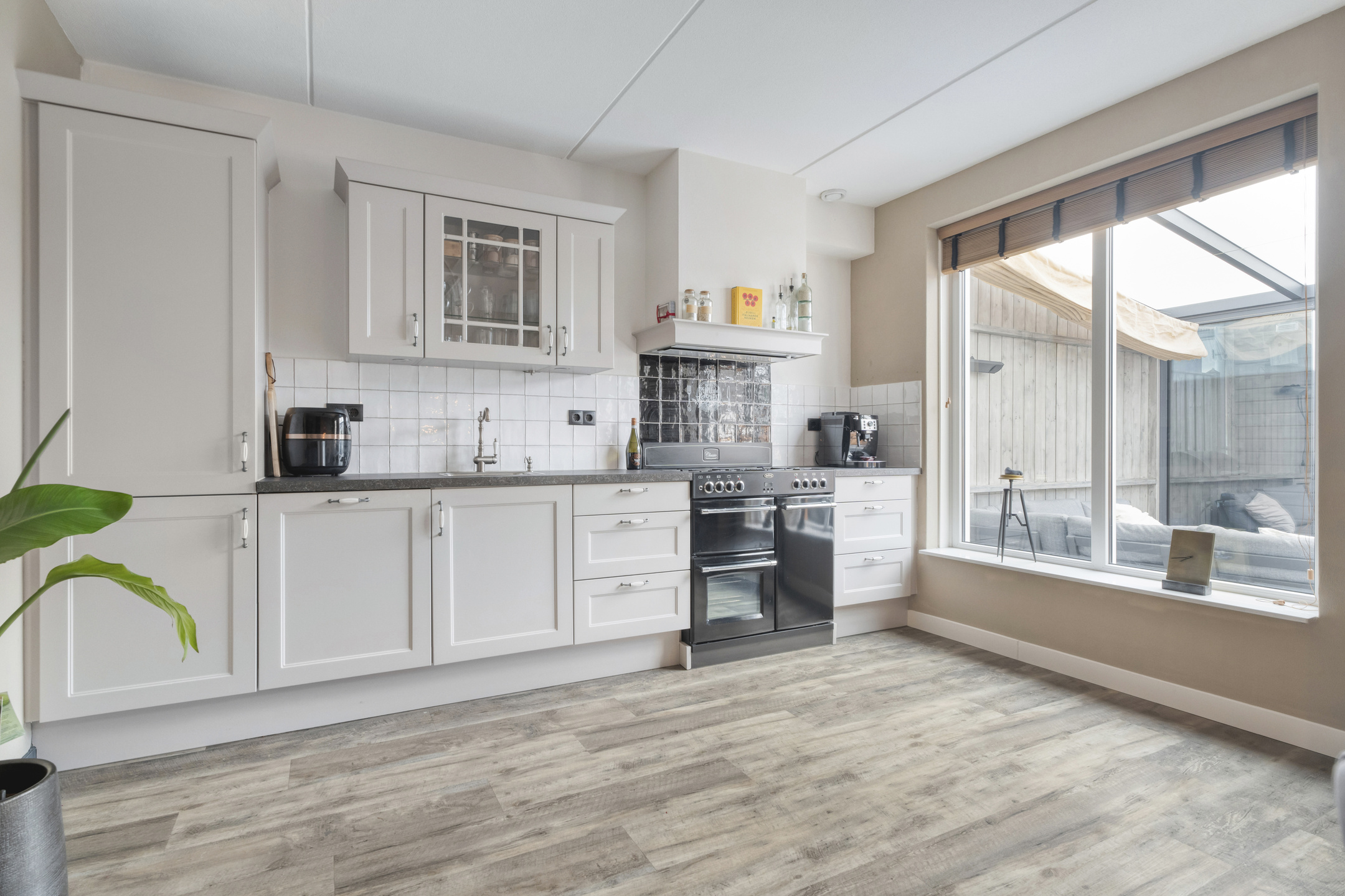 Aan de achterzijde bevindt zich de open woonkeuken, ingericht in landelijke stijl en voorzien van een groot fornuis, afzuigkap, koelkast en volop kastruimte. De indeling maakt het makkelijk om tijdens het koken in contact te blijven met het gezin of bezoek aan de eettafel. Via de achterdeur stap je zó onder de veranda.