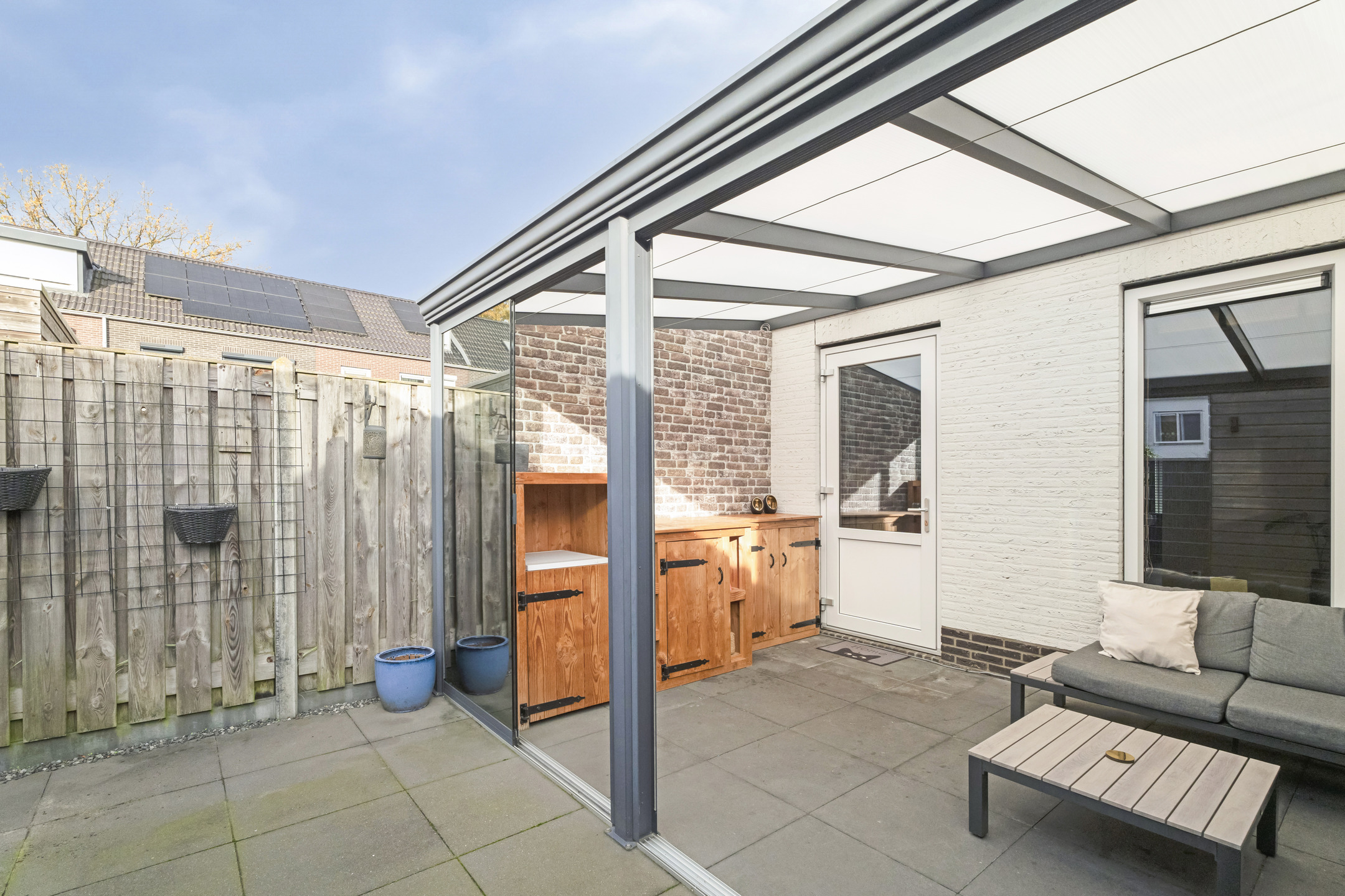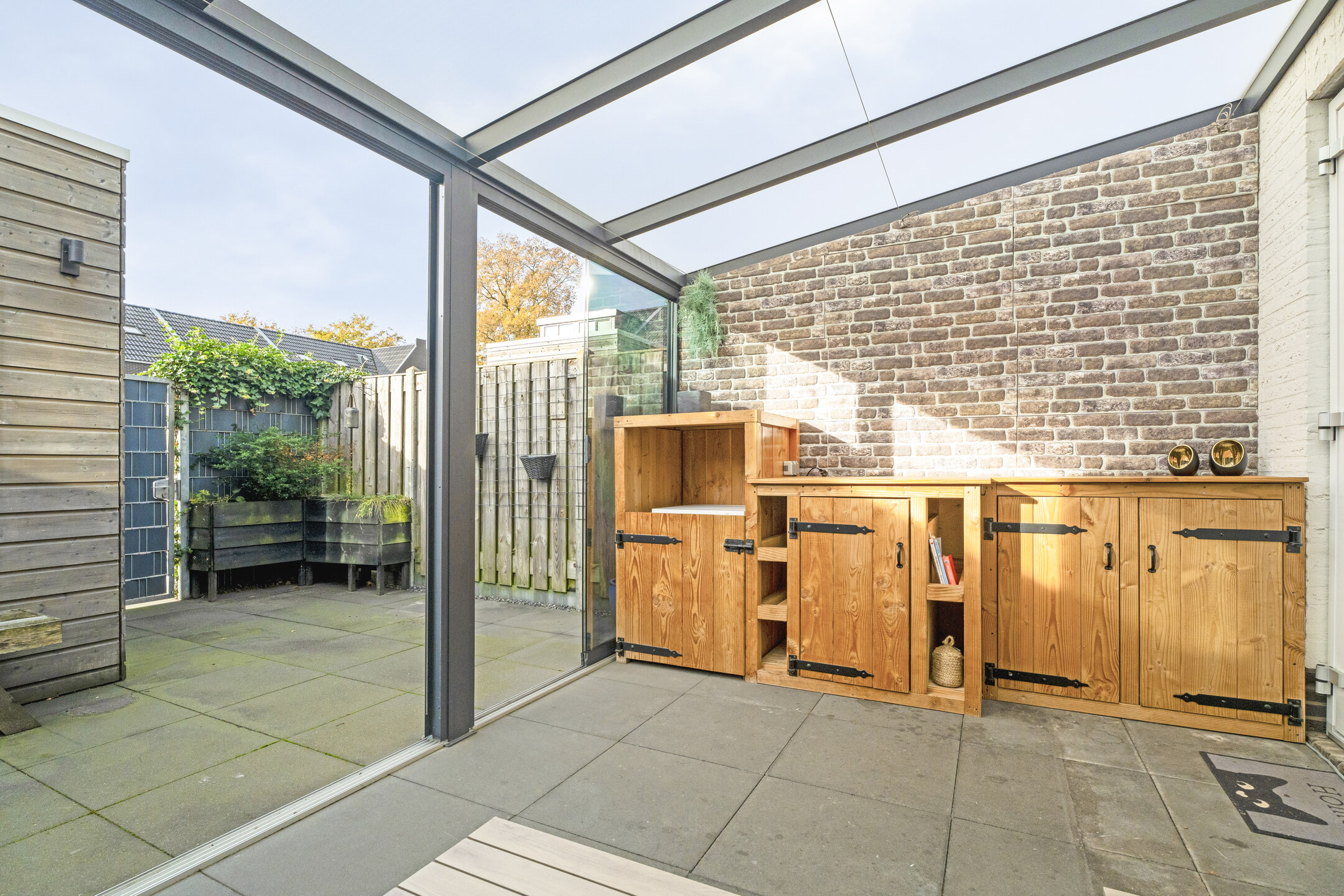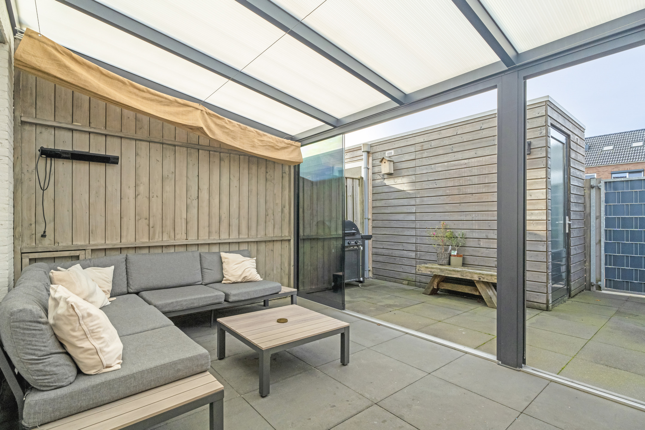 De achtertuin is onderhoudsvriendelijk aangelegd met een ruim terras en een sfeervolle veranda waar je tot laat in het jaar buiten kunt zitten. Er is ruimte voor een loungehoek en achterin de tuin staat een houten berging voor fietsen en tuingereedschap. Daarnaast biedt de achtertuin de mogelijkheid voor het plaatsen van een buitenkeuken om bijvoorbeeld met een BBQ te gebruiken. Verder is de tuin ook achterom bereikbaar.