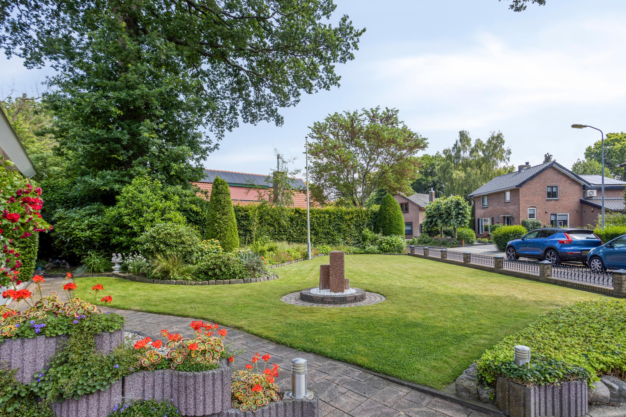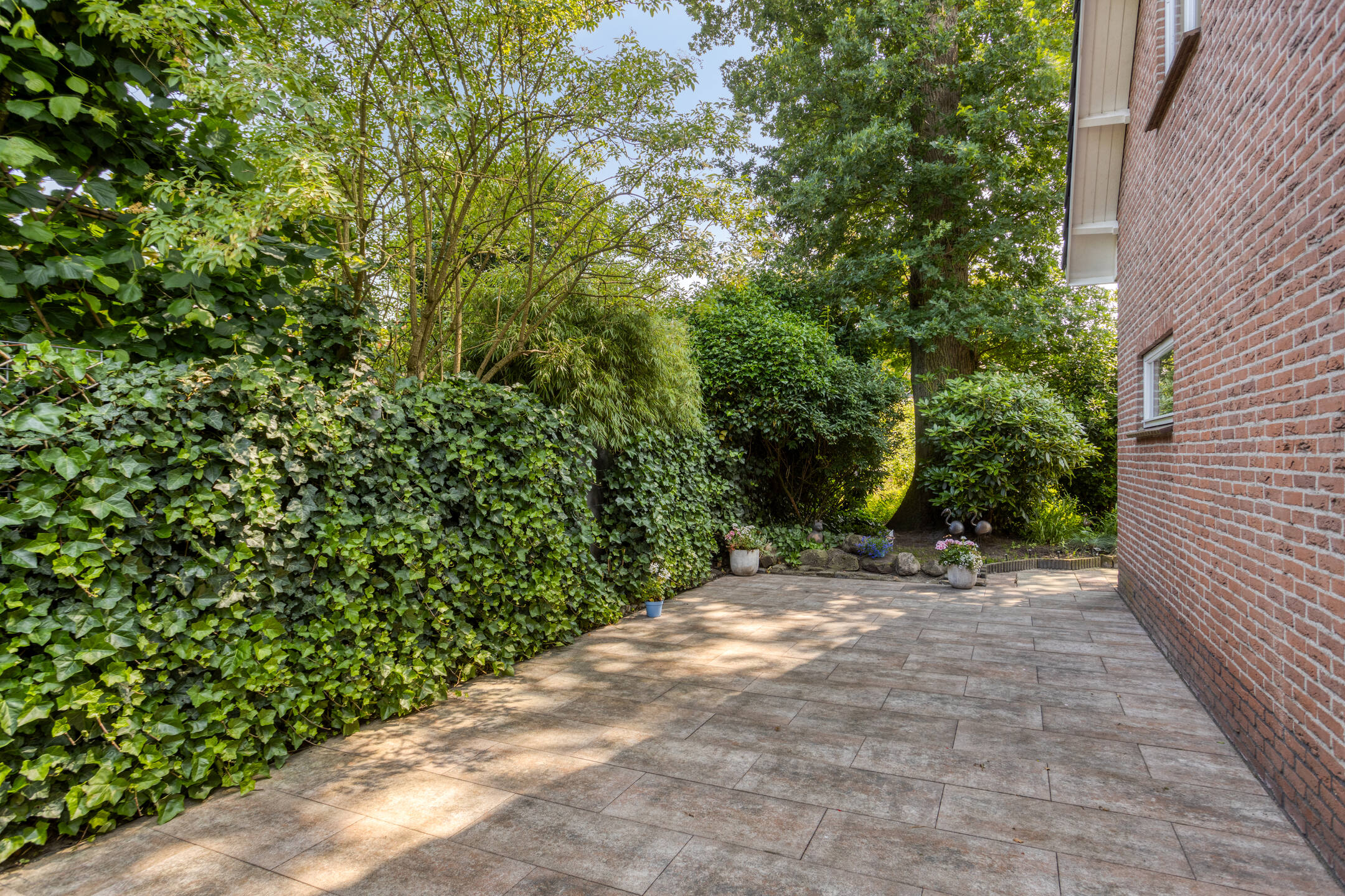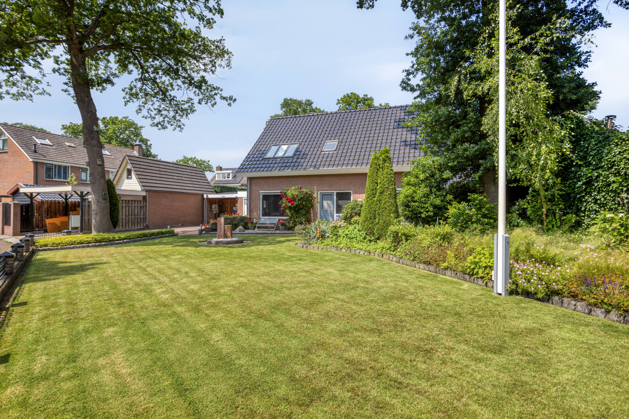 De tuin rondom de woning is verzorgd en groen, met een gazon, borders en volwassen beplanting. Aan de achterzijde biedt het ruime terras een fijne plek om te genieten van de zon. Er is bovendien een tweede terras, perfect voor lange zomeravonden. Dankzij het aanwezige tuinberegeningssysteem blijft het gazon zelfs in droge zomers fris en groen.