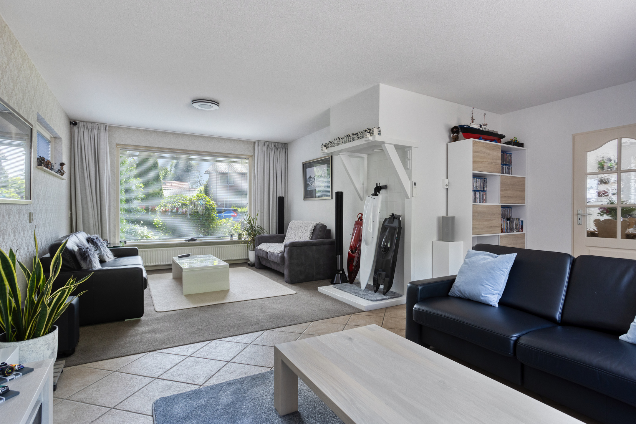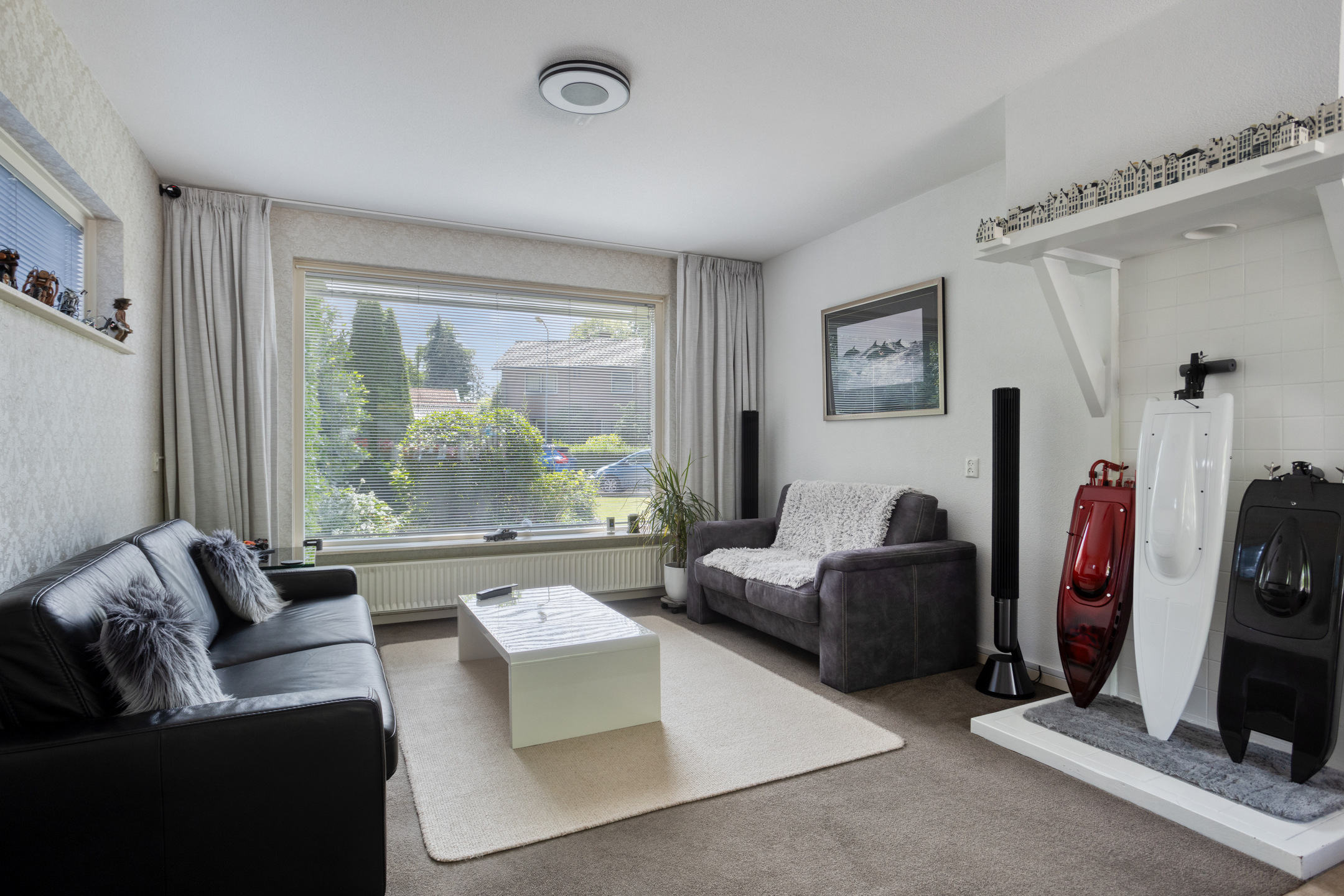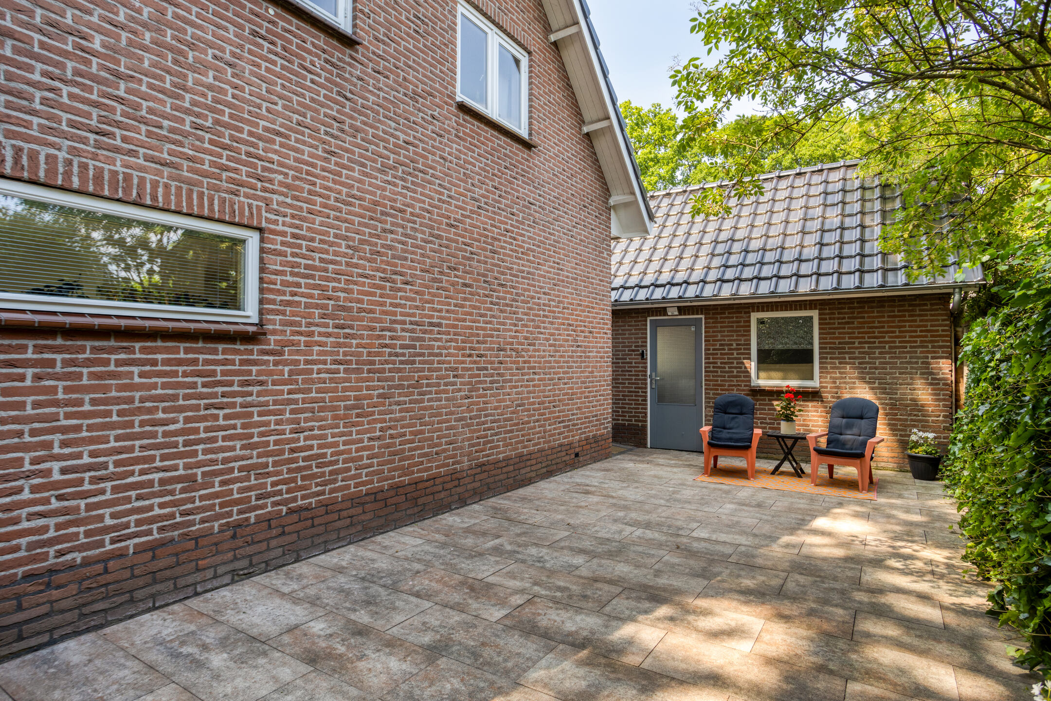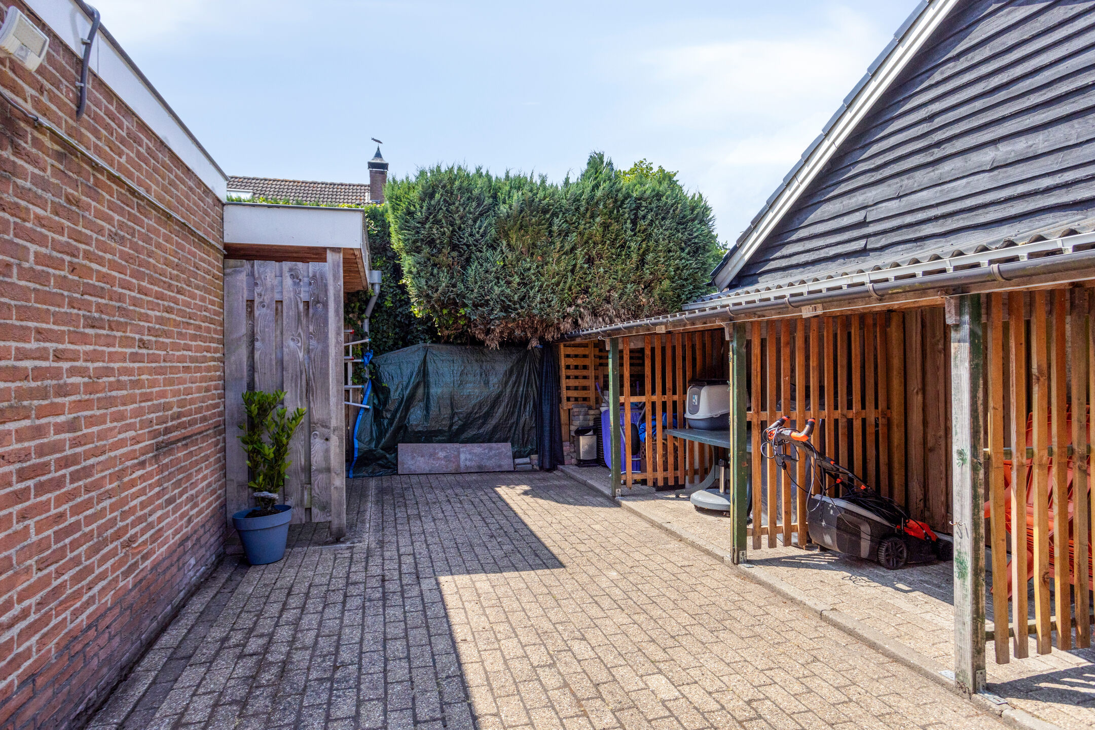 De tuin rondom de woning is verzorgd en groen, met een gazon, borders en volwassen beplanting. Aan de achterzijde biedt het ruime terras een fijne plek om te genieten van de zon. Er is bovendien een tweede terras, perfect voor lange zomeravonden. Dankzij het aanwezige tuinberegeningssysteem blijft het gazon zelfs in droge zomers fris en groen.