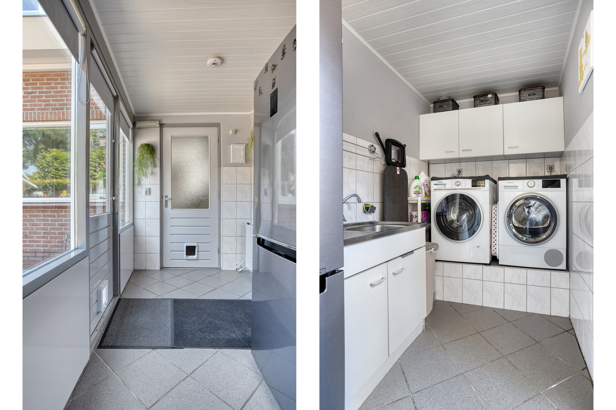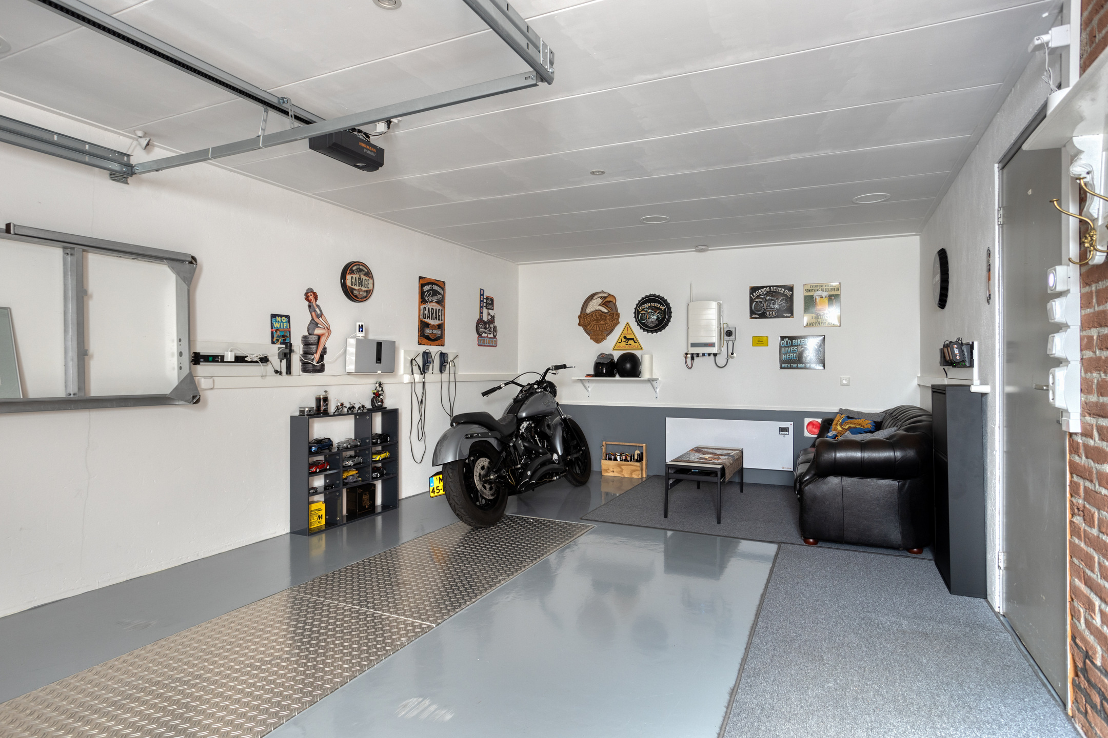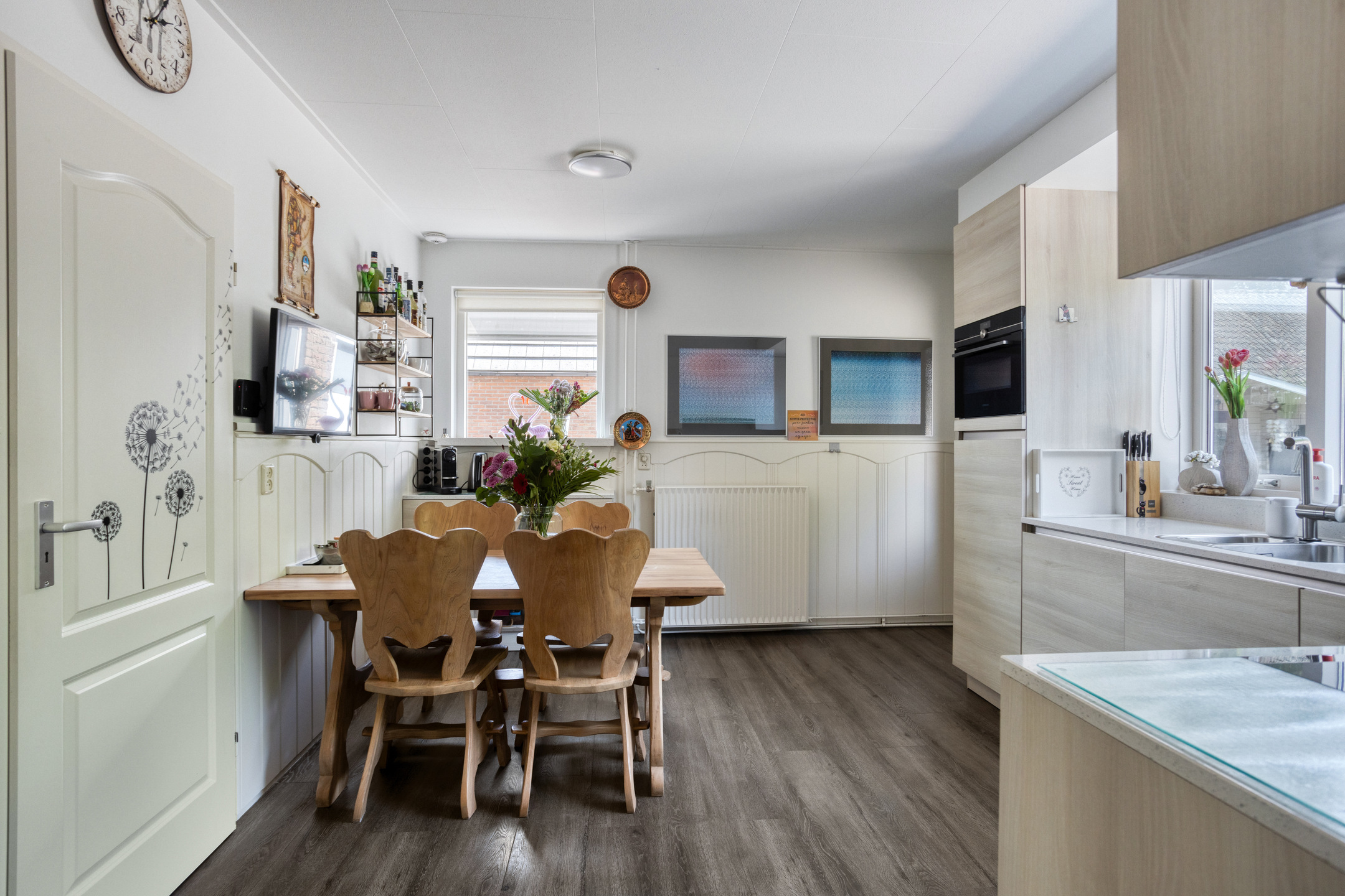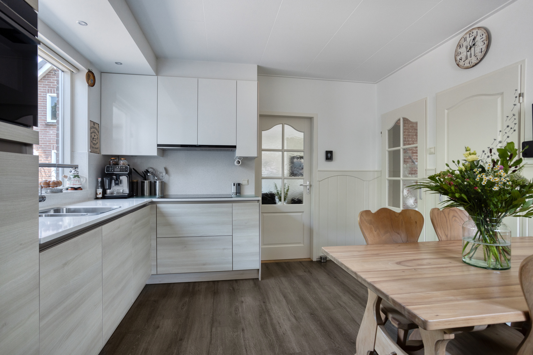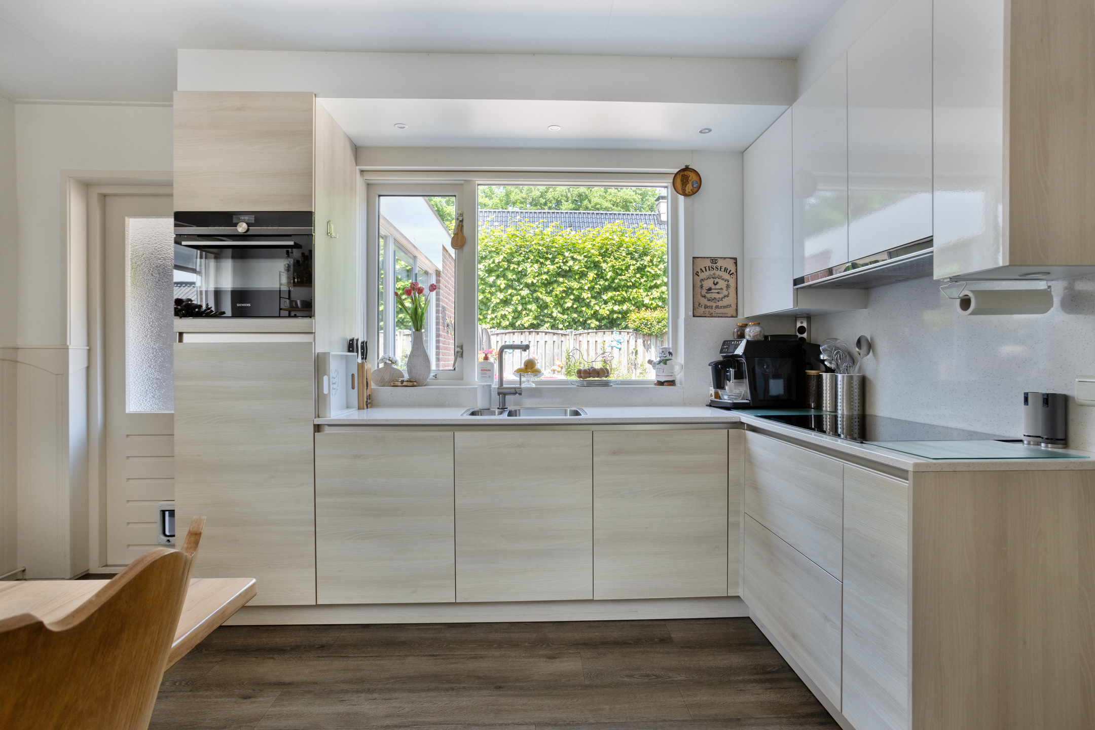 De open keuken is praktisch ingericht in hoekopstelling, uitgerust met moderne inbouwapparatuur en een gezellig eetgedeelte. Vanuit de keuken heb je toegang tot de bijkeuken met witgoedaansluitingen en de inpandige garage, ideaal voor extra opslag of als hobbyruimte. Deze garage is keurig afgewerkt en multifunctioneel inzetbaar. Perfect als thuiswerkplek, praktijk of salon aan huis. Op de begane grond bevindt zich ook een volwaardige slaapkamer, speelkamer of kantoor