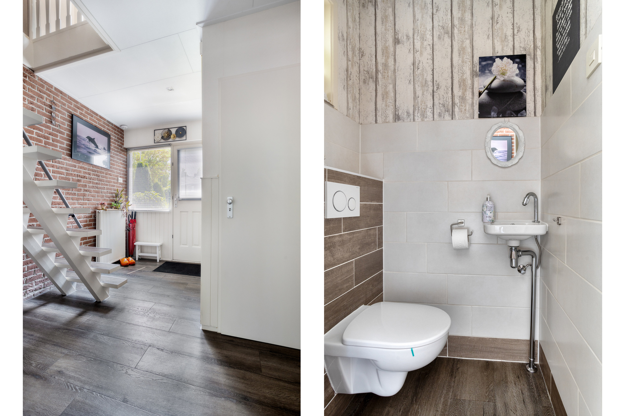 De hal is licht en ruim, met een moderne vloer, strak afgewerkte wanden en een stijlvolle trapopgang. Direct bij binnenkomst tref je het moderne toilet, een trapkast en een handige garderobenis. Vanuit de hal bereik je de royale woonkamer: een fijne leefruimte met grote ramen, veel lichtinval en uitzicht op de groene tuin. Hier is ruimte voor meerdere zithoeken én een grote eettafel.
