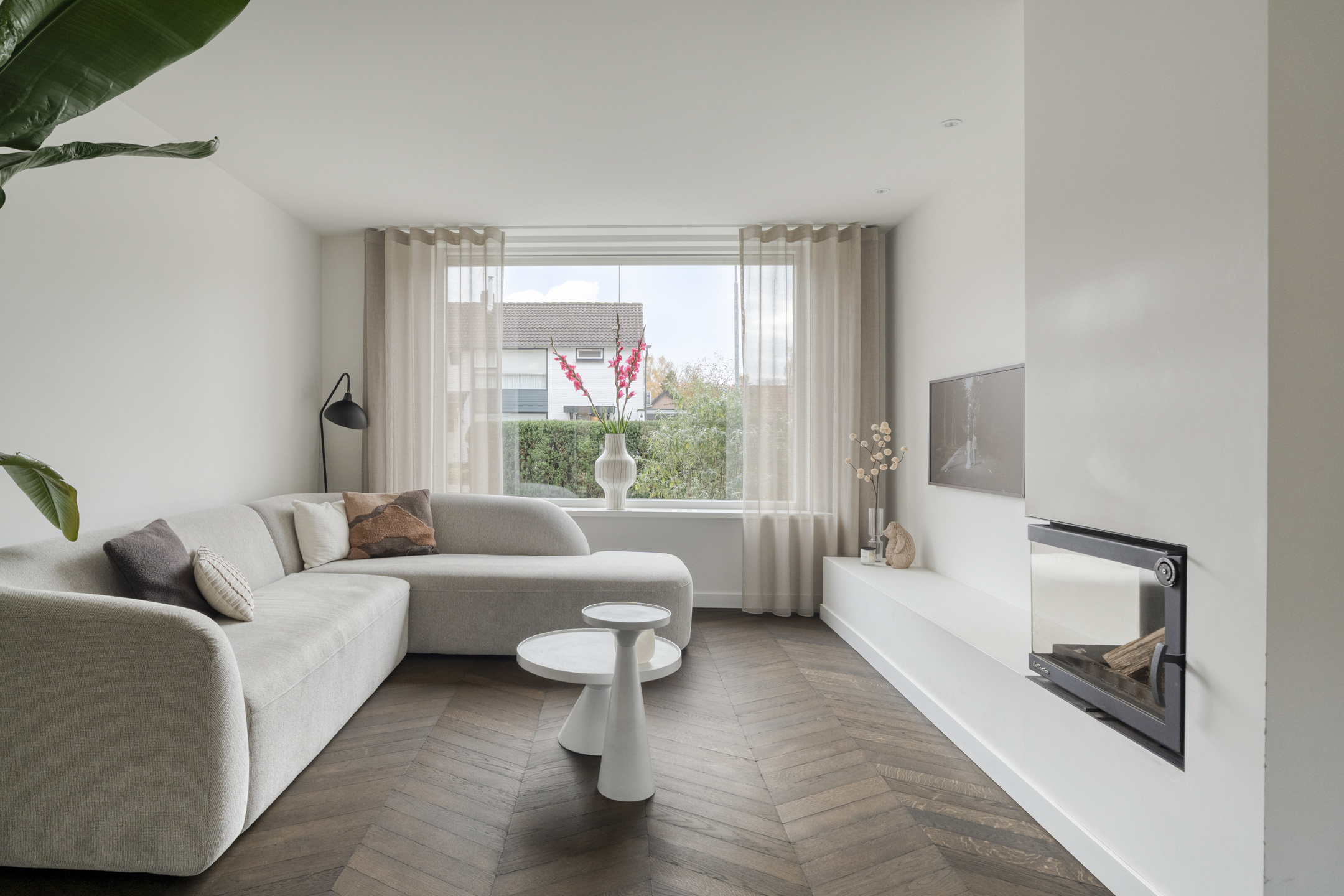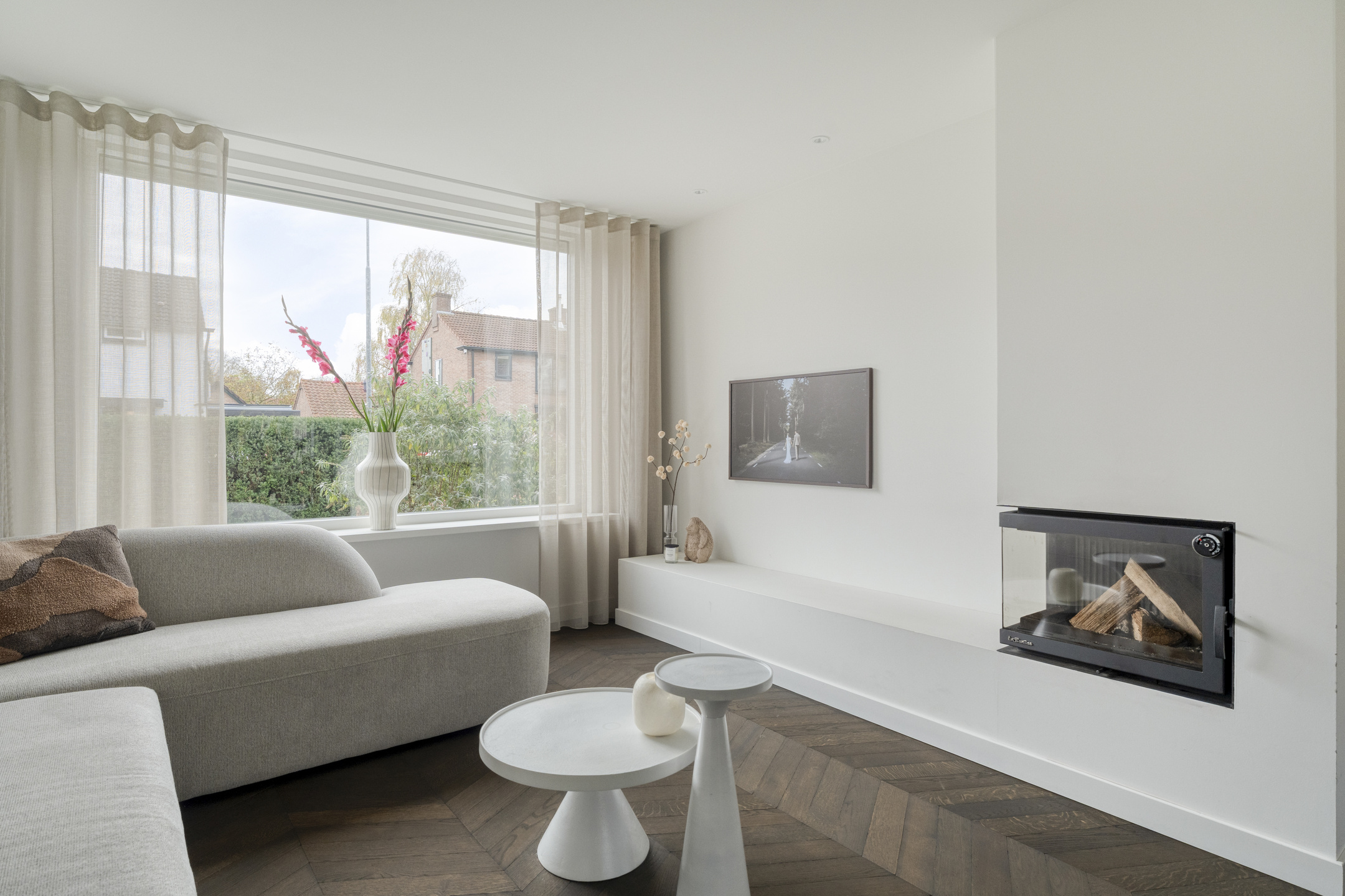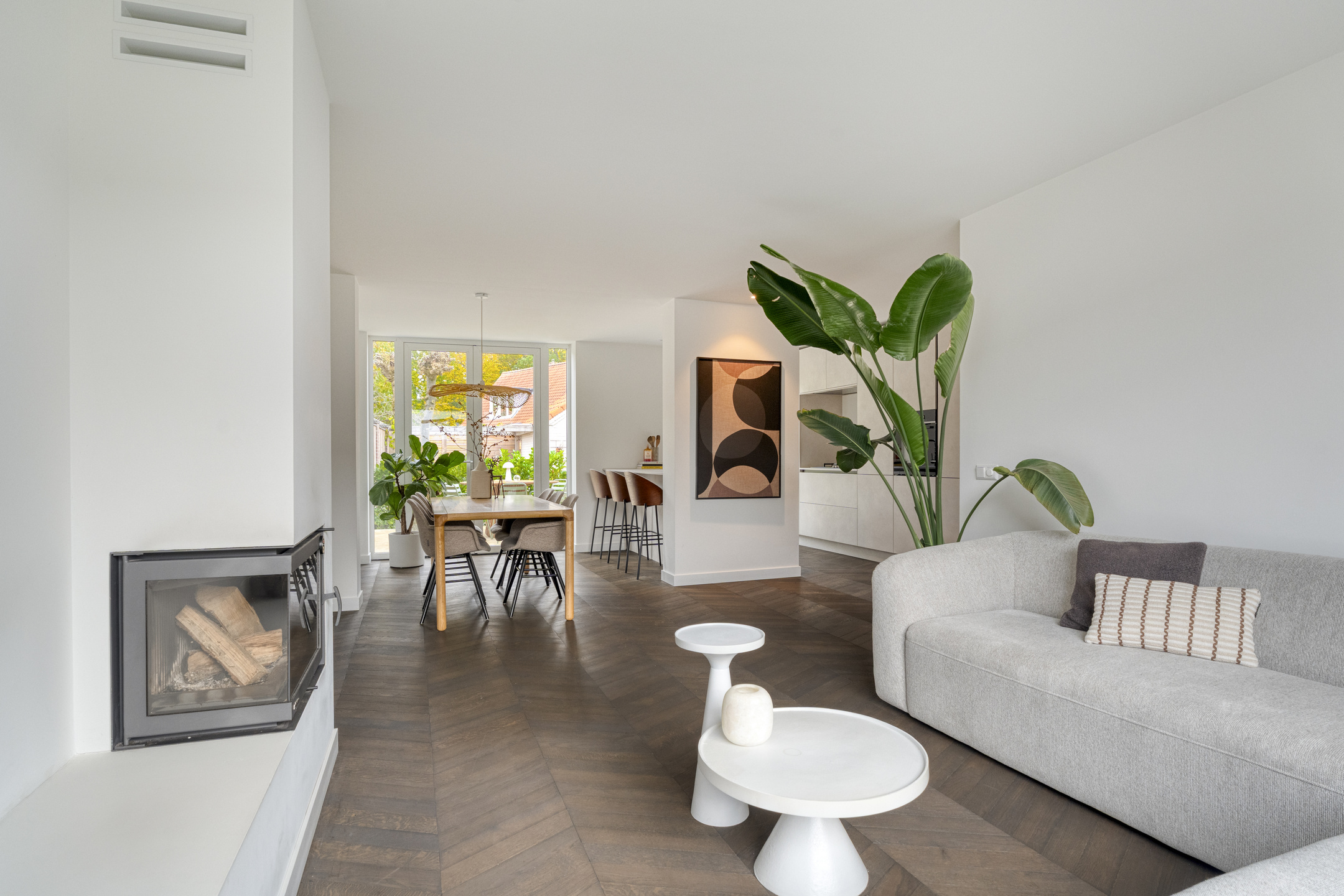 De royale doorzonwoonkamer is heerlijk licht dankzij grote raampartijen aan beide zijden. De uitbouw aan de achterzijde geeft extra ruimte, waardoor er een sfeervol zitgedeelte en een ruim eetgedeelte is ontstaan. De strakke inbouwhaard zorgt voor een warme sfeer. De gehele begane grond is voorzien van vloerverwarming en glad gestucte wanden en plafonds.