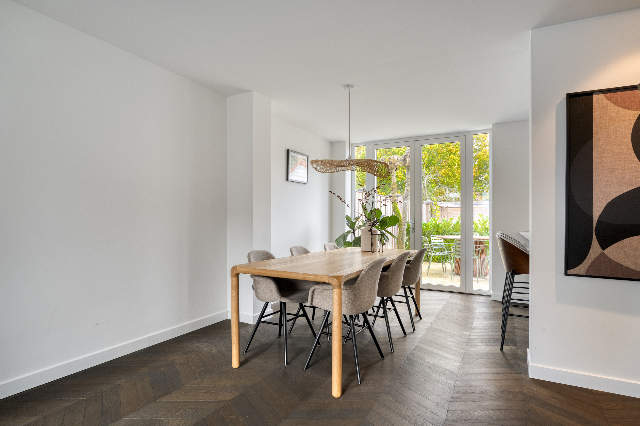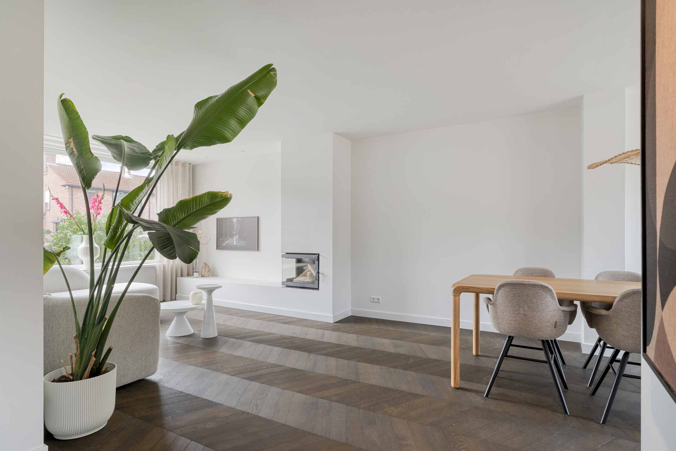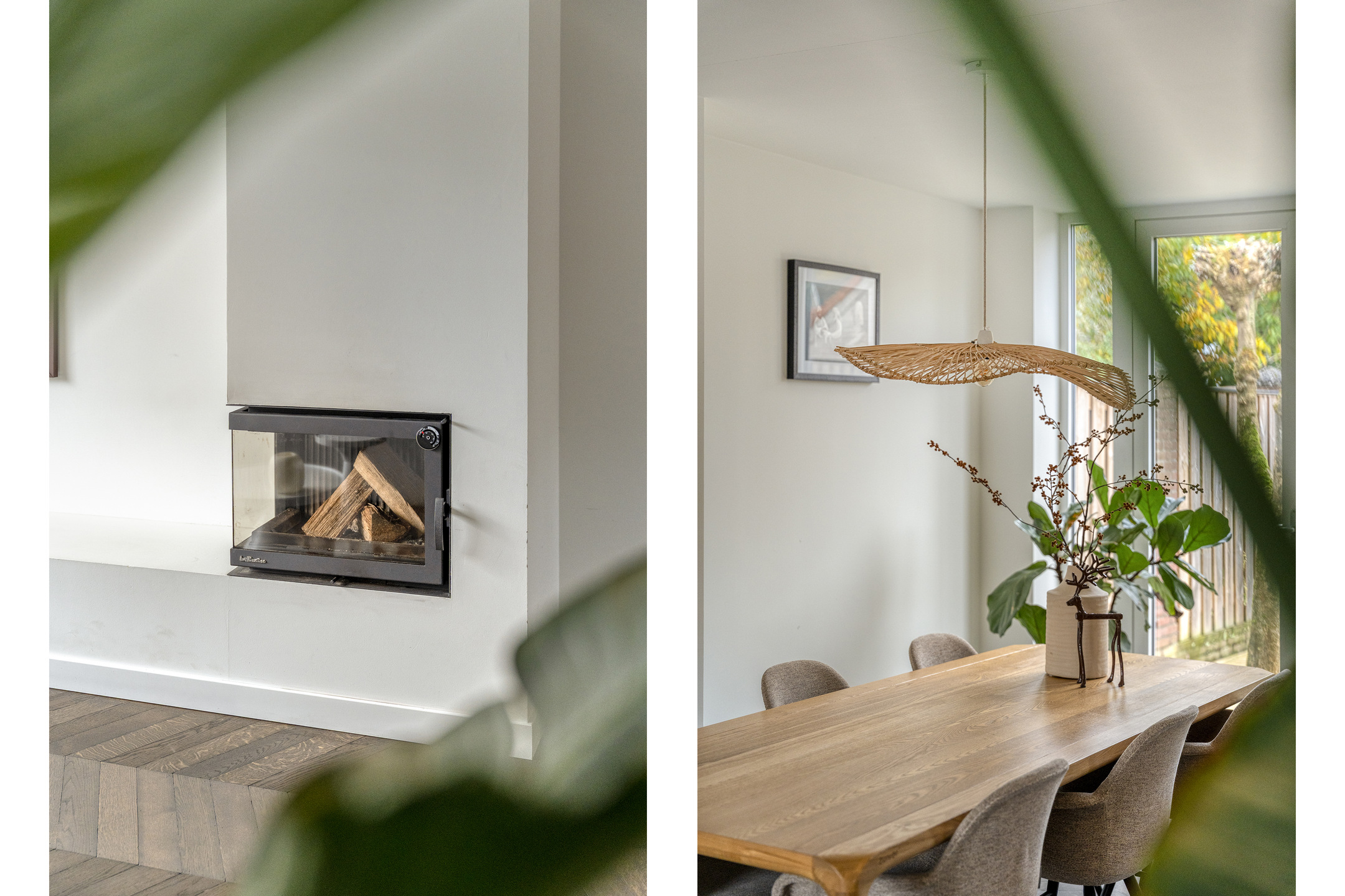 De royale doorzonwoonkamer is heerlijk licht dankzij grote raampartijen aan beide zijden. De uitbouw aan de achterzijde geeft extra ruimte, waardoor er een sfeervol zitgedeelte en een ruim eetgedeelte is ontstaan. De strakke inbouwhaard zorgt voor een warme sfeer. De gehele begane grond is voorzien van vloerverwarming en glad gestucte wanden en plafonds.