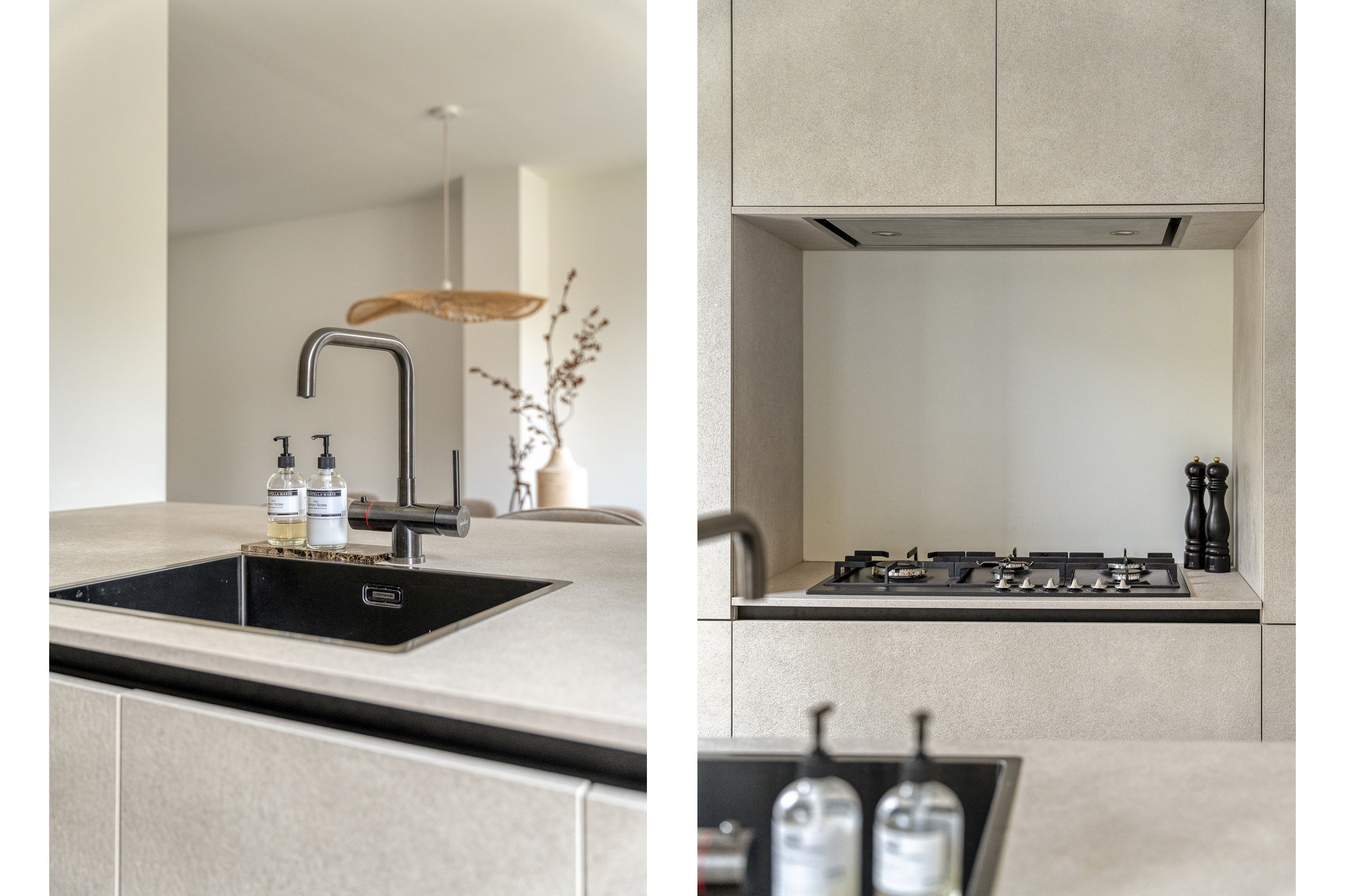 Aan de achterzijde van de woning ligt de moderne keuken, voorzien van een semi-eiland met bar. Er is gekozen voor goede inbouwapparatuur en veel werk- en opbergruimte. Het geheel sluit perfect aan op het eigentijdse karakter van de woning. Vanuit de keuken is er toegang tot de tuin.