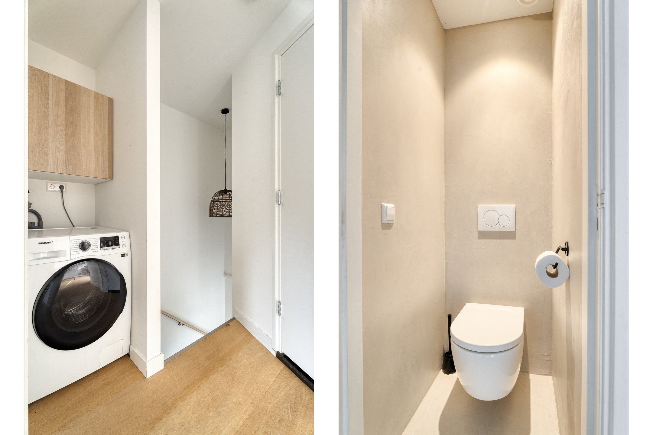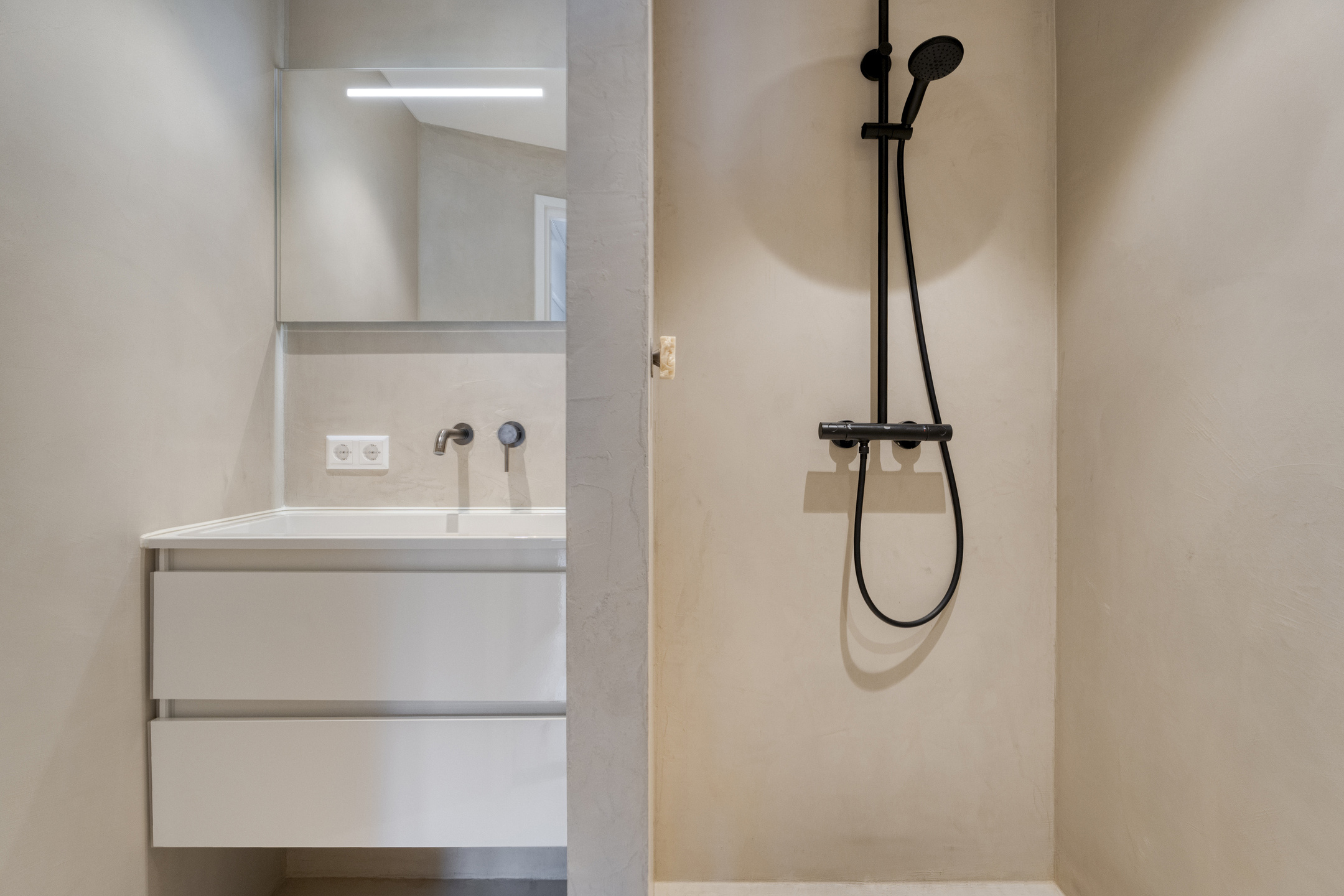 De badkamer is vernieuwd en voorzien van een inloopdouche, een modern wastafelmeubel, vloerverwarming en mechanische ventilatie. De afwerking is strak en tijdloos.