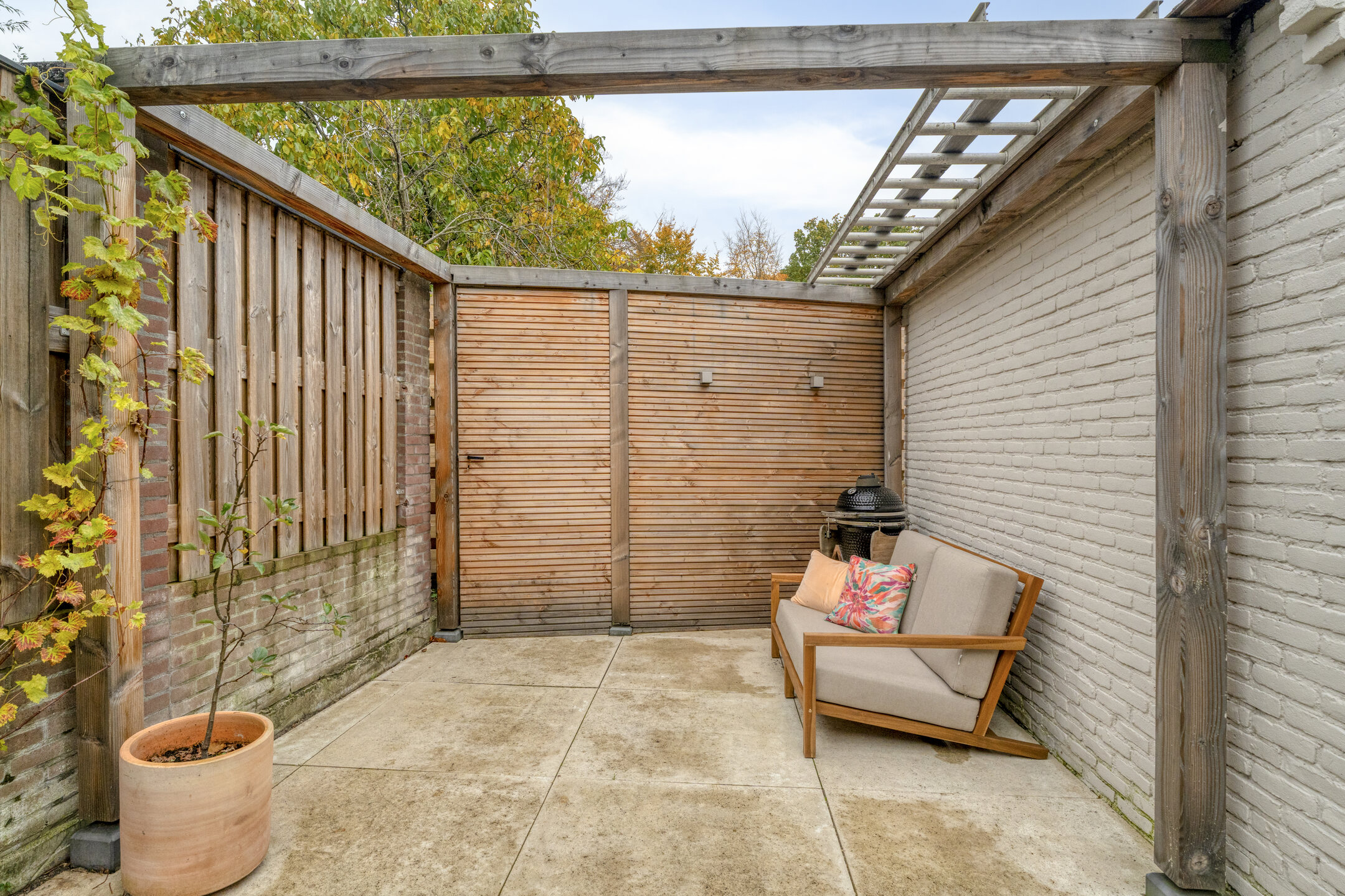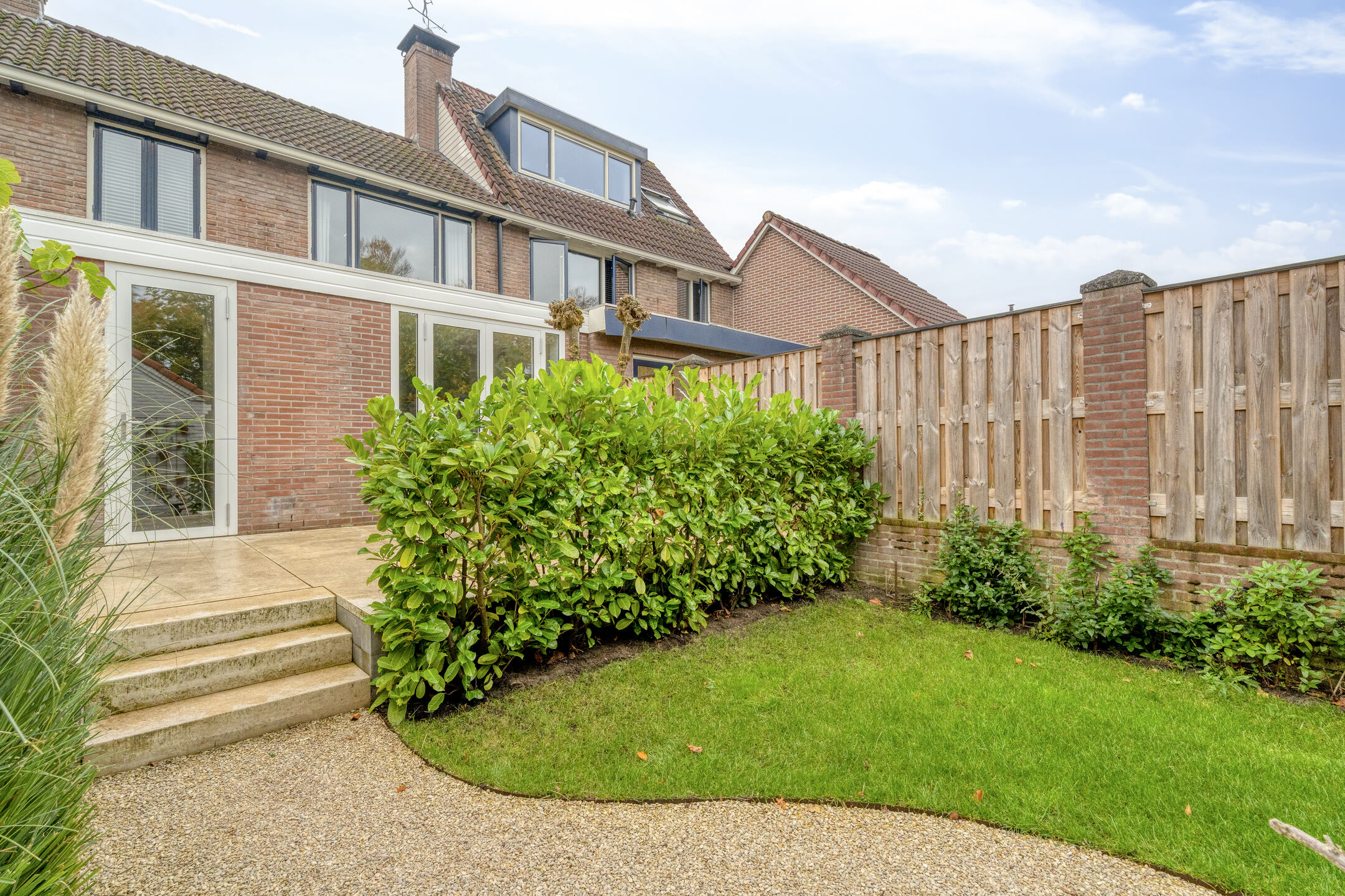 De diepe achtertuin is opnieuw aangelegd met fraaie terrastegels, gazon, beplanting en biedt volop privacy. Achterin de tuin staat een stenen berging met vliering. Ook de voortuin is met zorg onderhouden.