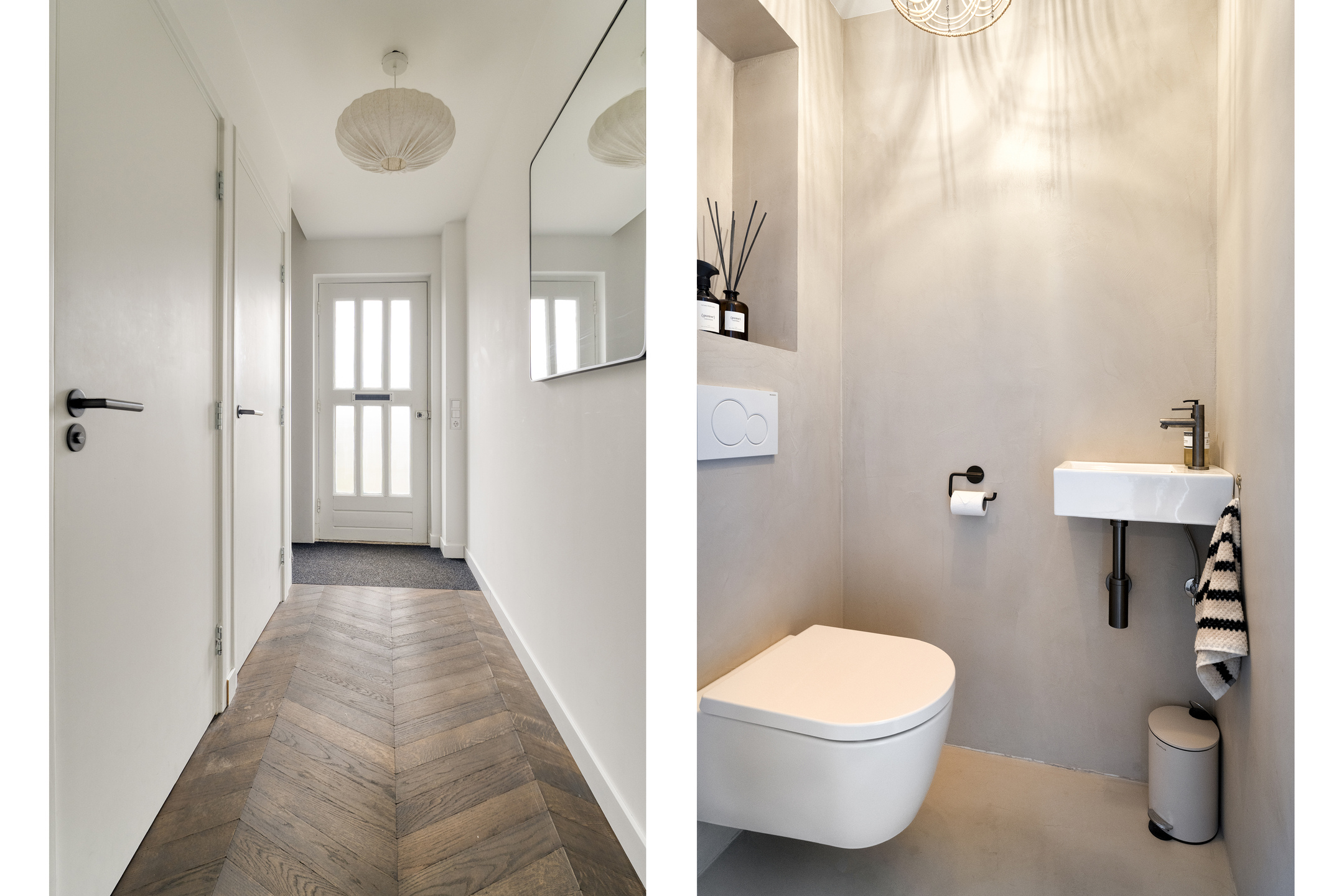 Via de verzorgde voortuin bereik je de entree. In de hal vind je de trapopgang, de meterkast en het modern afgewerkte toilet met hangcloset en fonteintje. Vanuit de hal loop je door naar het hart van de woning.