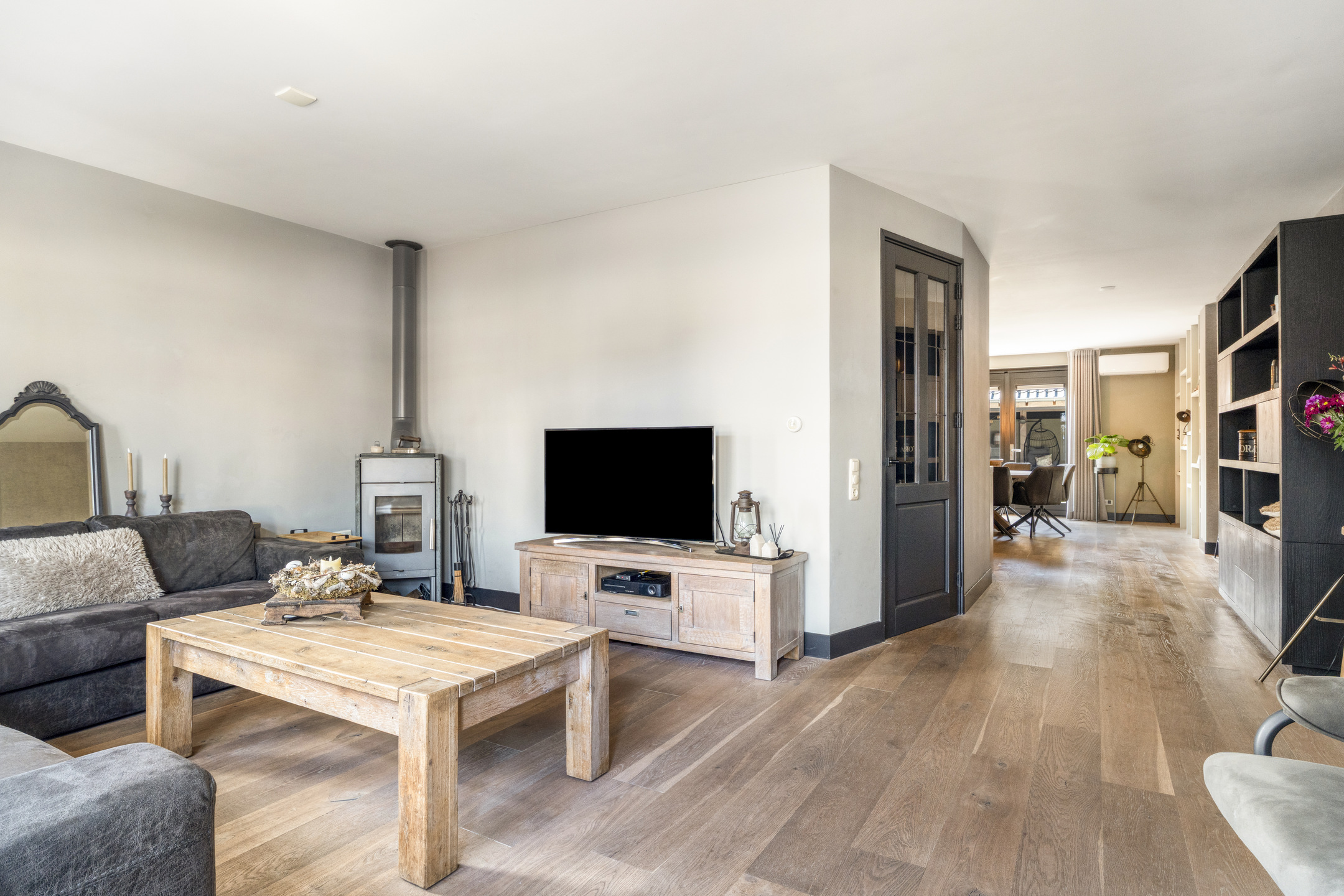 De woonkamer is royaal opgezet en dankzij de grote raampartijen heerlijk licht. Aan de voorzijde kun je een gezellig zitgedeelte creëren, terwijl er aan de achterzijde volop ruimte is voor een grote eettafel met uitzicht op de tuin.