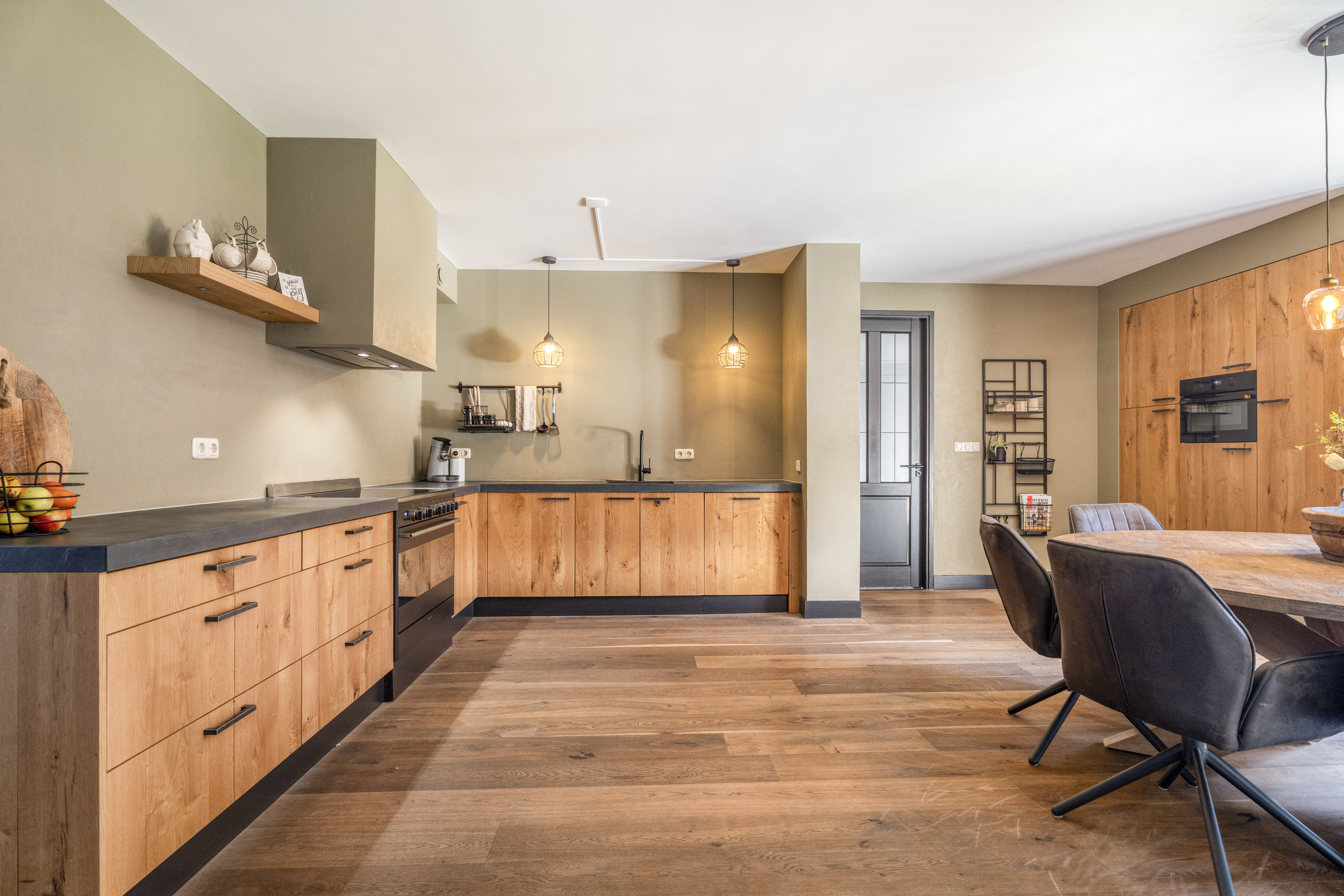 De open woonkeuken sluit hier mooi op aan en beschikt over veel werk- en bergruimte. De indeling maakt het een fijne plek om te koken terwijl je contact houdt met het eetgedeelte. Vanuit de keuken is er bovendien direct toegang tot de achtertuin.