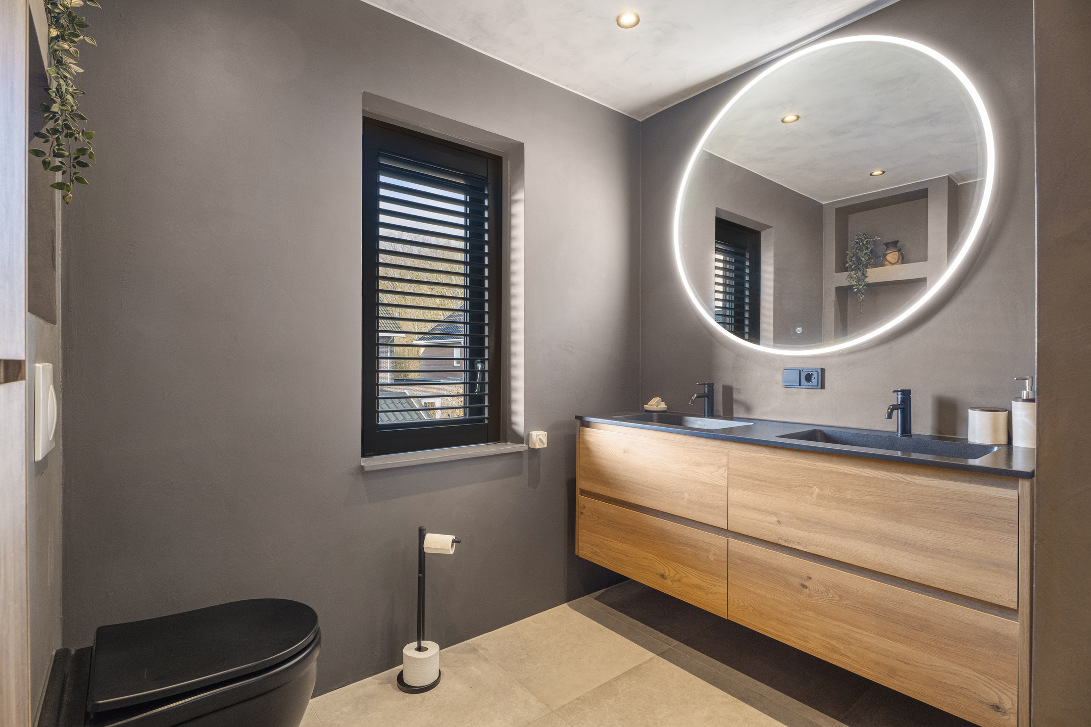 De badkamer is compleet ingericht en beschikt over een douche, wastafelmeubel en een toilet.