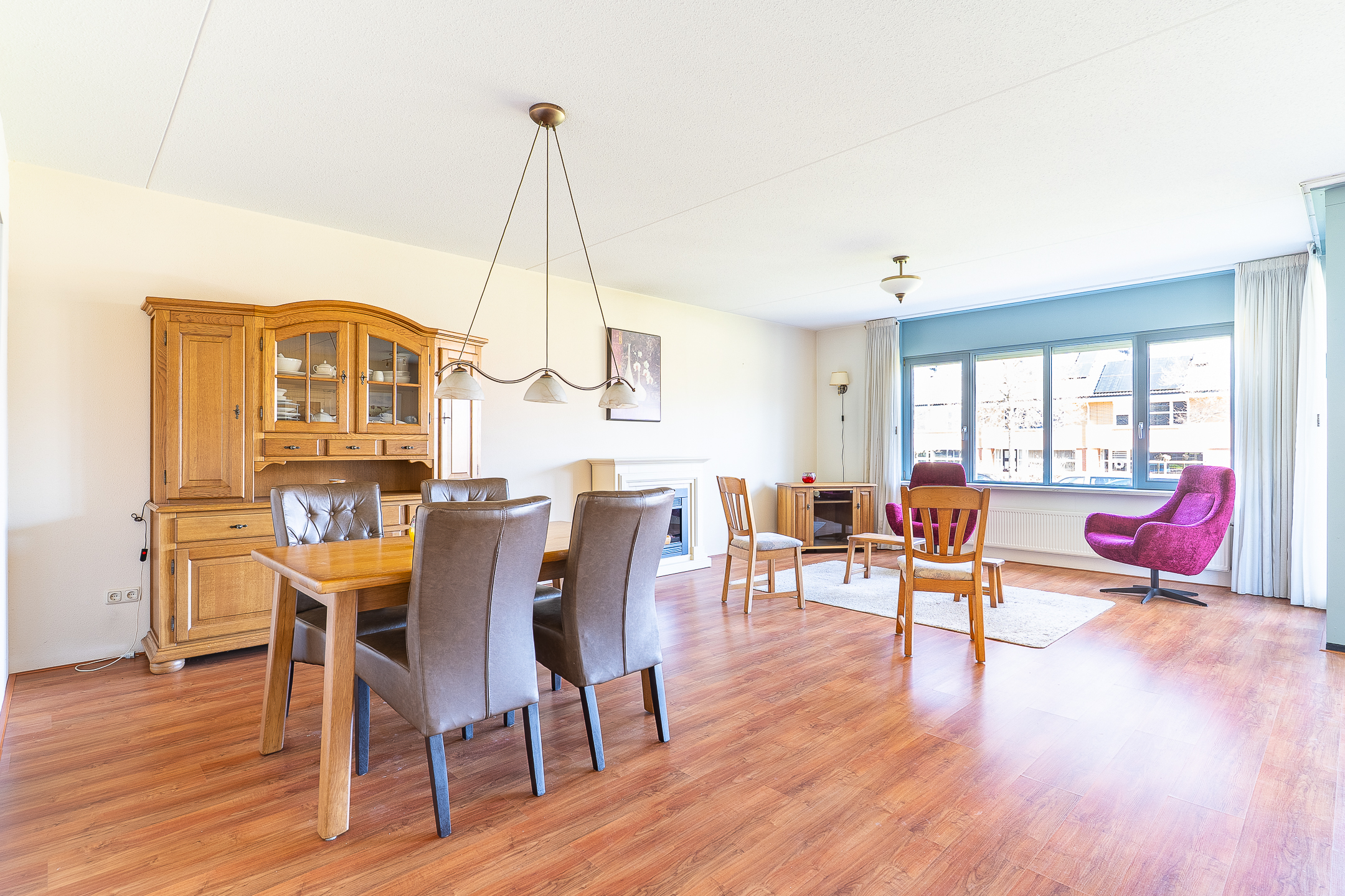 Aan het einde van de hal komt u in de ruime woonkamer. Dankzij de grote raampartijen is dit een lichte en aangename leefruimte met een vrij uitzicht. Er is voldoende plek voor zowel een comfortabel zitgedeelte als een royale eethoek.