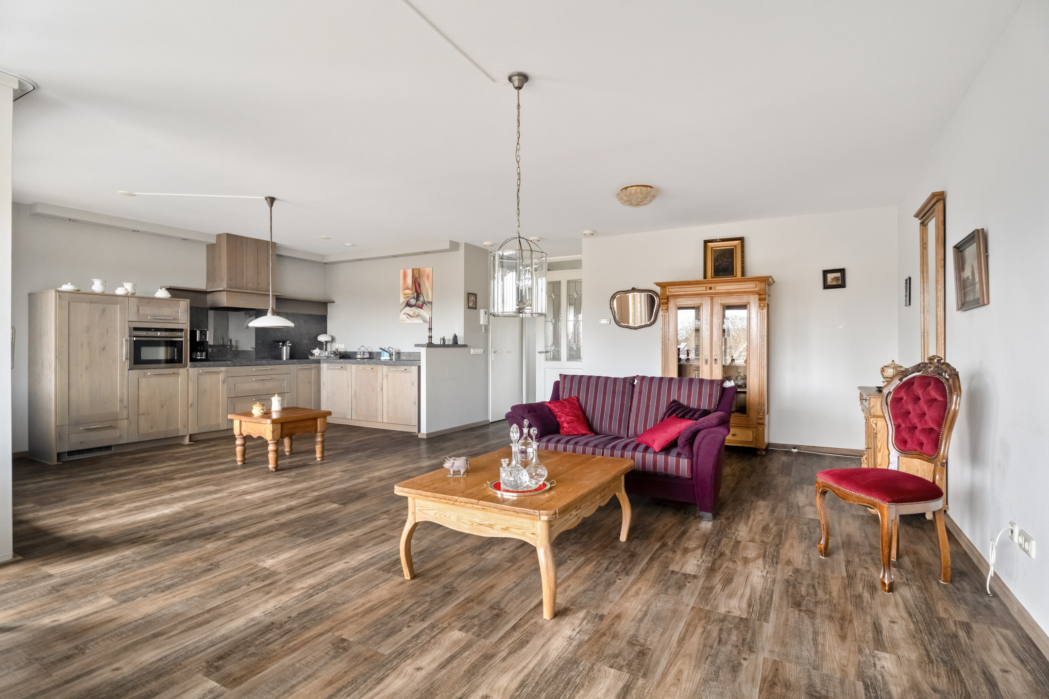 De open keuken sluit naadloos aan op de woonkamer en is uitgevoerd in een nette opstelling met diverse inbouwapparatuur en voldoende werk- en bergruimte.