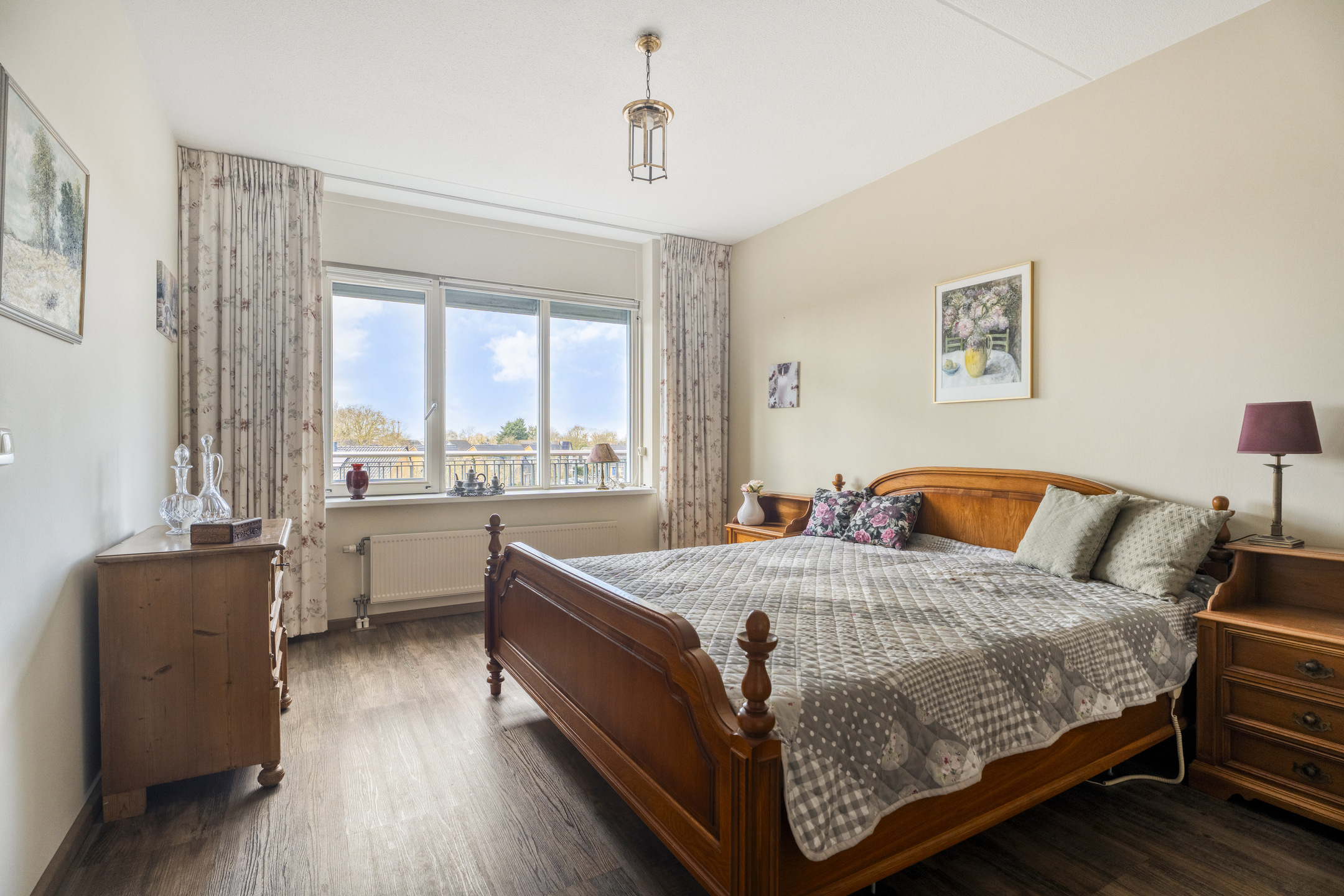 Aan de rechterzijde bevindt zich een ruime slaapkamer, die zich uitstekend leent als hoofdslaapkamer. Aan de andere zijde van de hal treft u de tweede slaapkamer, ideaal als logeerkamer, hobbyruimte of werkkamer.