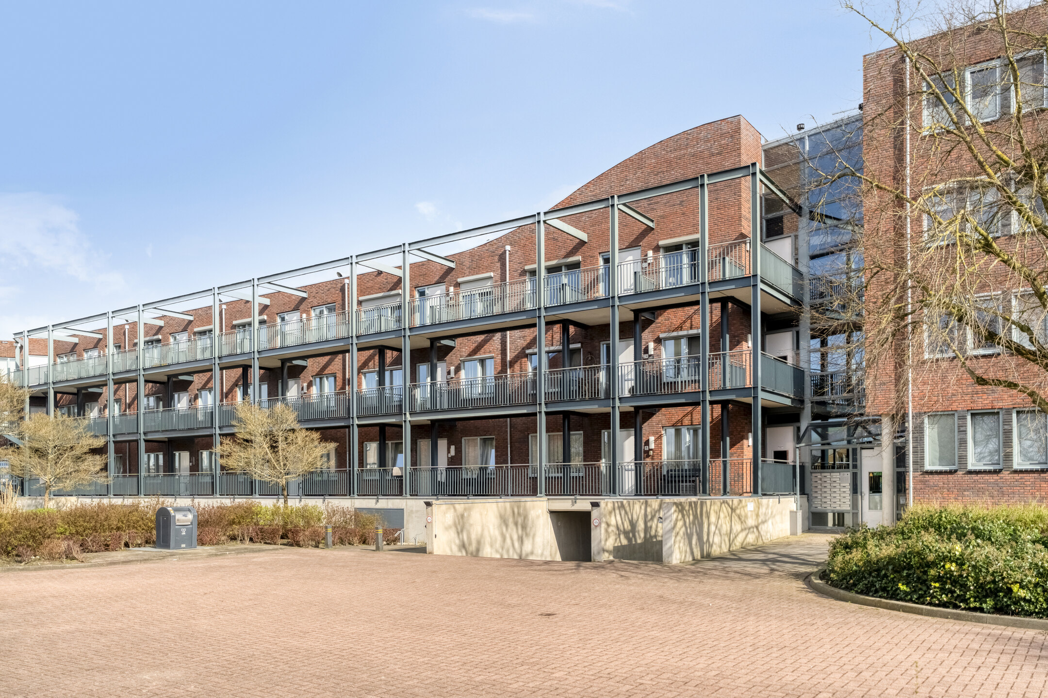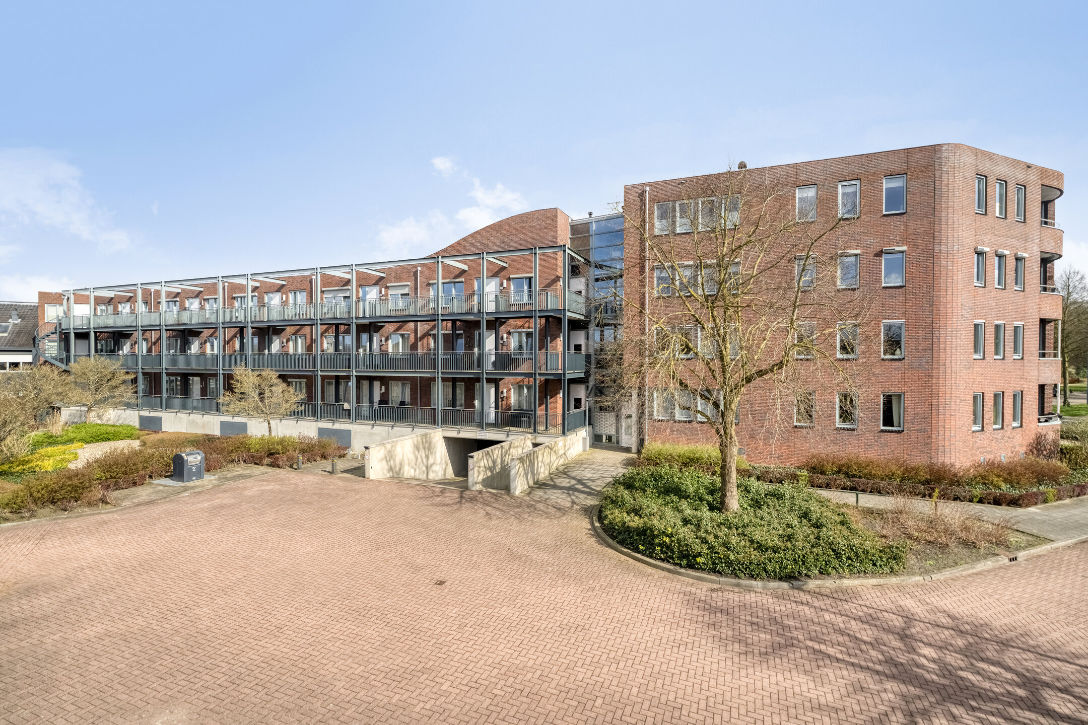Via de centrale entree met brievenbussen en intercominstallatie komt u het complex binnen. Vanuit hier heeft u toegang tot zowel de lift als het trappenhuis. Tevens bereikt u via de onderbouw de parkeerkelder met uw eigen parkeerplaats en de privéberging.