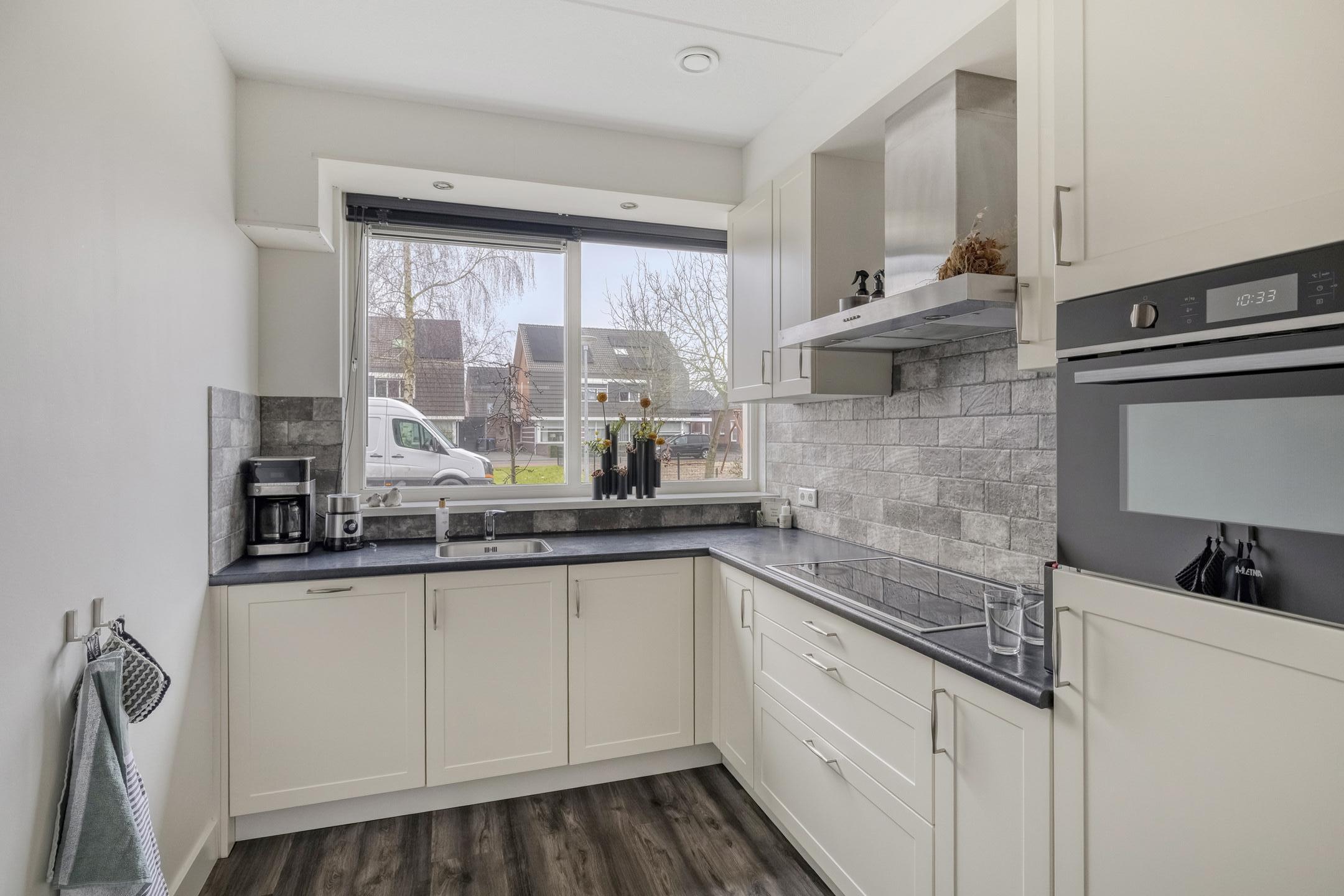Via de verzorgde voortuin kom je binnen in de hal met toilet, meterkast en trapopgang. Vanuit hier loop je door naar de woonkamer. De ruimte voelt licht en prettig aan, met aan de achterzijde plaats voor een comfortabel zitgedeelte en een royale eettafel. De open keuken bevindt zich aan de voorzijde en is praktisch ingericht met voldoende werk- en bergruimte. Tijdens zonnige dagen zet je de deur naar de tuin open en betrek je het terras moeiteloos bij het woongedeelte.