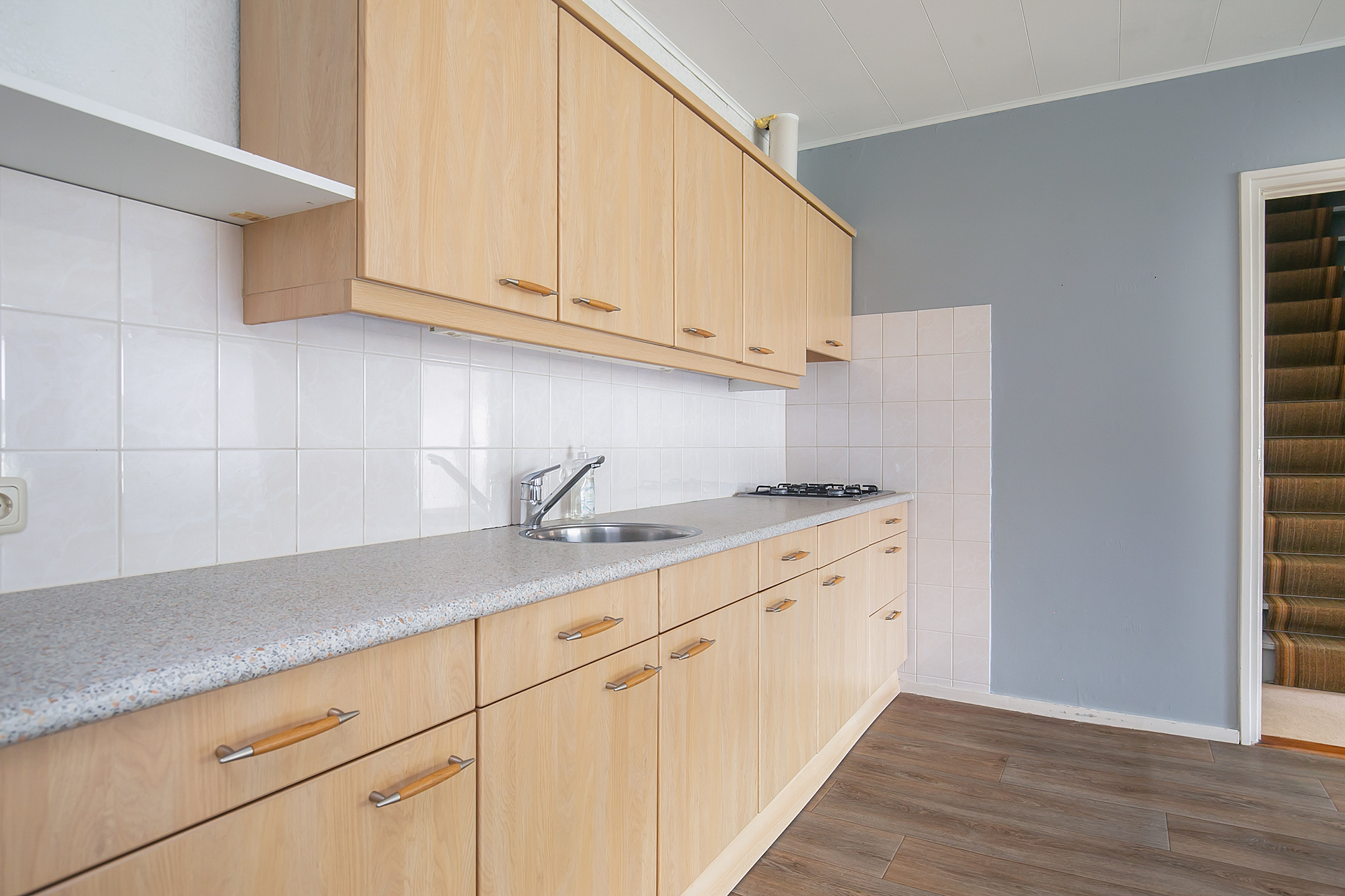 Aan de andere zijde van de woning is een tweede, modernere keuken aanwezig. Hier vindt u tevens de trapopgang naar de verdieping en toegang tot een slaapkamer op de begane grond. Aan de achterzijde is een compacte badkamer met toilet gesitueerd. De indeling biedt volop mogelijkheden om het geheel opnieuw vorm te geven en aan te passen aan hedendaagse woonwensen.