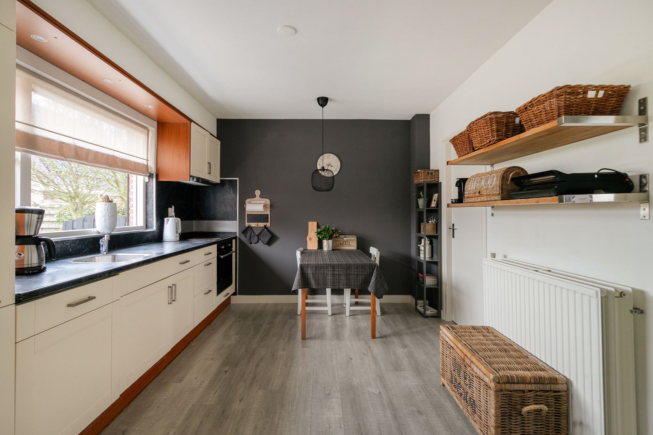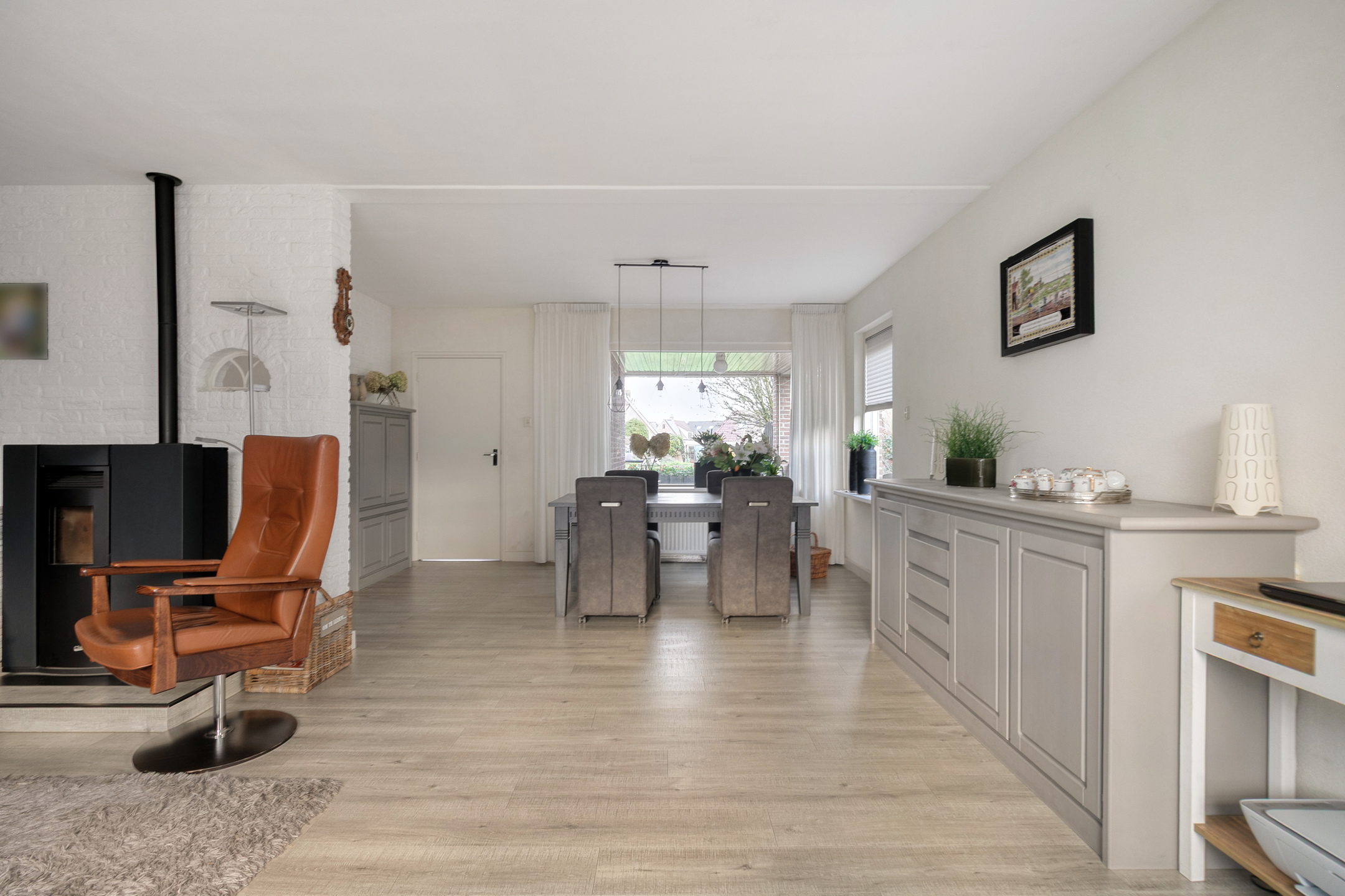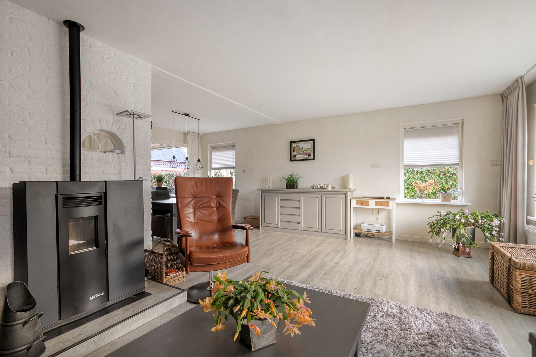 Via de overkapte entree kom je binnen in een ruime hal met trapopgang, meterkast en toiletruimte. Vanuit hier betreed je de royale L-vormige woonkamer, die is verdeeld in een sfeervolle zit- en eethoek. Dankzij de grote ramen en de gunstige ligging komt er veel daglicht naar binnen. Een gezellige pelletkachel (Dielle 2016) zorgt in de wintermaanden voor extra sfeer. De dichte keuken is royaal opgezet en voorzien van alle gemakken, met ruimte voor een eettafel en zicht op de tuin. Aansluitend bevindt zich een praktische bijkeuken, voorzien van extra kastruimte en toegang tot het terras onder de overkapping.