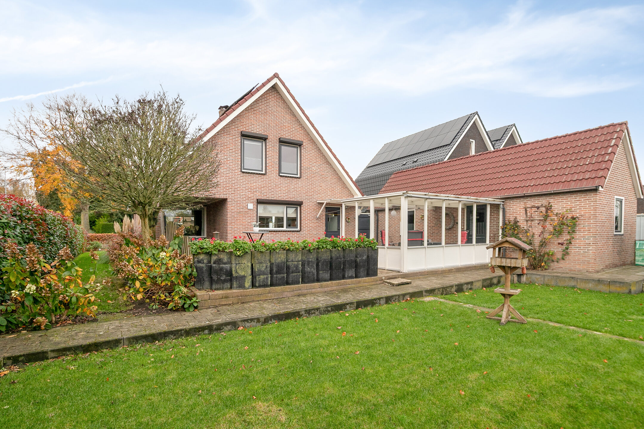 De fraai aangelegde tuin biedt volop privacy, ruimte om te genieten en is voorzien van een royaal terras. Achter op het perceel bevindt zich een vrijstaande garage met aangebouwde berging en een grote overkapping: ideaal voor hobby’s, opslag of om beschut buiten te zitten. En er is nog een overkapping aanwezig in de achtertuin, in elk seizoen kun je dus heerlijk buiten vertoeven. Ook is er een bron voor grondwater aanwezig, waarmee door middel van een pomp de tuin kan worden besproeid.