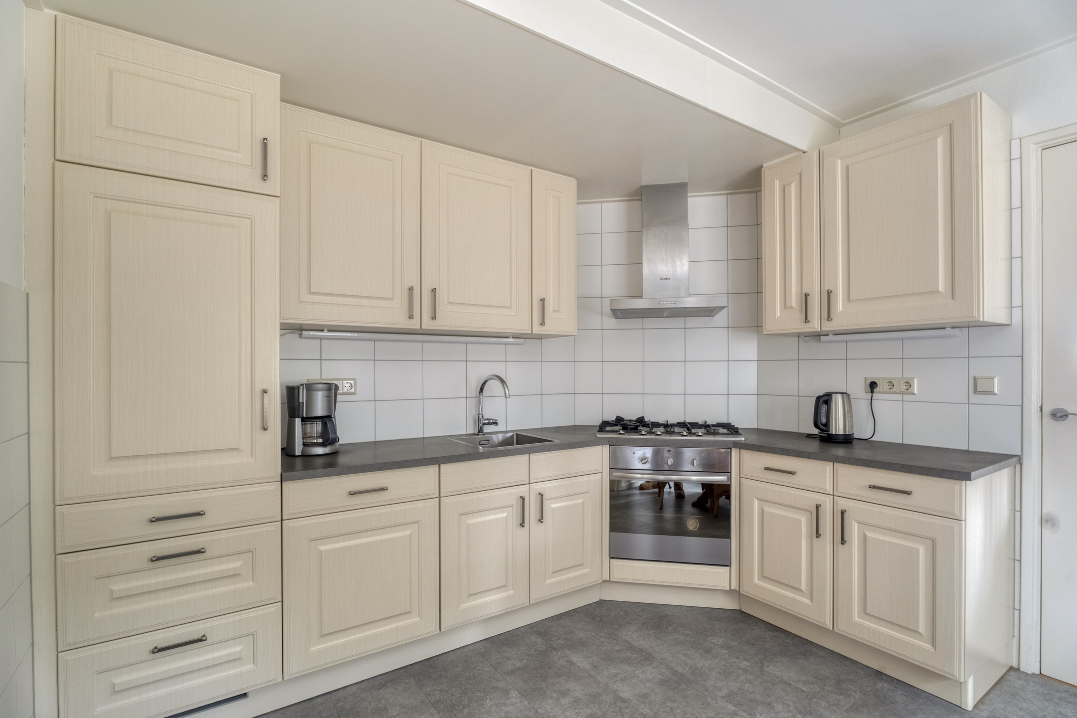 De woonkeuken is praktisch ingericht, is voorzien van een lichte hoekkeukenopstelling met diverse inbouwapparatuur en biedt voldoende werk- en bergruimte. Doordat er voldoende ruimte is voor een eettafel, kunt u hier gezellig samen de maaltijd gebruiken.
